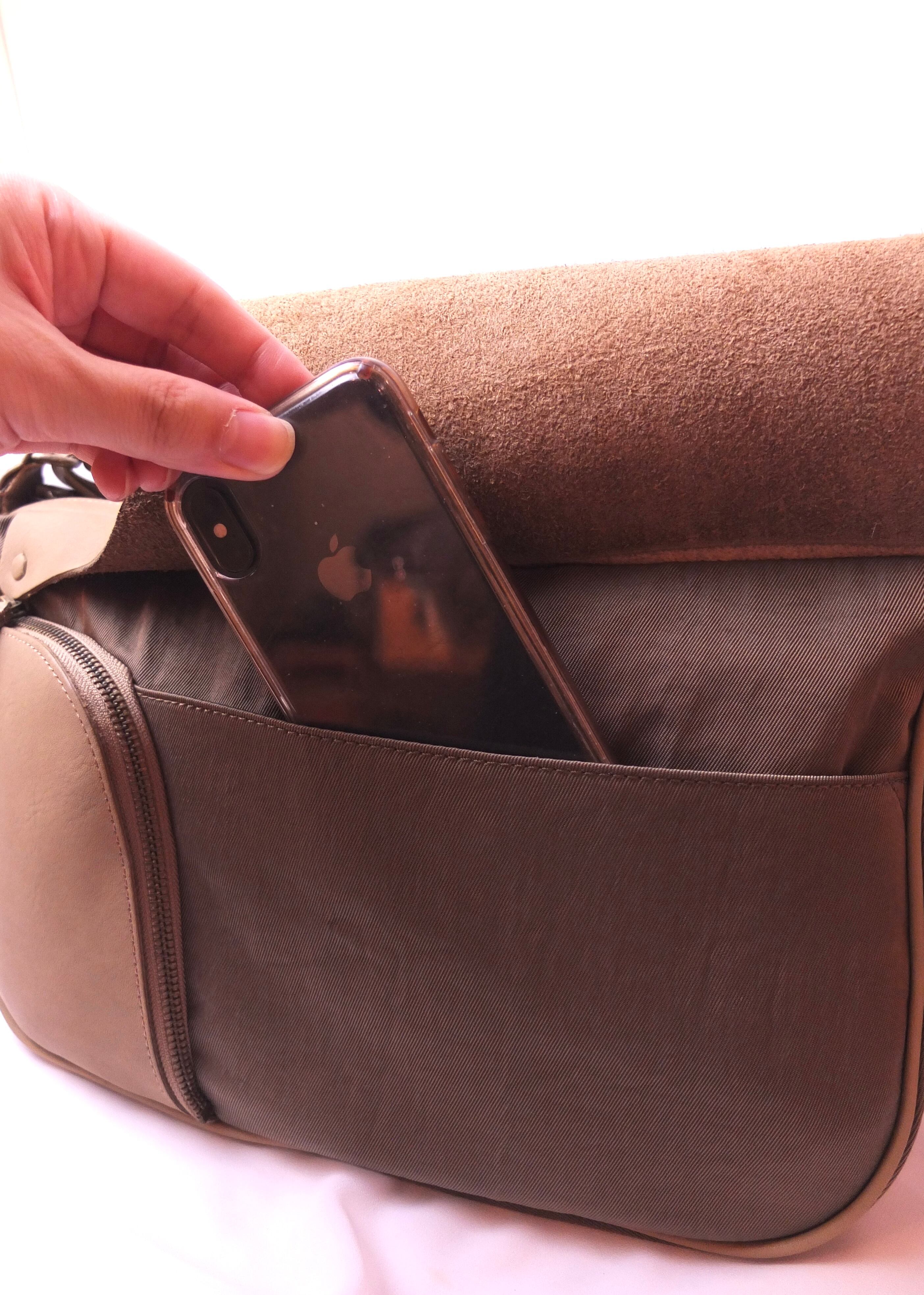 表側の革をめくると、薄マチのお財布であればぴったり入るマグネット付きポケットが。隣には小さいスマートフォンなら入れられるファスナー付きポケット。背中側にファスナーポケット1箇所、内側にファスナーポケット1箇所、ホック付きポケット1箇所、オープンポケット1箇所がございます。