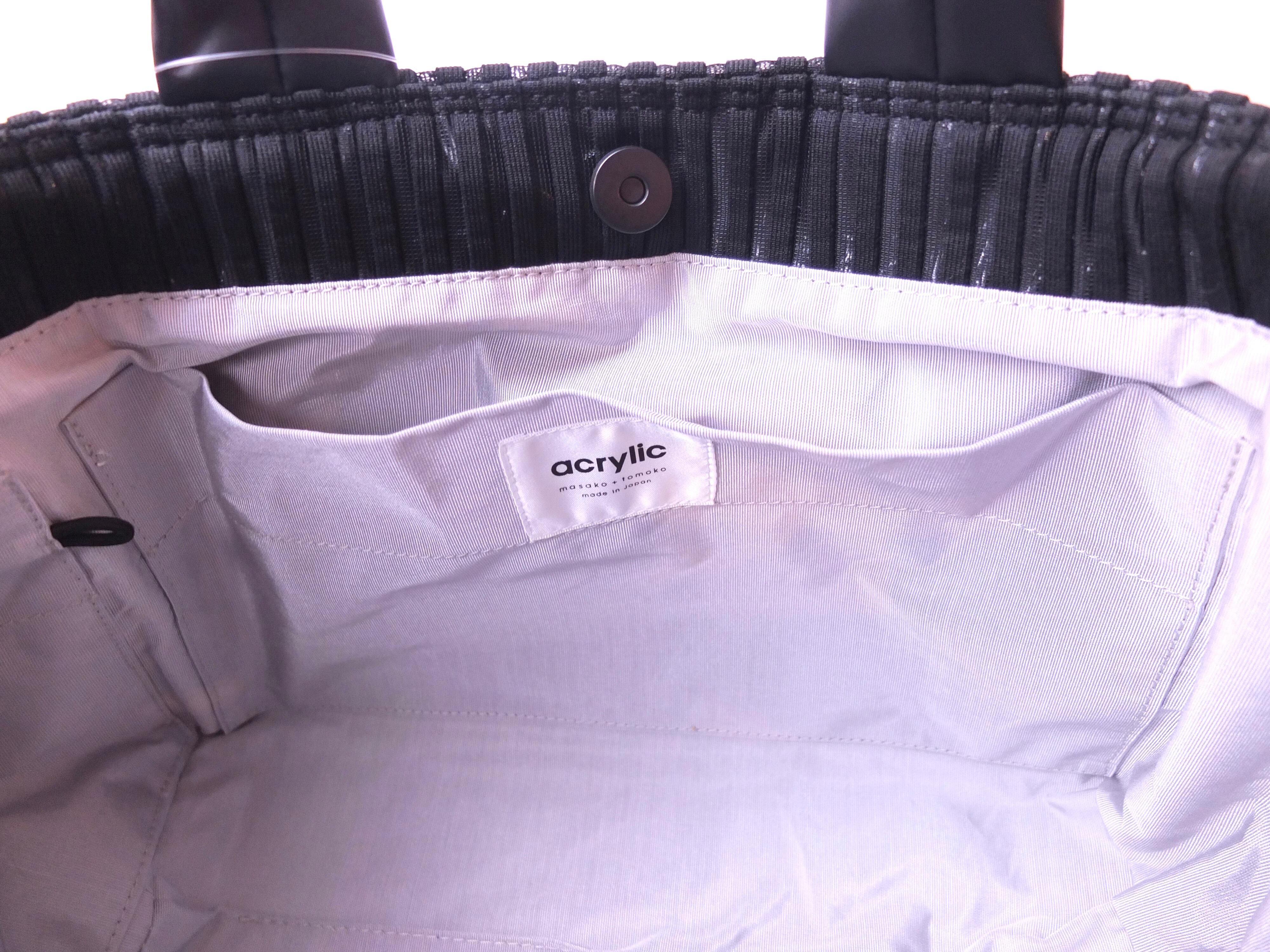 s bag 2wayは、acrylicの中でもマチが広く15cmあり、普段使いでお荷物が多い方におすすめのバッグです。持ち手が2つ付いており、手提げとワンショルダーバッグ2通りの使い方ができます。手提げで持った時はバッグの形が崩れず、ワンショルダーで持つ時は、くったりとした袋っぽい形になり、フィット感の良い持ち心地になります。ベルトは、acrylic定番の幅広く、握れるくらい柔らかい素材を使用。たくさんものを入れても、肩に負担がかからないようになっています。裏地の色を黒から見通しの良いシルバーグレーに変更。口元も表側と同じ生地にし、s bag 2way +にリューアルとなりました。