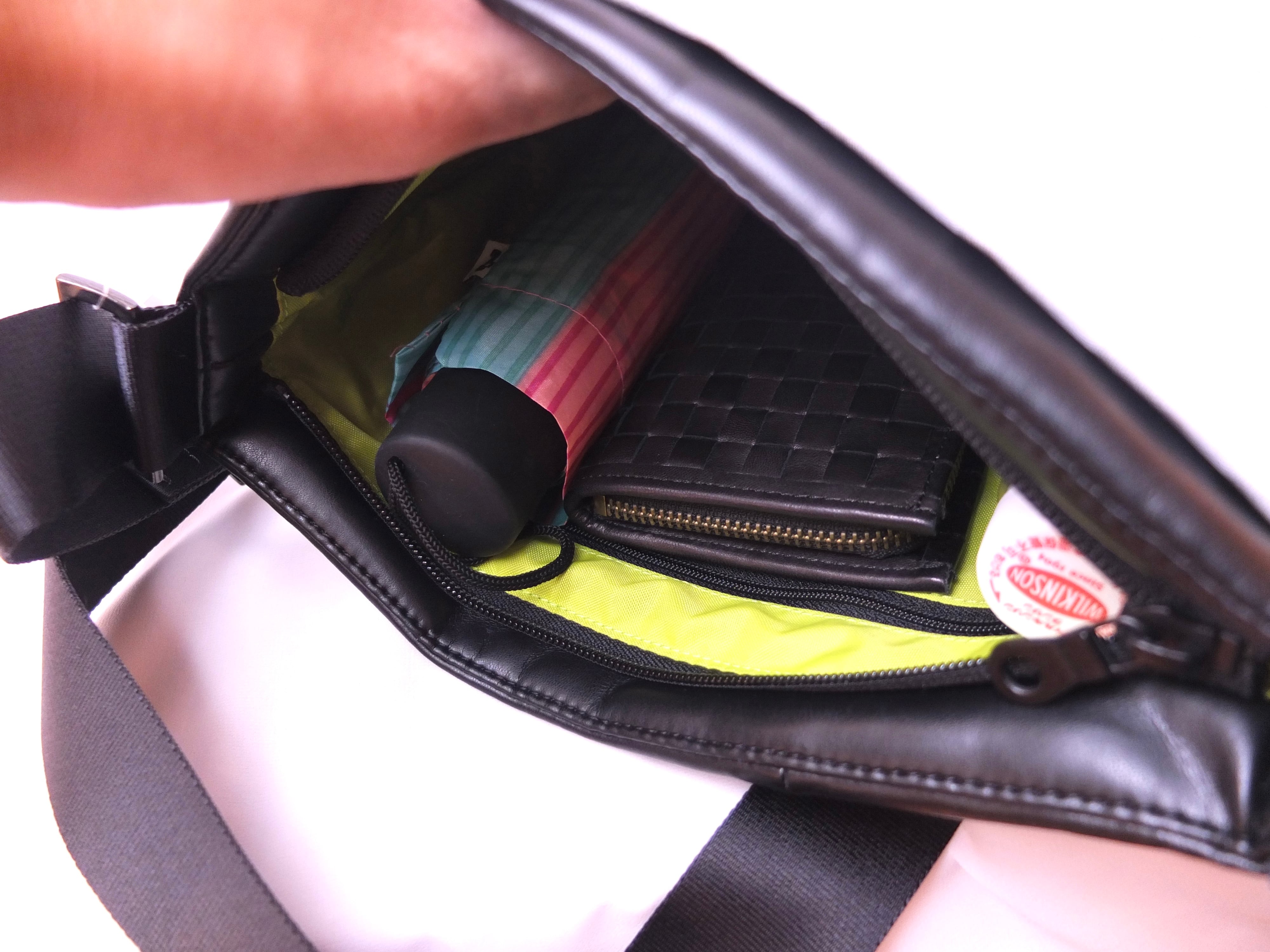 ポケットショルダーは、外側がすべてポケットになっているほどよいサイズ感で人気のシリーズ。アクリル製の黒い飾りボタンがアクセント。ファスナーを開けると内側は明るいライムグリーンでものが探しやすいです。さらに一か所のポケットはファスナー付きになっており、ナイロン製ショルダー紐(幅38mm)はアジャスター付きで長さ調節ができます。