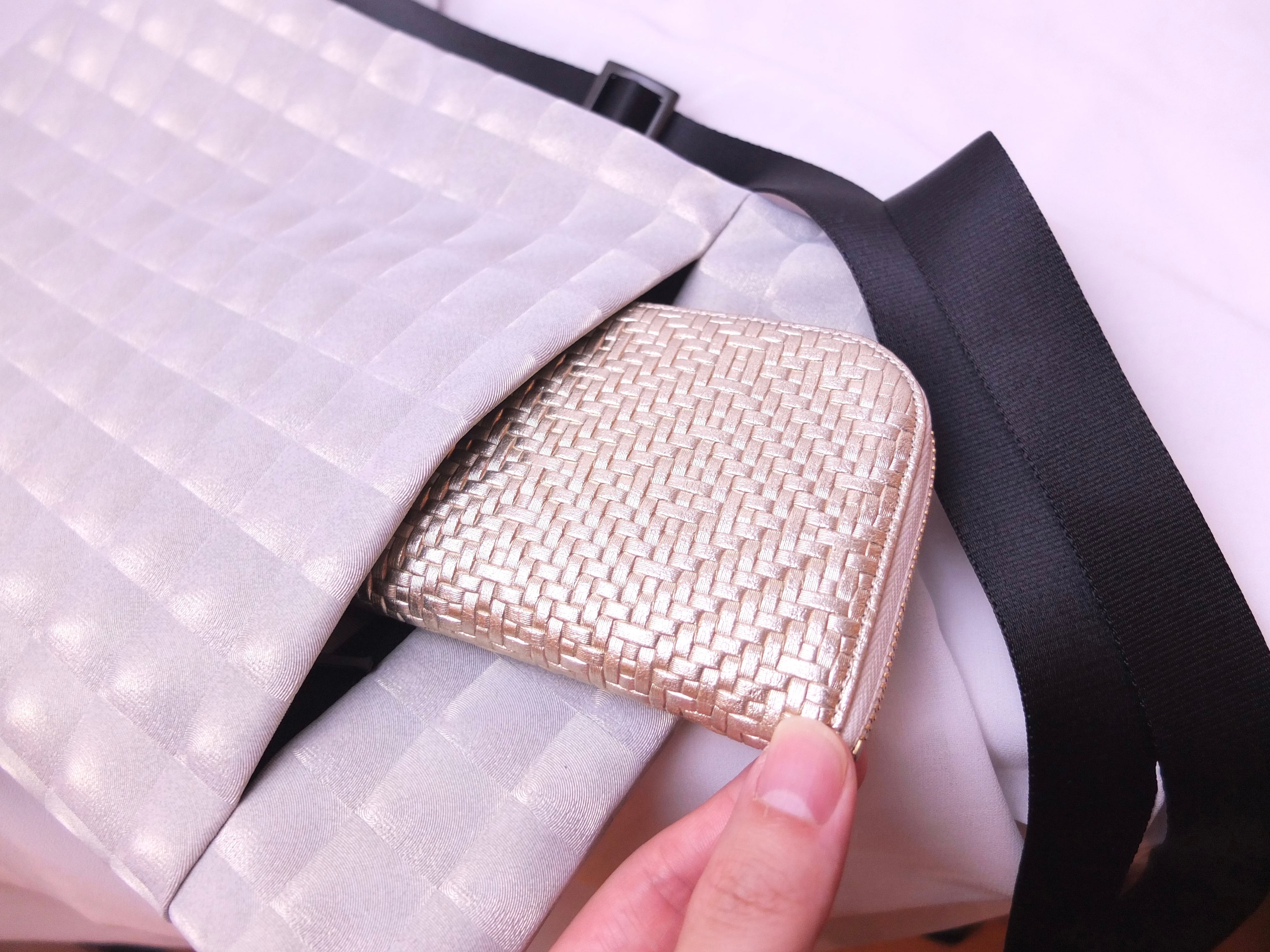 内側にオープンポケットが1つ、ファスナーポケットが1つ、外側にはファスナーポケットが1つあり、それぞれに長財布が収納できる大きさです。