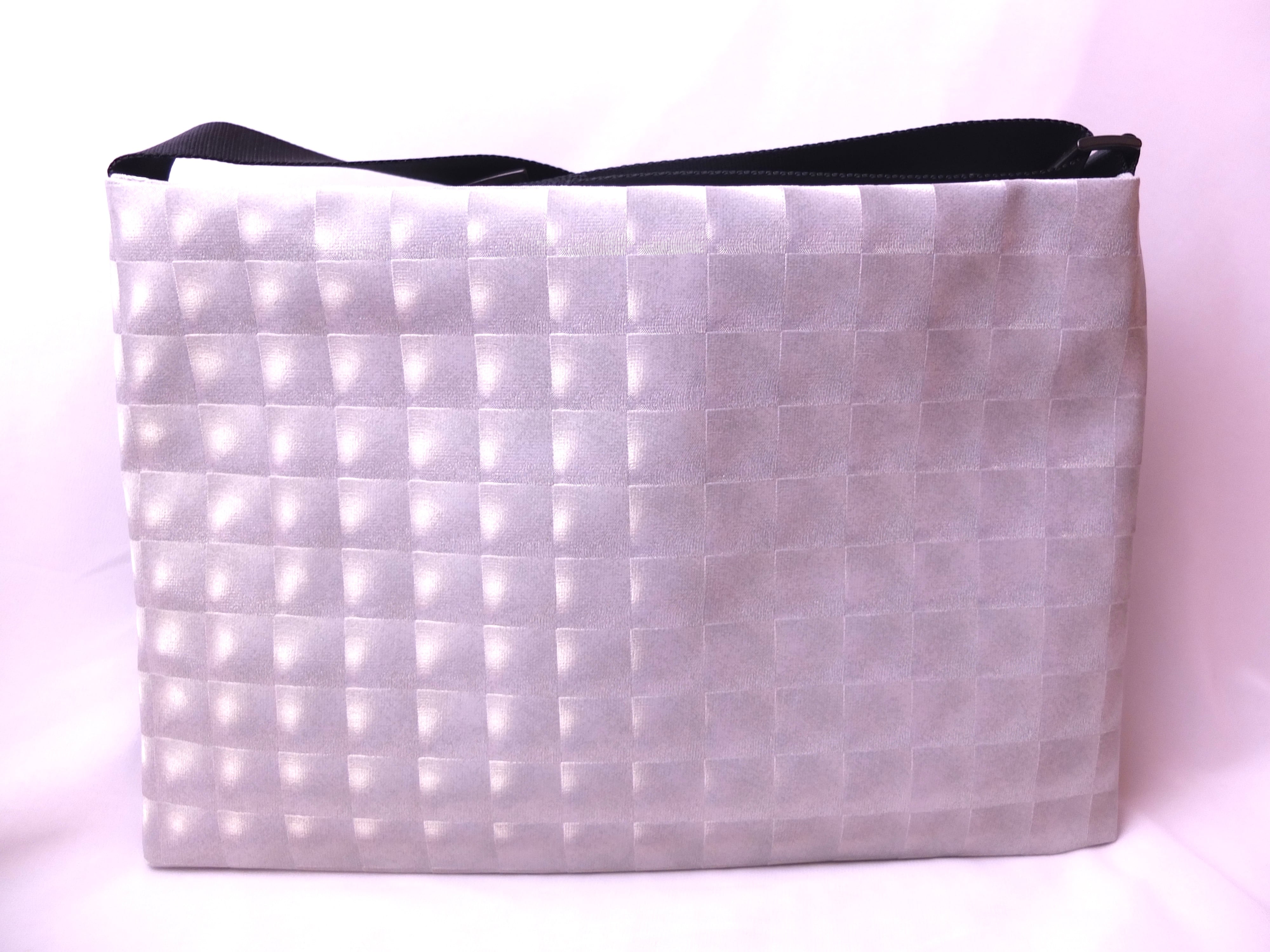 スッキリと薄マチで持つことも、底マチを広げてたっぷり持つこともできるショルダーバッグです。