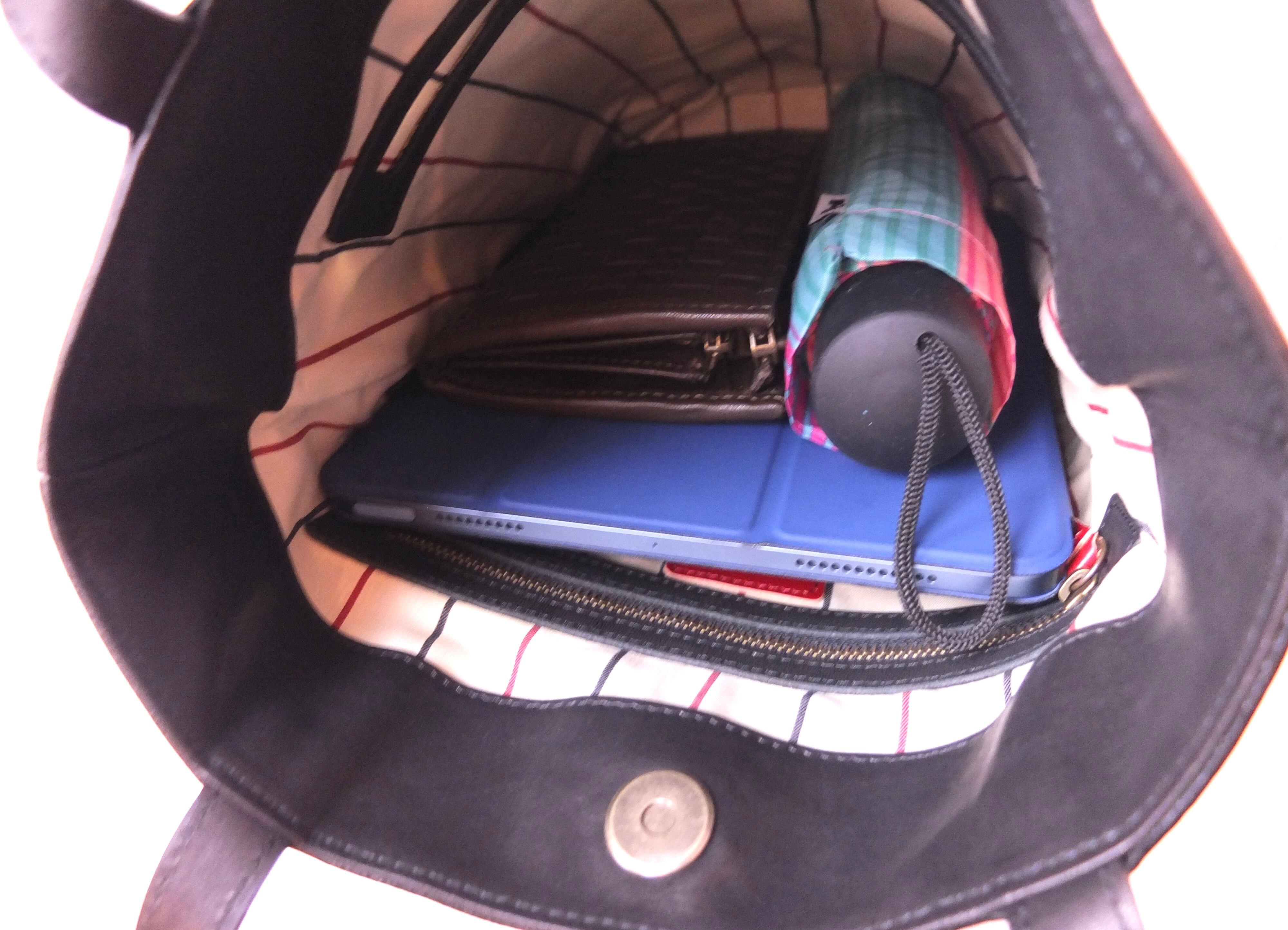 外にはスマートフォンが入る大きさのオープンポケットとファスナーポケットが1ヶ所、内装はホック付きポケットとファスナーポケットが1ヶ所づつございます。