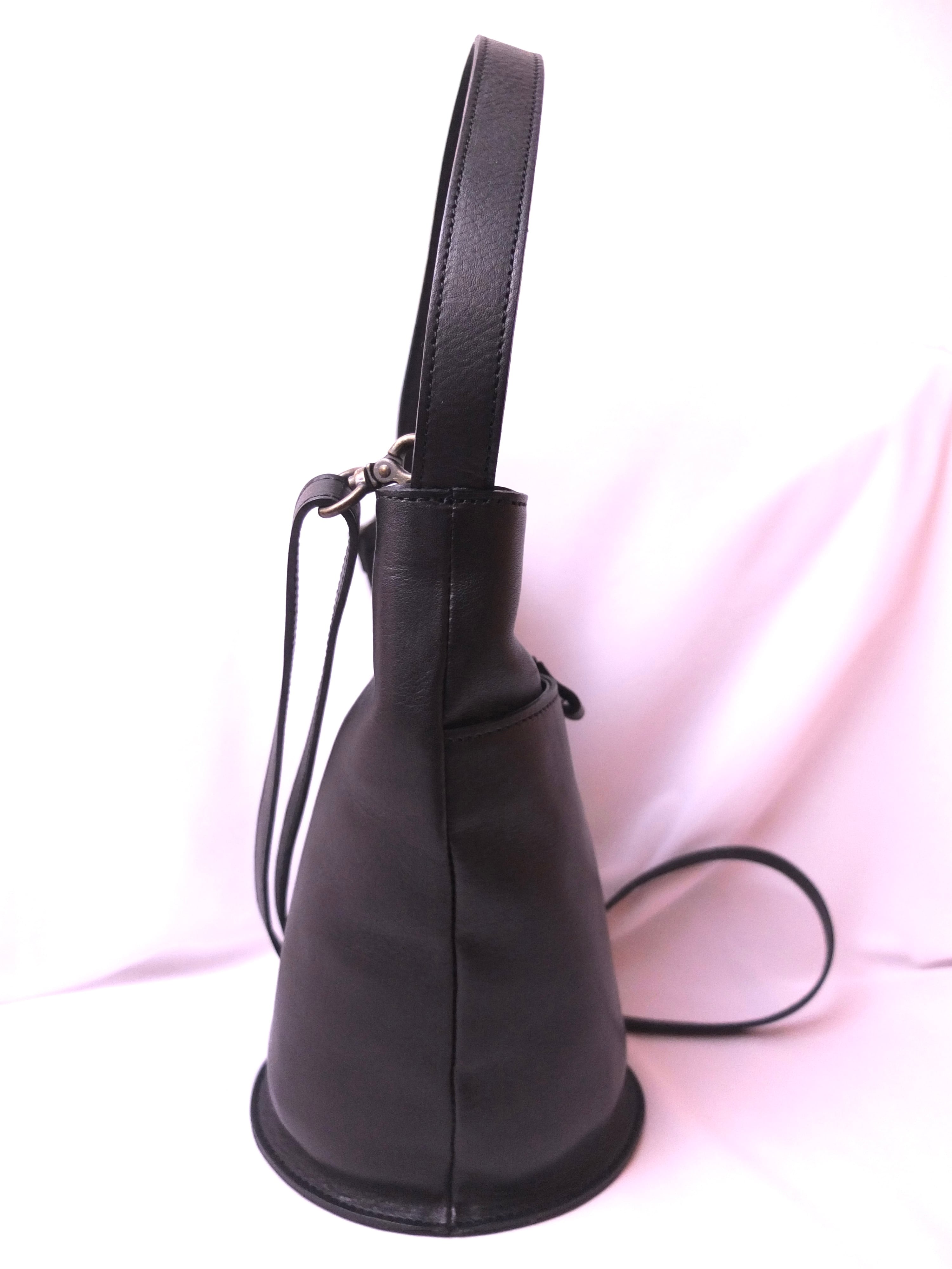 スマートなデザインのバケツ型バッグ。口は閉まらなくなりますが、ペットボトル、小さな折り畳み傘も収納可能です。コンパクトな見た目とは裏腹に収納力に優れております。ベルトを取り外して、手提げにもできます。