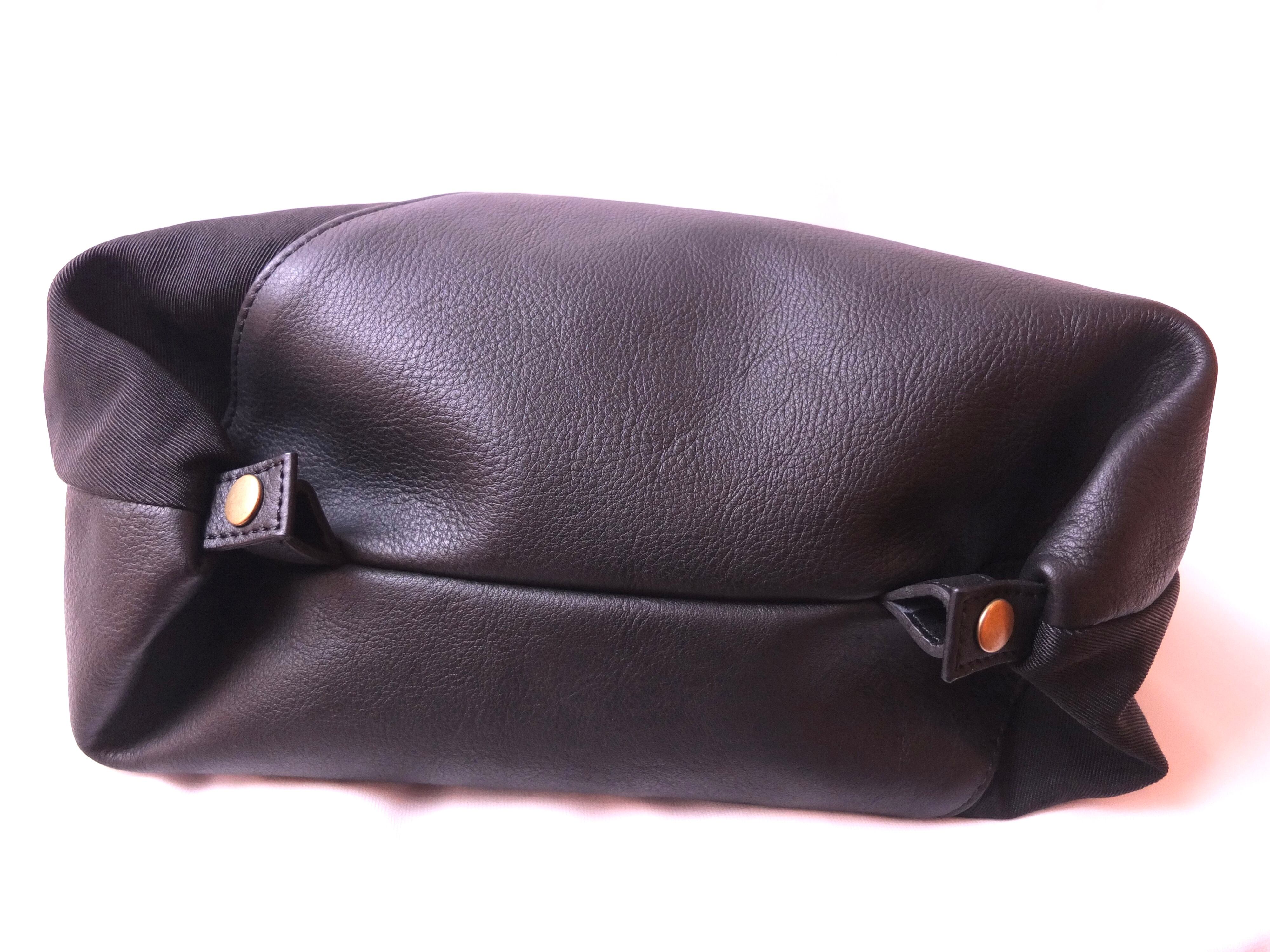軽さで人気の牛革ノヴァとB.stuffオリジナルのヘビーツイルナイロンを使用した軽快に持てるフラットな三角型のトートバッグ。