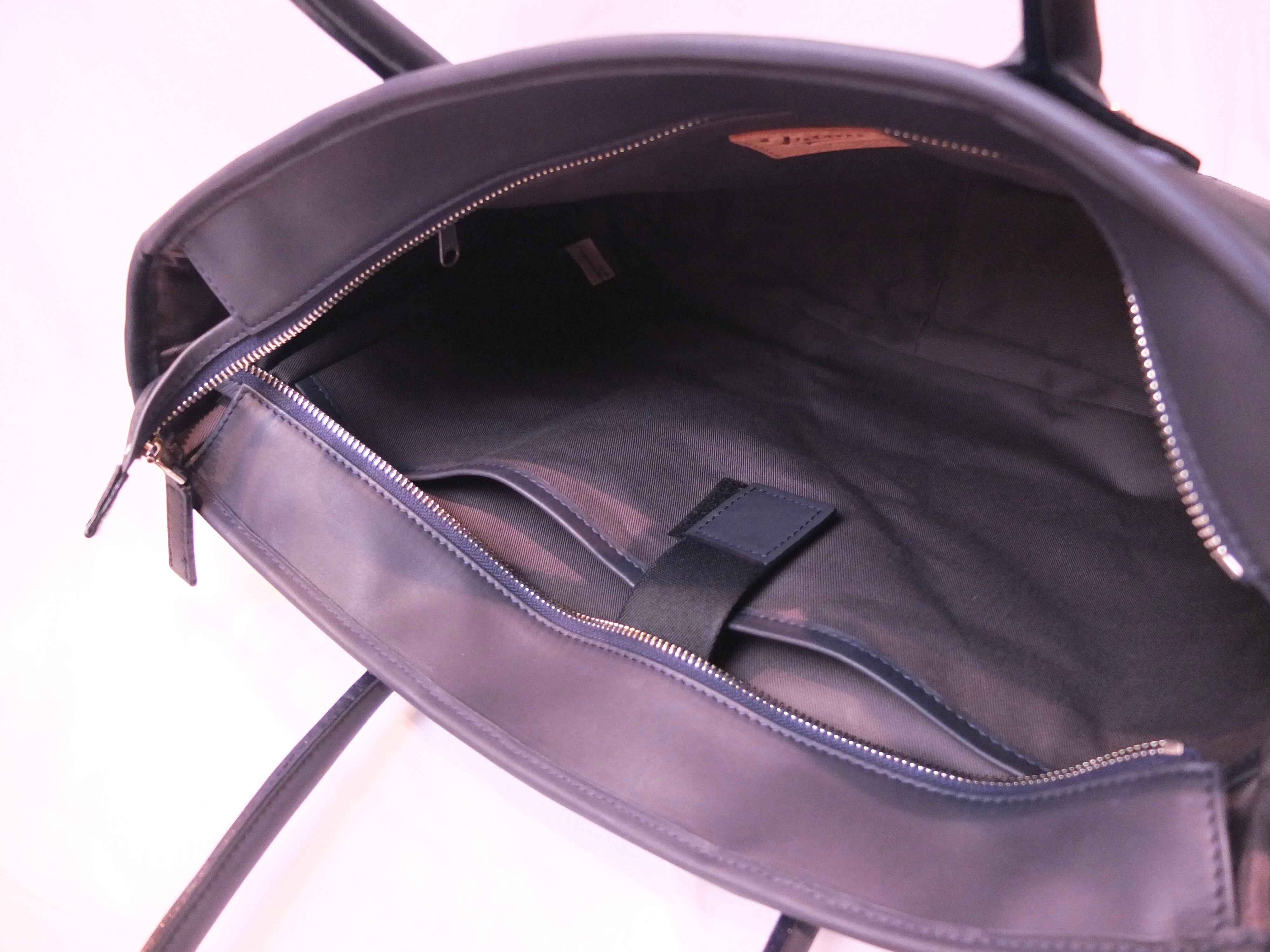 外ポケットにはスマートフォンなど入れられるサイズのオープンポケット。内装は16inchのノートPCが入る大きさ。13インチのノートPCが入るクッション付きのポケット(薄いPCなど機種により15inchも入ります)。ファスナーポケットがございます。