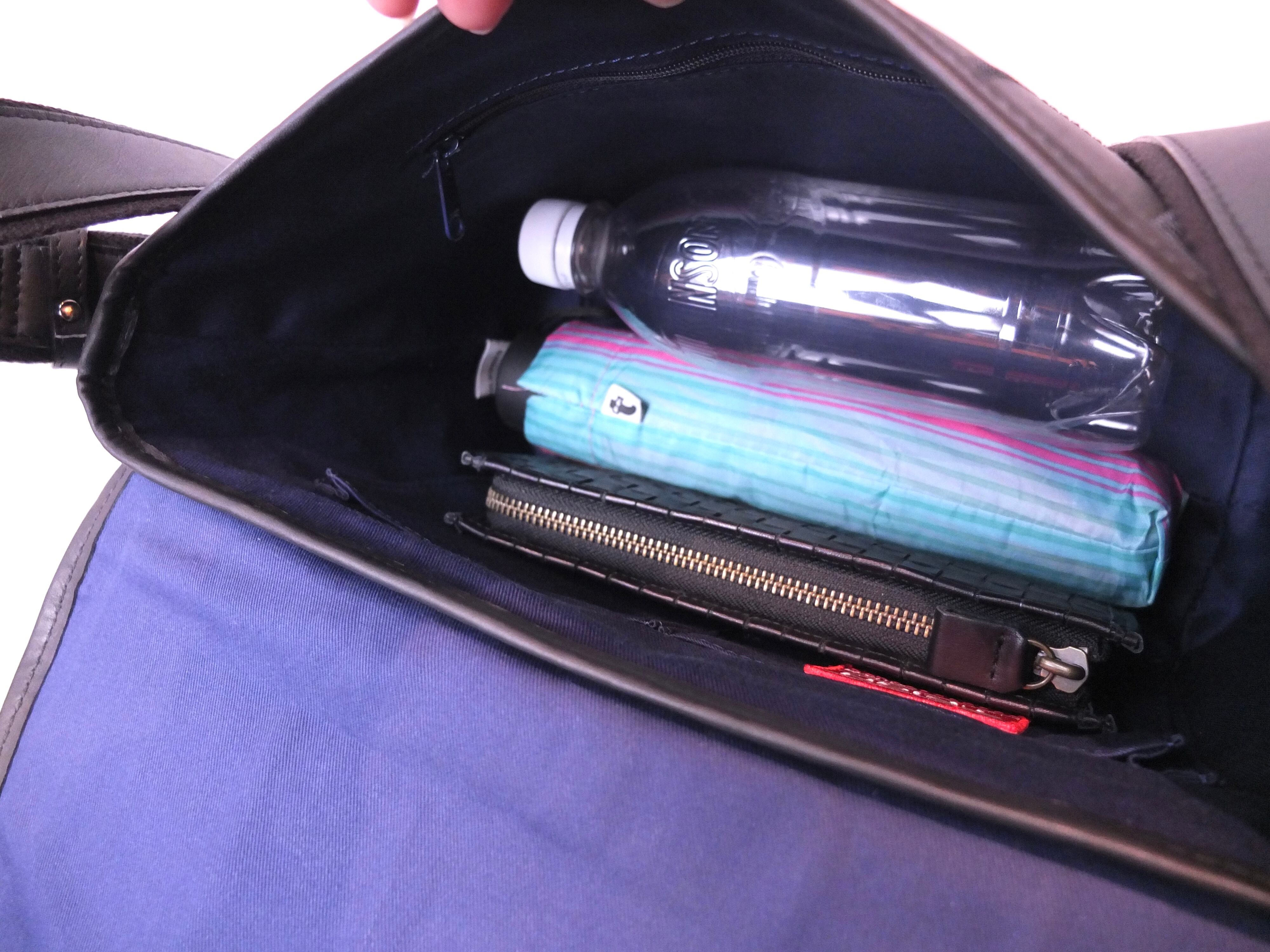 長財布、文庫本、500mlのペットボトル、折りたたみ傘などが余裕で入る収納力が魅力のショルダーバッグ。底マチが13cmと広めにとっているので、カメラやお弁当なども入れられます。普段使いから旅行の時にも便利なサイズ感です。