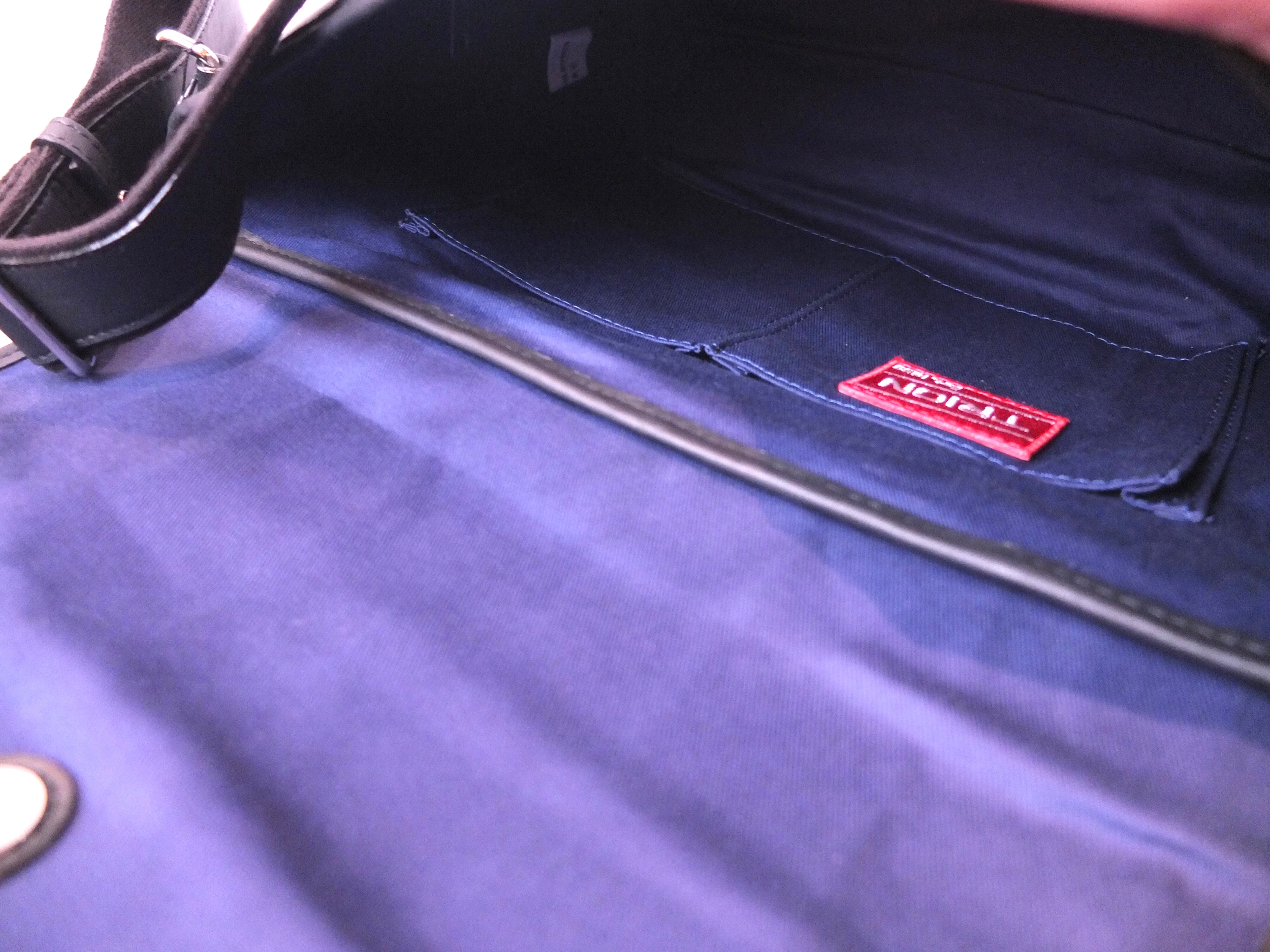 背面にはスマートフォンやパスケースなどが入る大きさのファスナーポケット。内装はマチ付きオープンポケット2ヶ所、ファスナーポケット1ヶ所がございます。