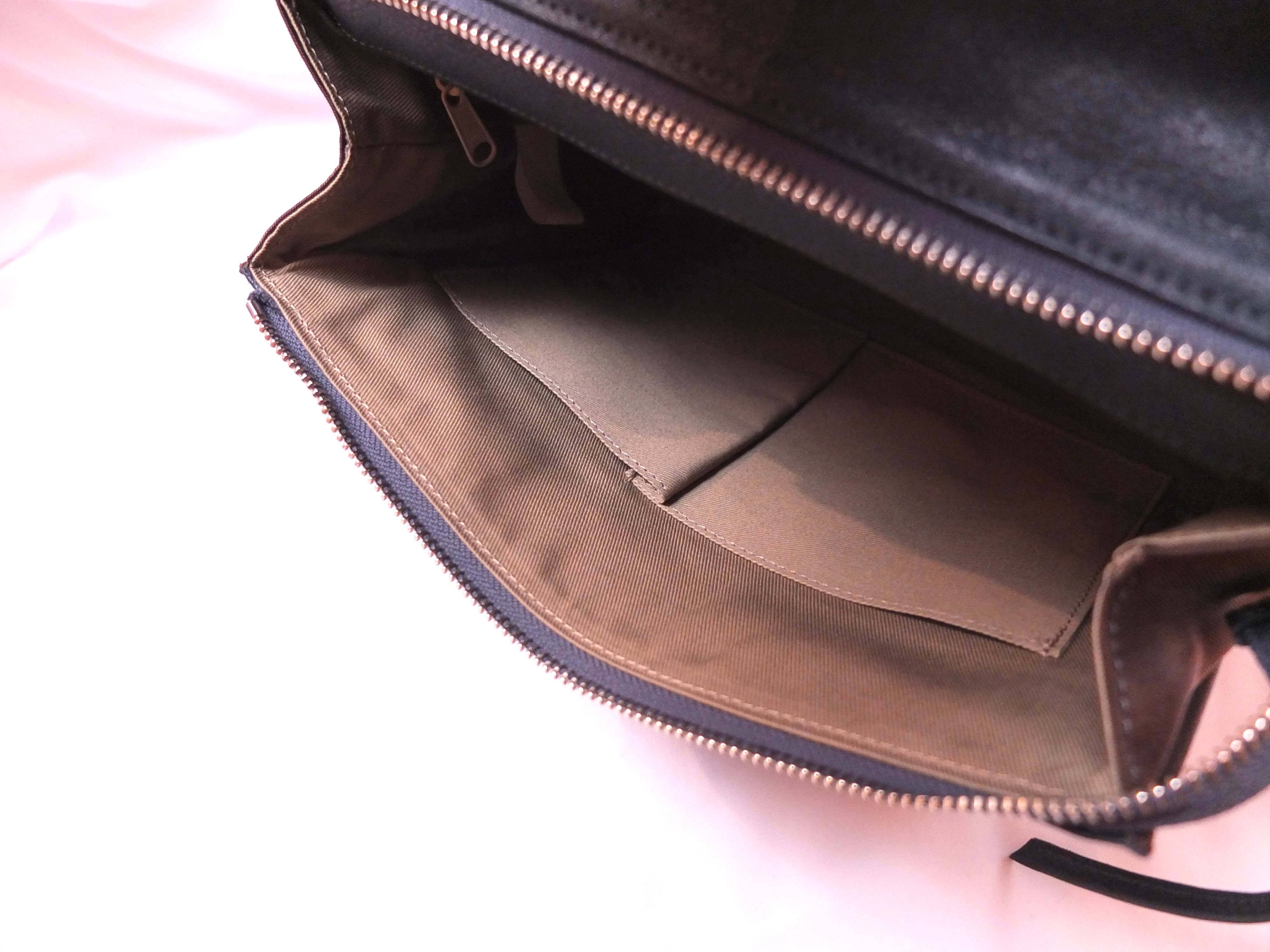 背面側にスマートフォンなど入る大きさのファスナーポケット1ヶ所、内装はオープンポケット2ヶ所とファスナーポケット1ヶ所がございます。