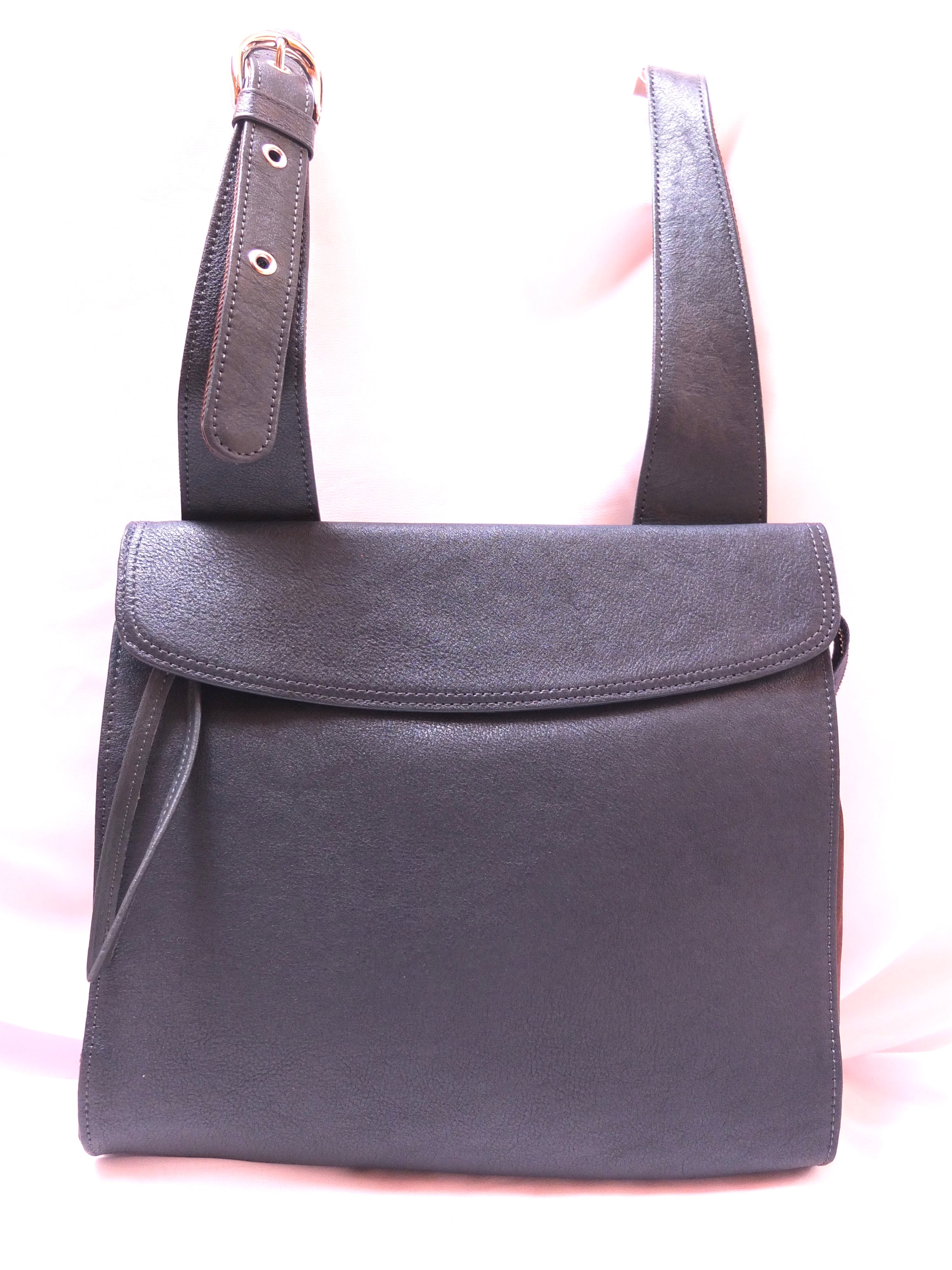 ベルトの長さは5段階調整が可能。本体の開閉部は浅いかぶせがついておりファスナー部分を隠してスッキリとした印象に。ファスナーはバッグの外側まで続いているので、開けた際に見通しが良くなっております。サイドのホックで固定することも可能です。