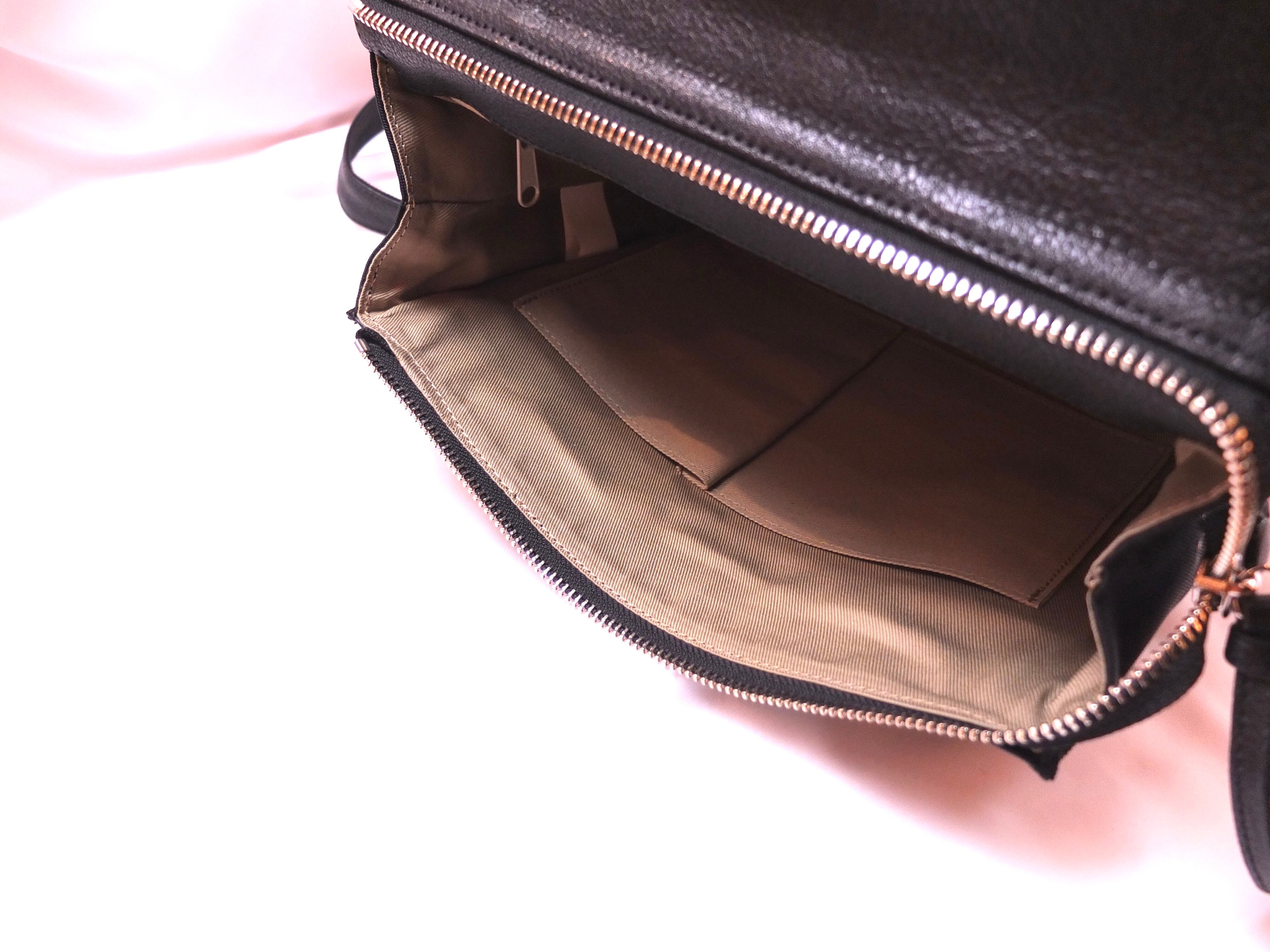 背面側にスマートフォンなど入る大きさのファスナーポケット1ヶ所、内装はオープンポケット2ヶ所とファスナーポケット1ヶ所がございます。