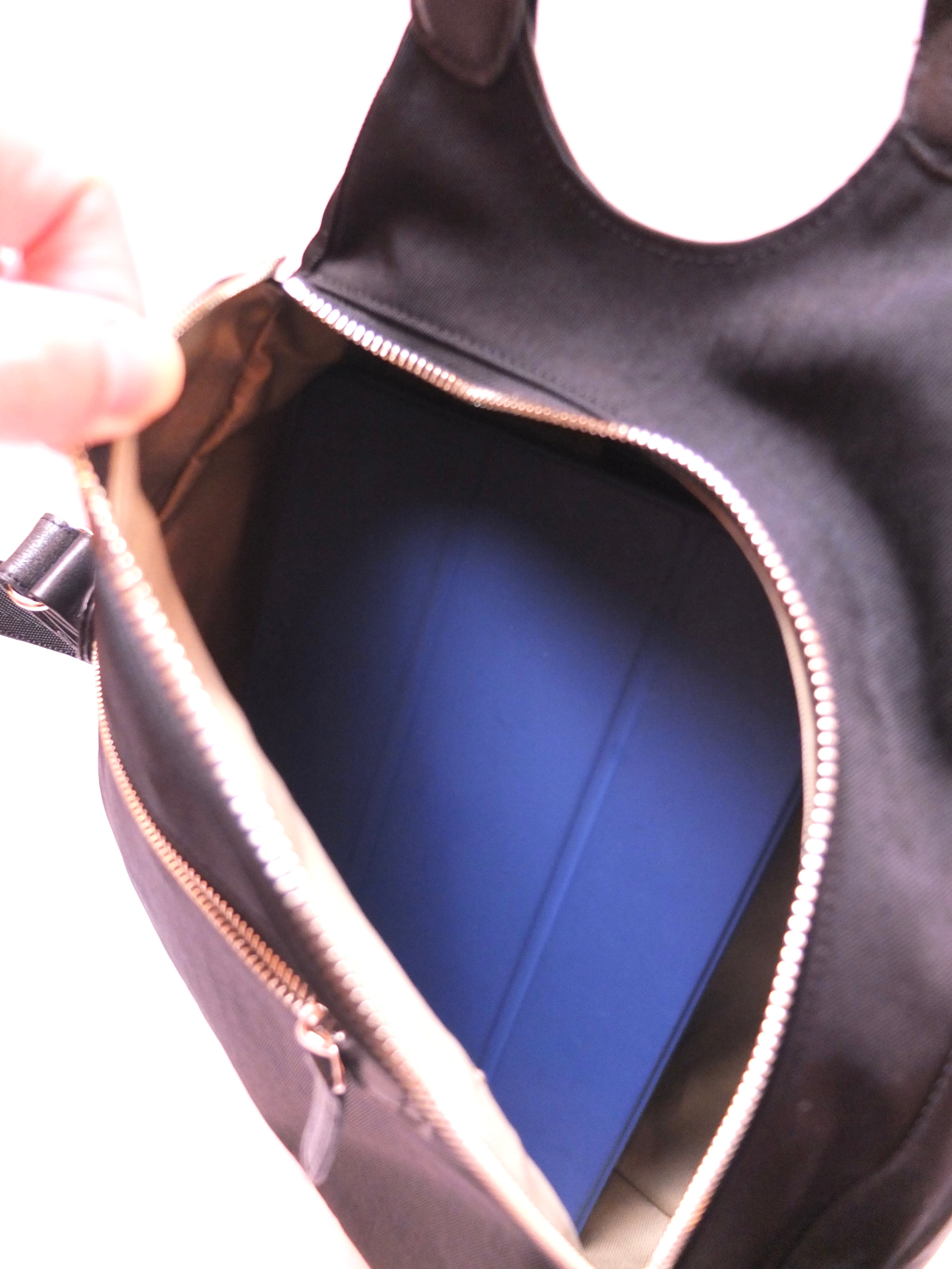 背面側にスマートフォンなど入る大きさのファスナーポケット1ヶ所、内装はオープンポケット2ヶ所とファスナーポケット1ヶ所がございます。