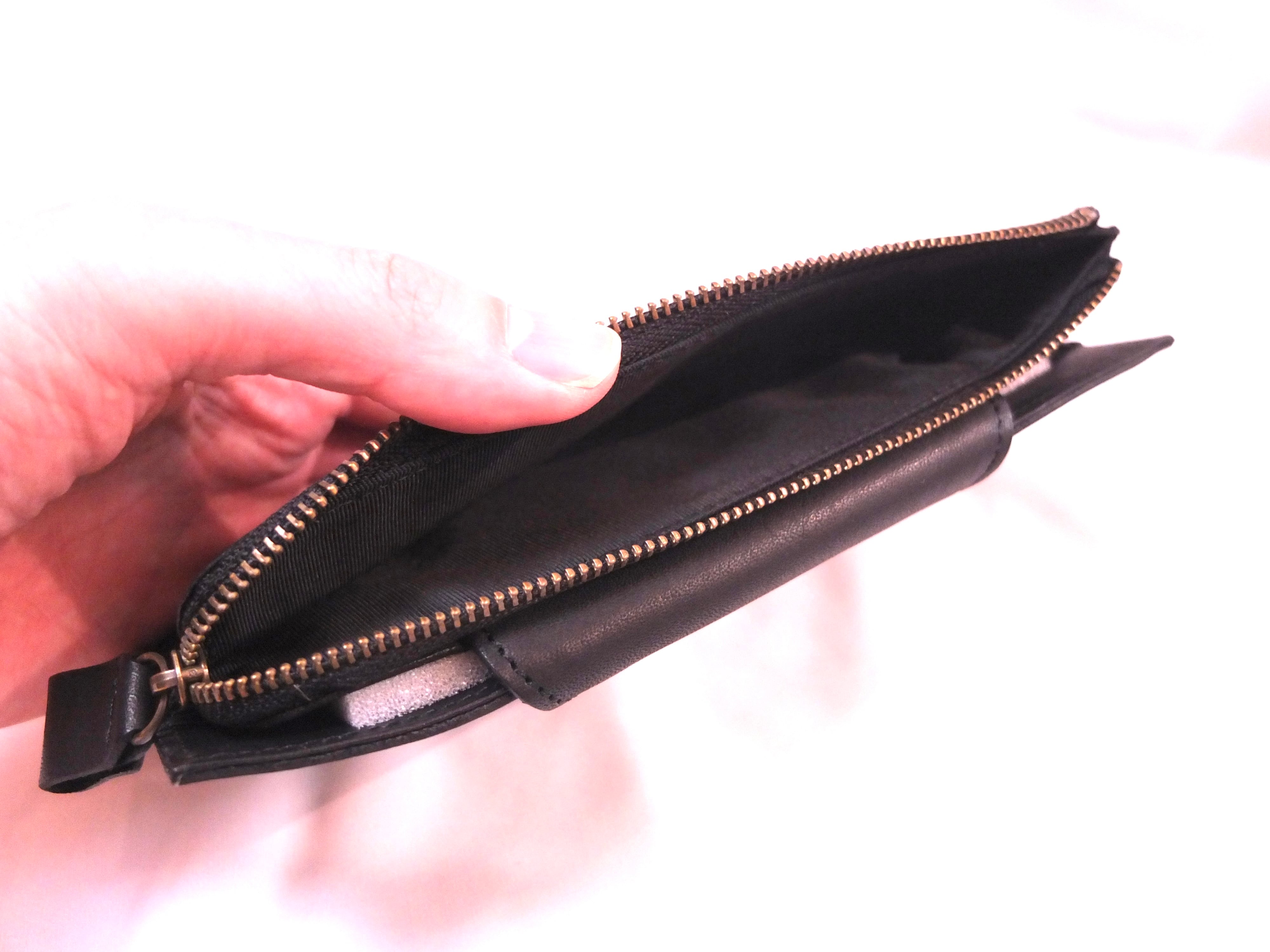 片側にマチを付けることで、従来の薄マチ財布よりも口開きが大きく取り出しやすいなっております。小銭部分も大きくファスナーが開き取り出しやすく、たっぷり入れることができます。