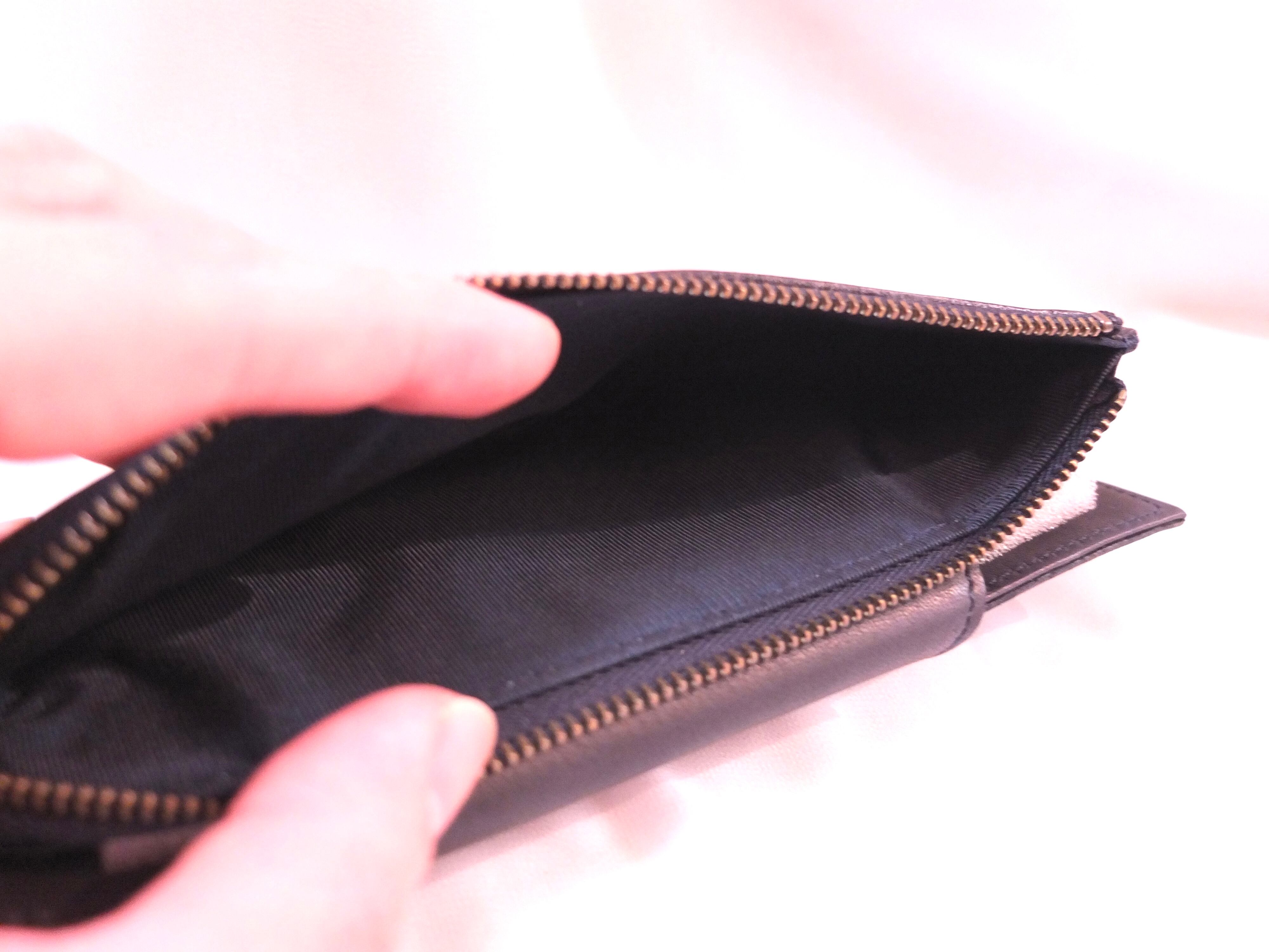 片側にマチを付けることで、従来の薄マチ財布よりも口開きが大きく取り出しやすくなっております。小銭部分も大きくファスナーが開き取り出しやすく、たっぷり入れることができます。カードポケットは4枚ございます。
