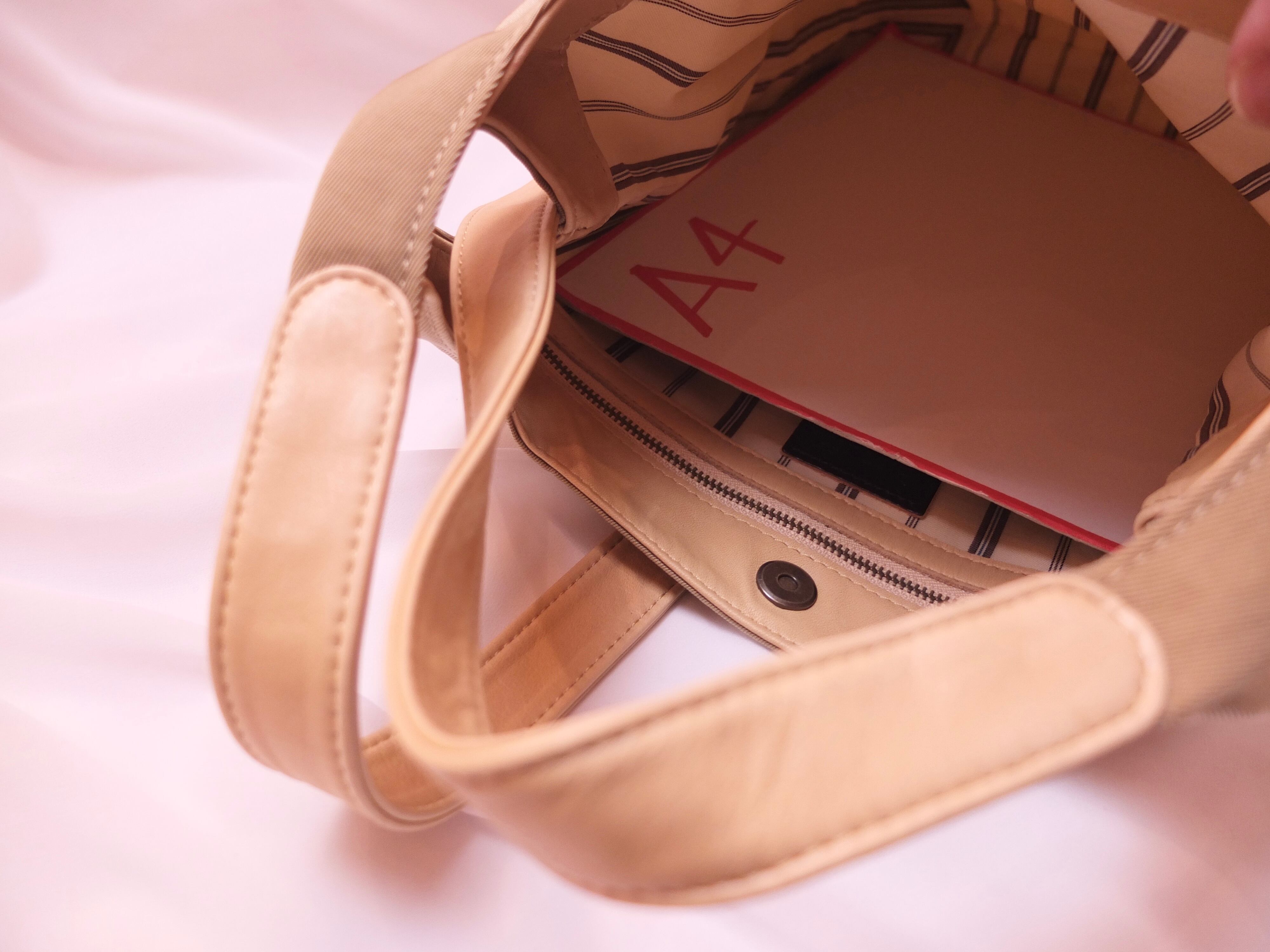 収納力もしっかりあり、iPadやB5サイズのノート、ペットボトルなどを入れてもまだまだゆとりがございます。トートバッグで持つ際にはA4サイズまで対応しております。