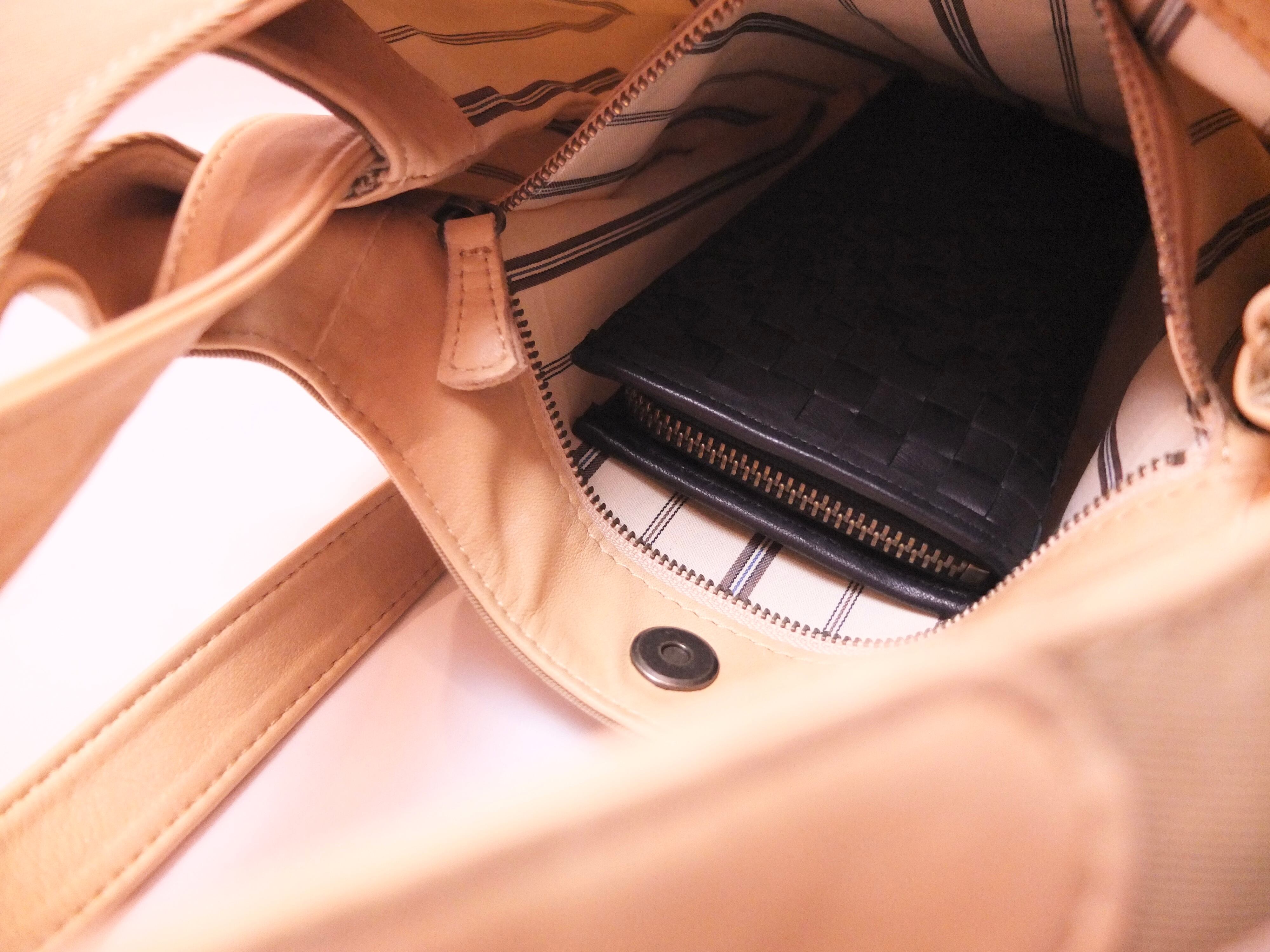 内側には長財布がゆとりを持って入れられるファスナーポケットが口元の取り出しやすい位置にございます。