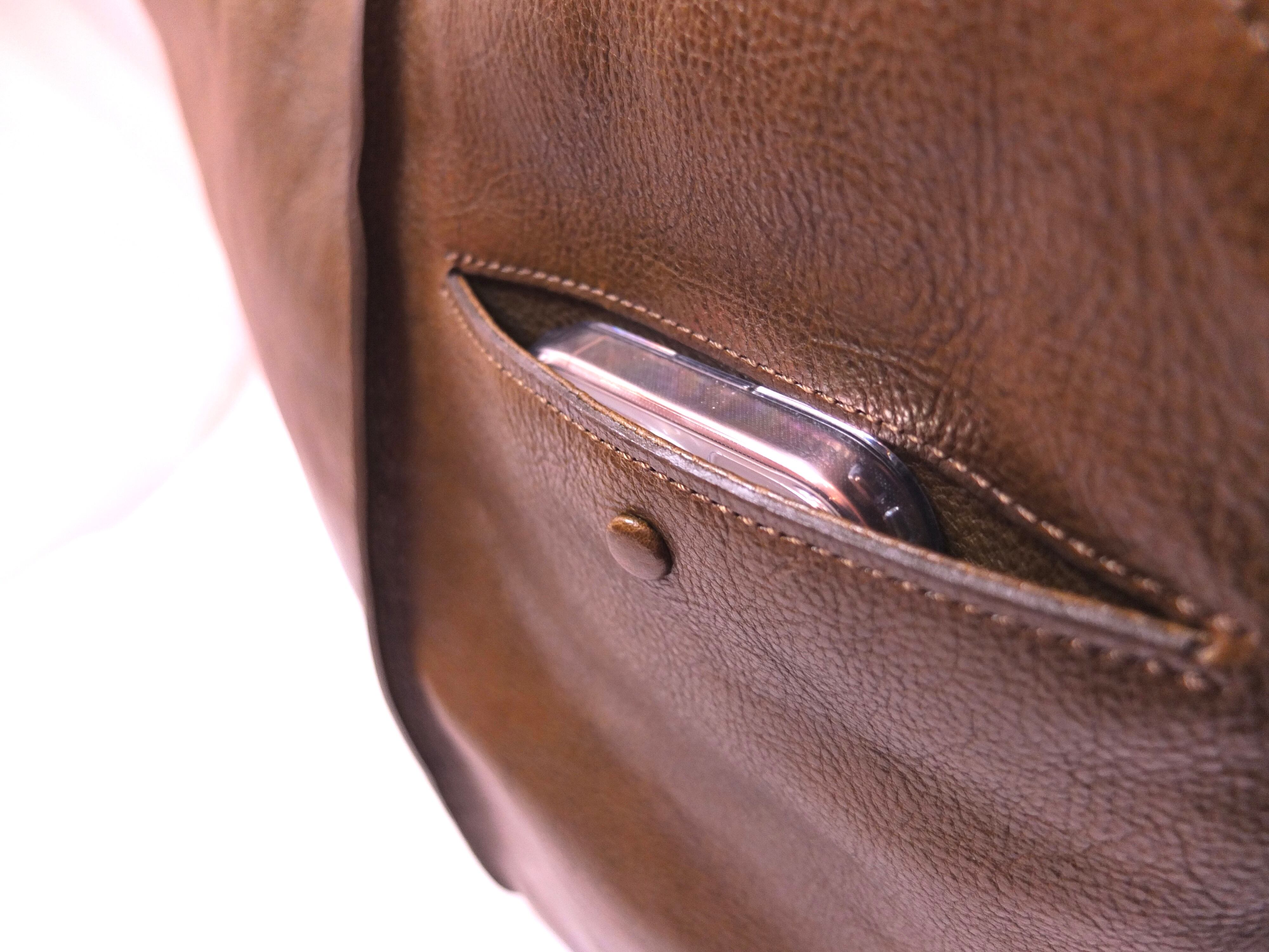 天マグネットや、外ポケットのホックを革巻きにし、金具が見えないようにしております。