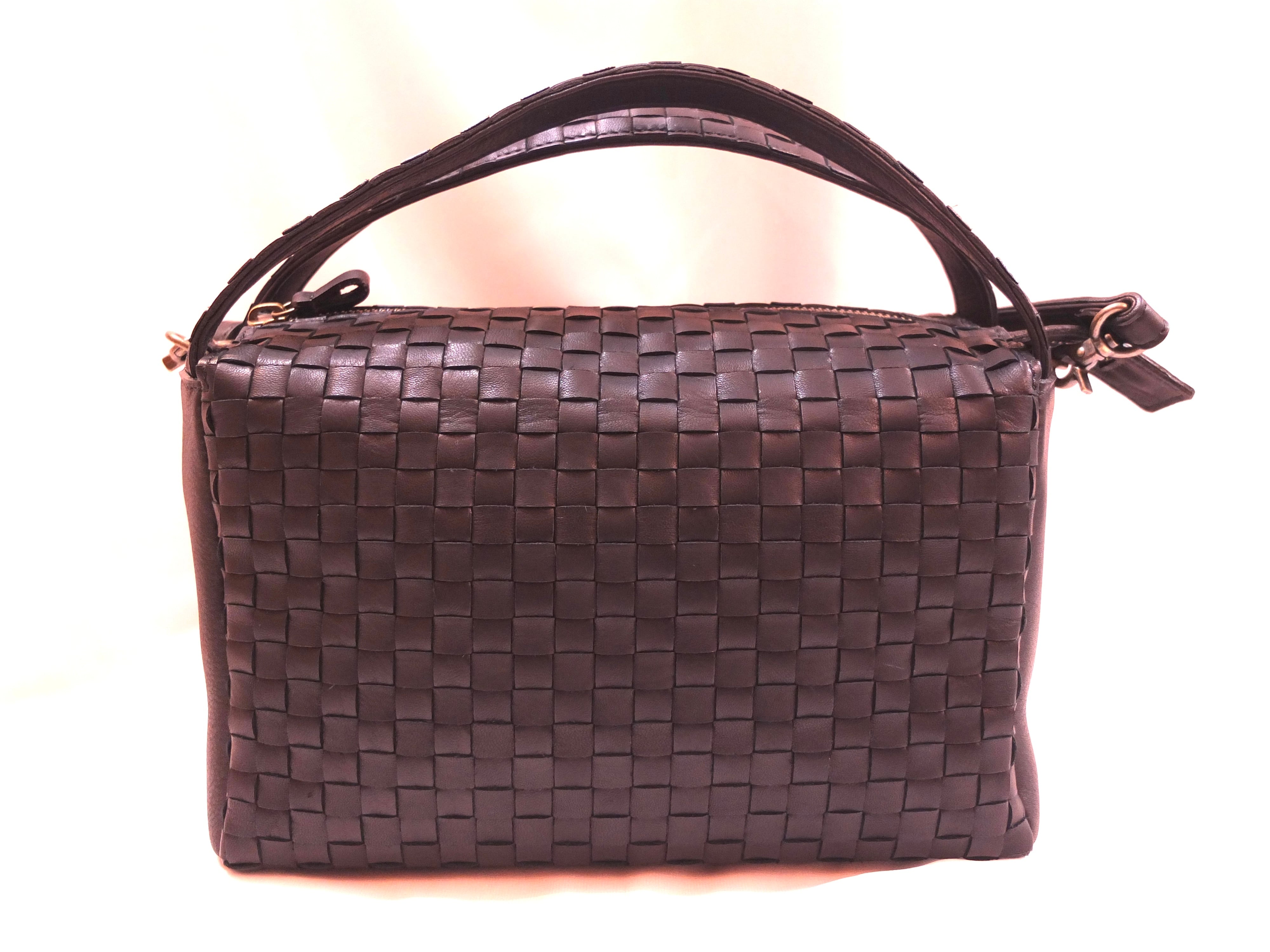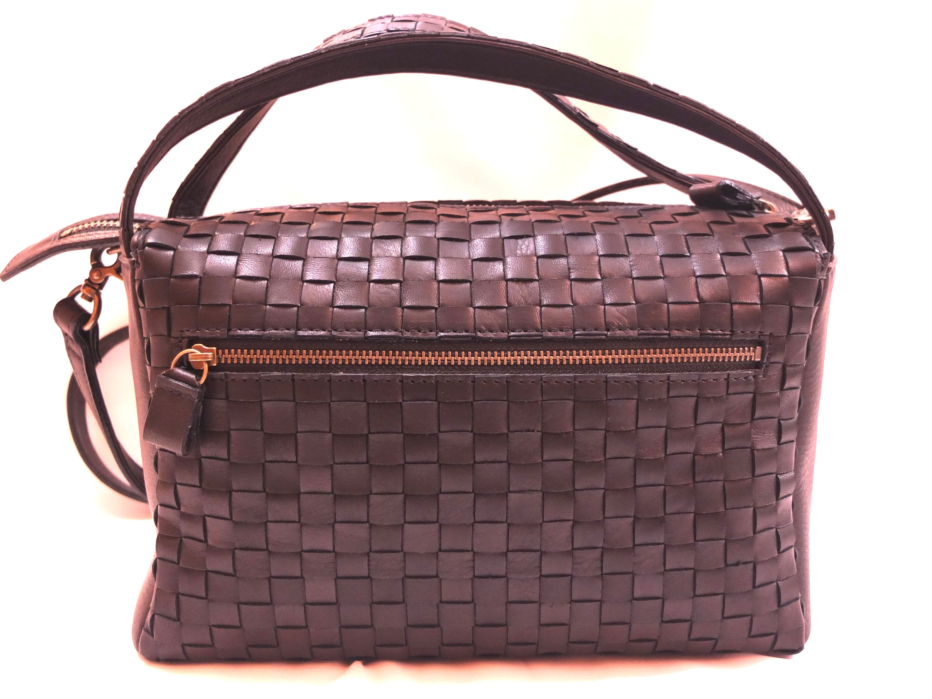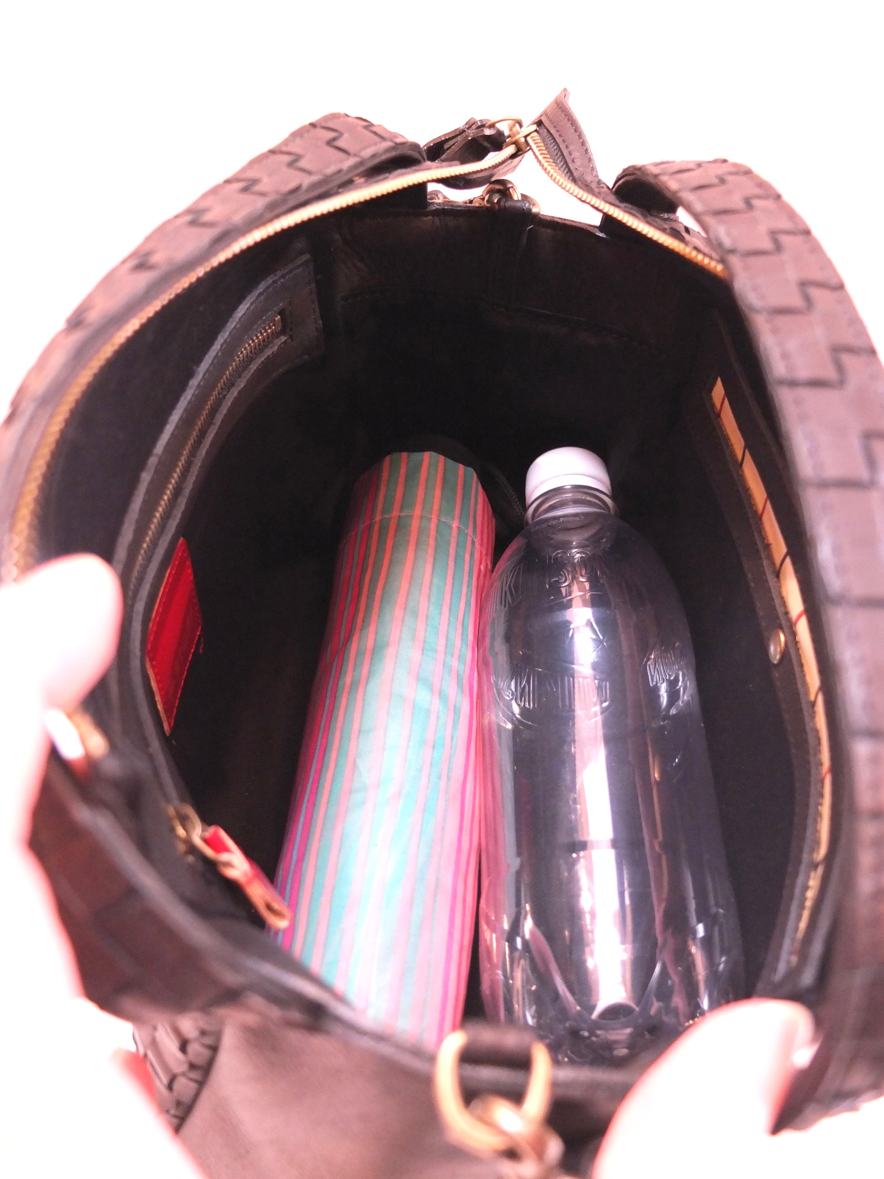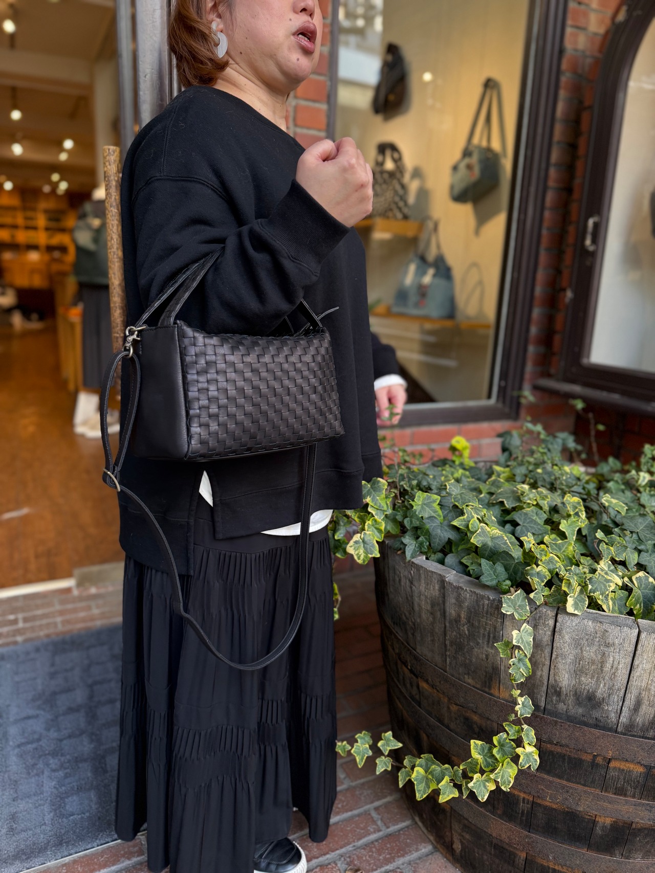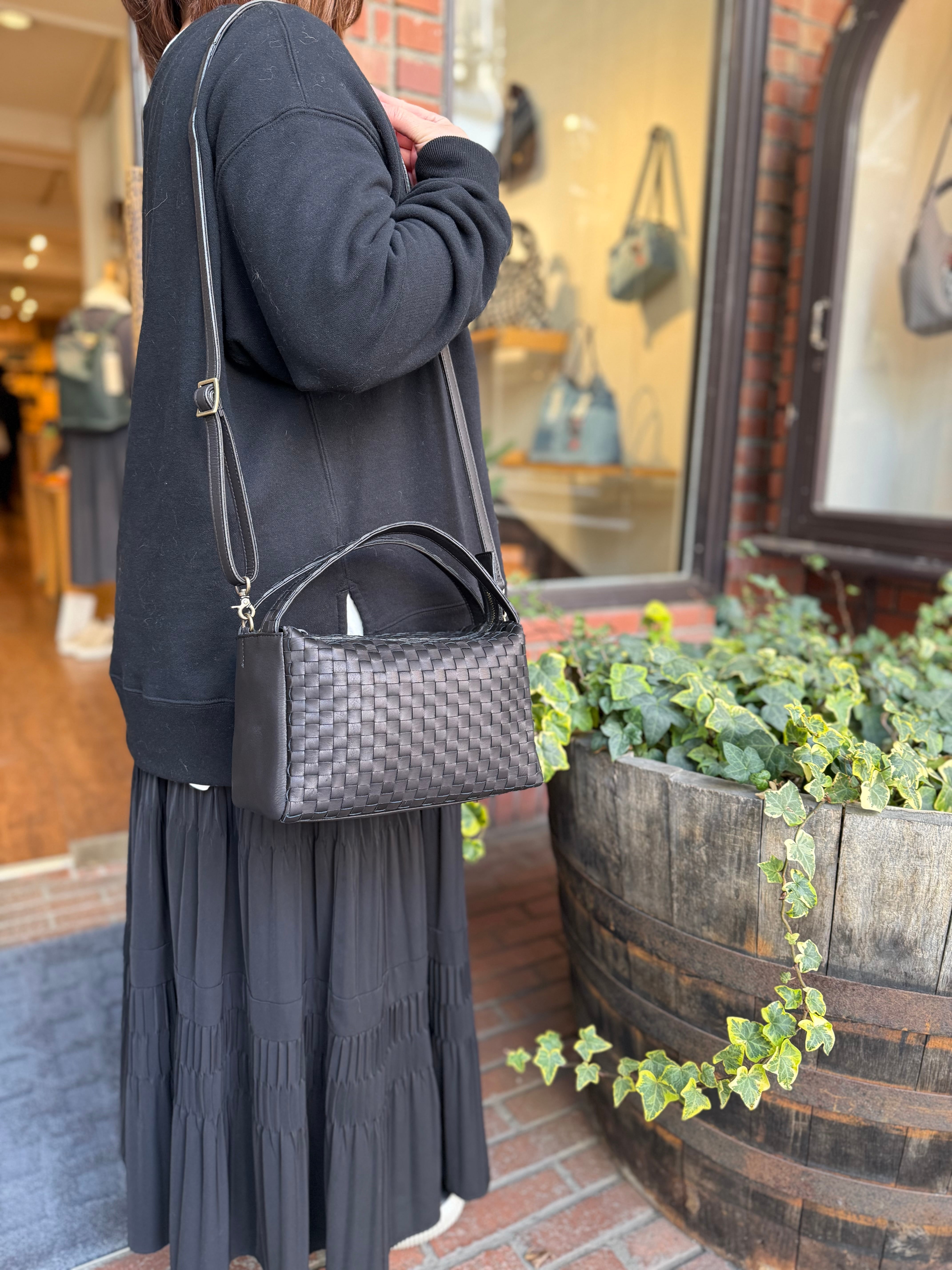 ボックスシルエットの2wayショルダーバッグ。コンパクトな見た目ながら日傘や500mlのペットボトルもしっかり収納可能な大きさ。持ち手のベルトを付ける箇所をサイドにすることで、開口部が広くなり、物の出し入れの邪魔をしません。ショルダーバッグとして持った際もスッキリ見えます。ベルトの取り付け金具は外した際に本体内側に隠せる仕様で、手提げにした際に邪魔になりません。