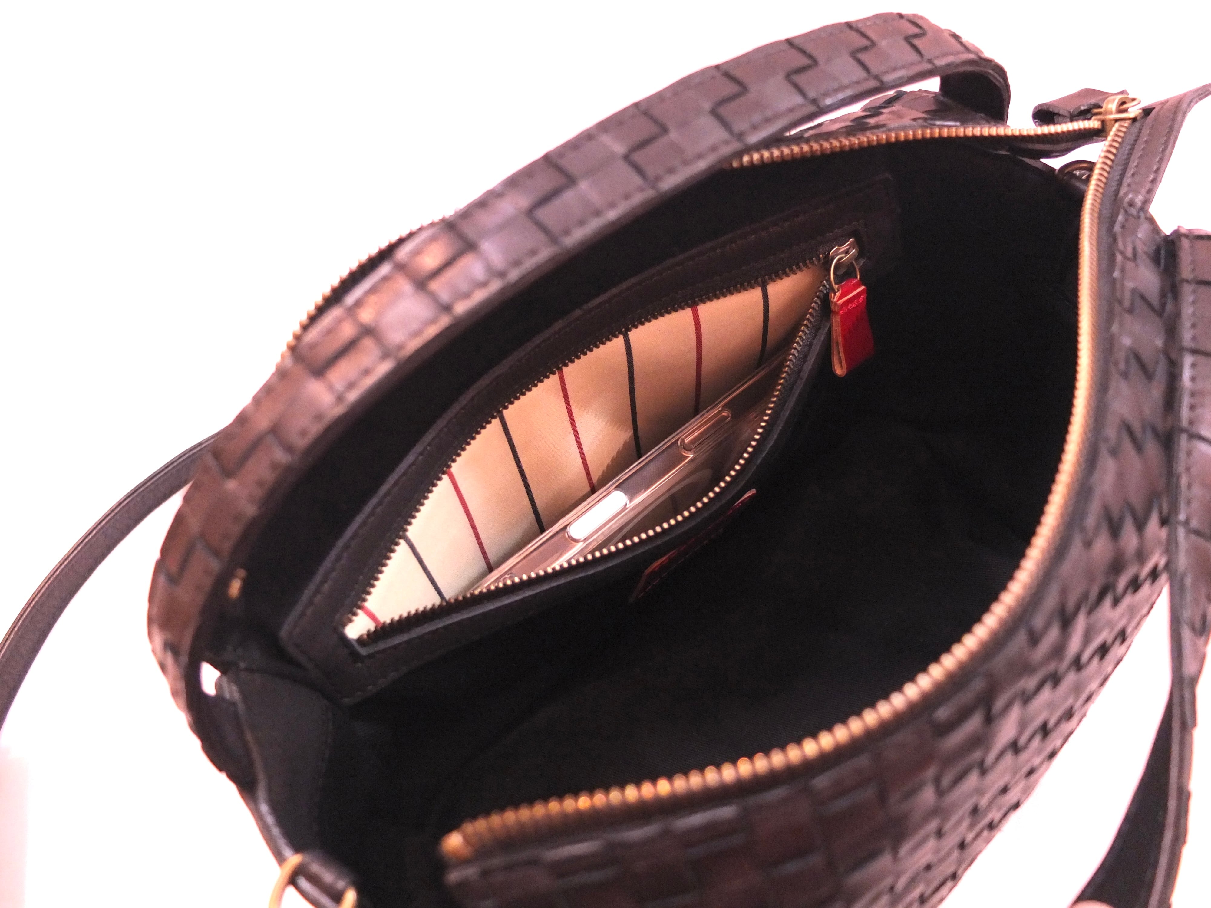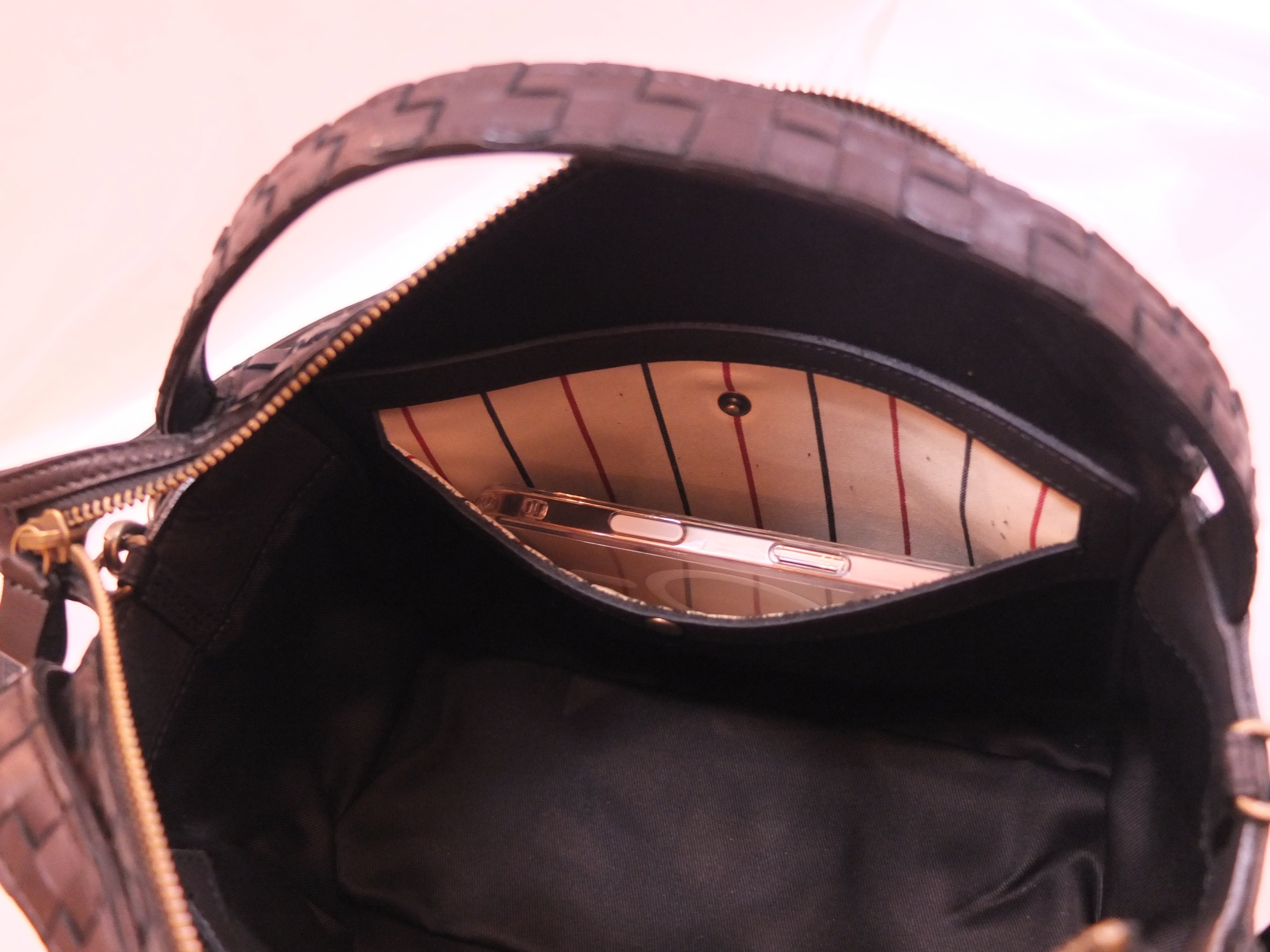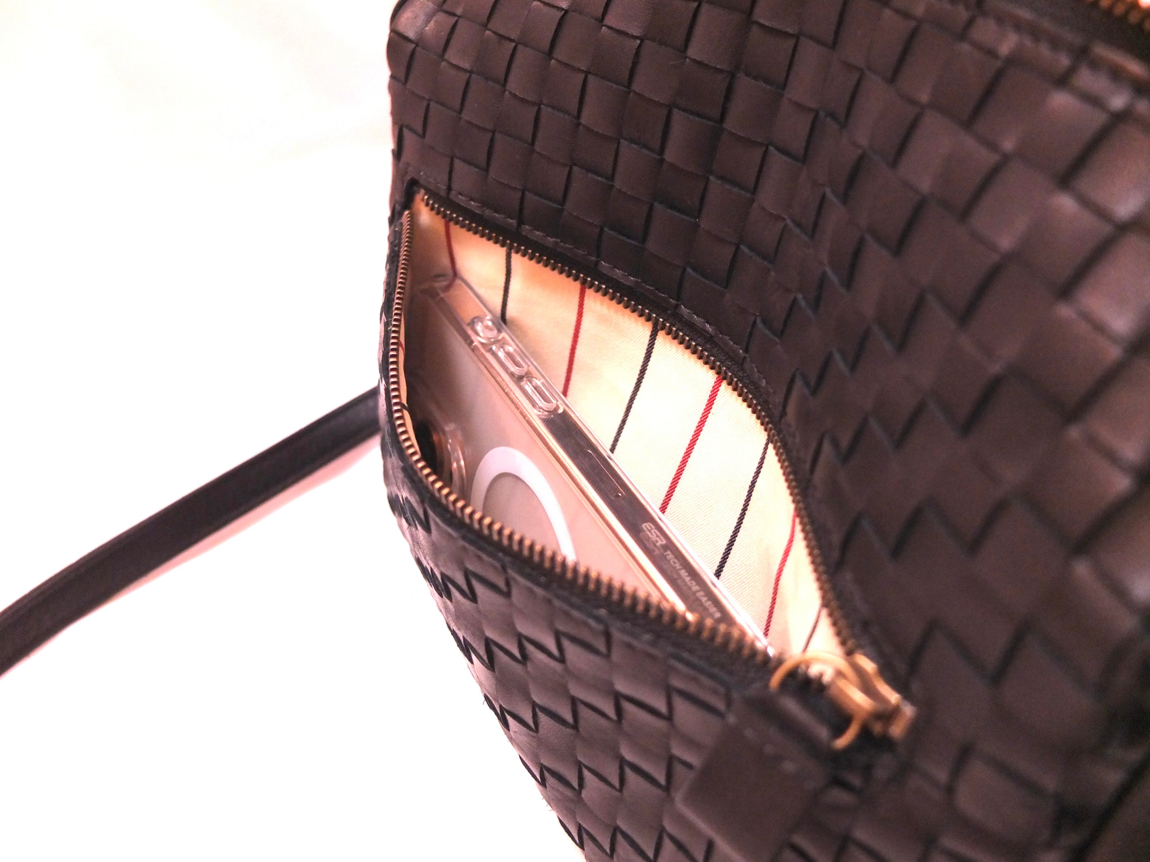背中側にファスナーポケット1ヶ所、内装はホック付きポケット1ヶ所、ファスナーポケット1ヶ所。各ポケット、スマートフォンが入る程度の大きさです。