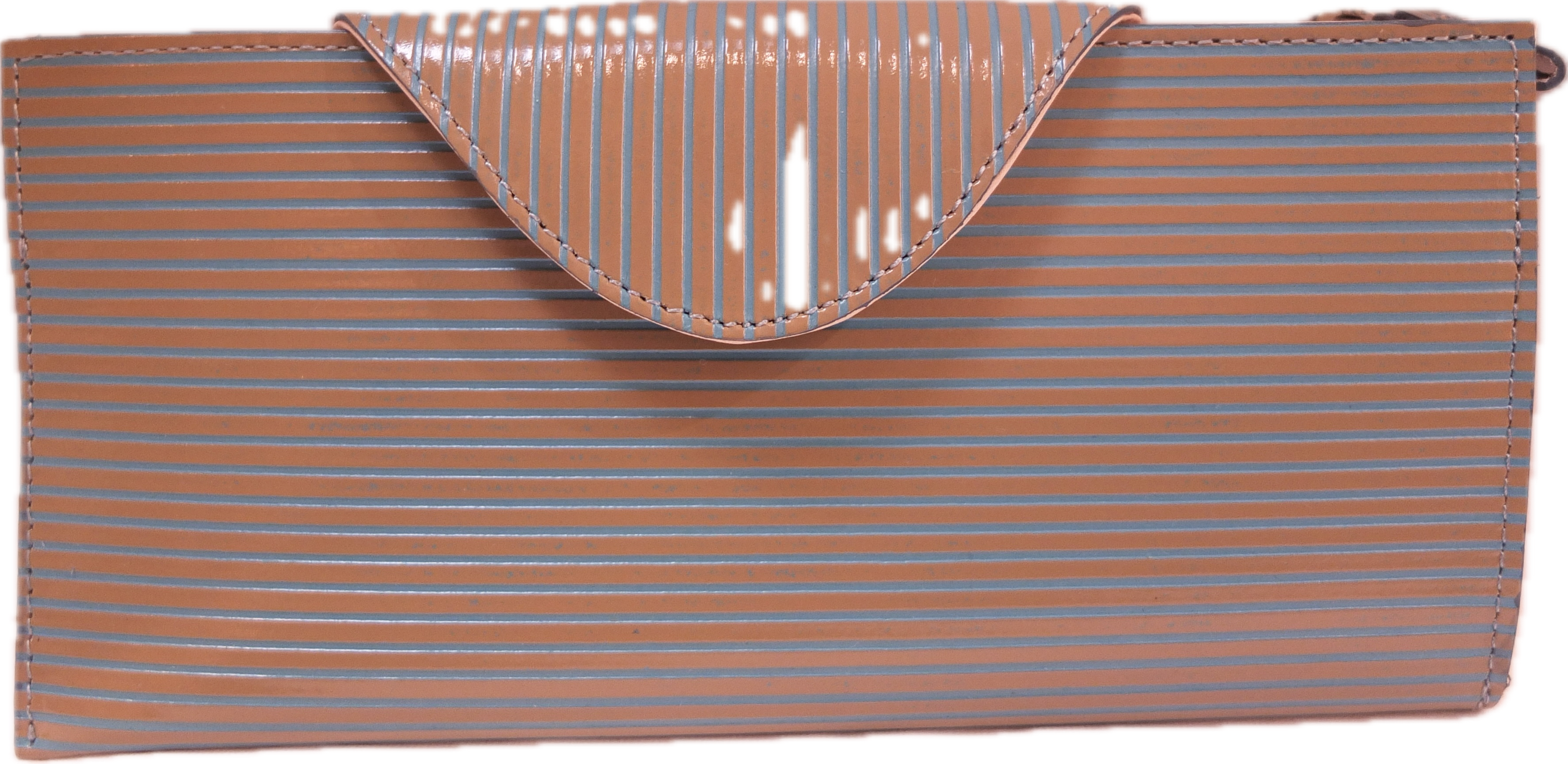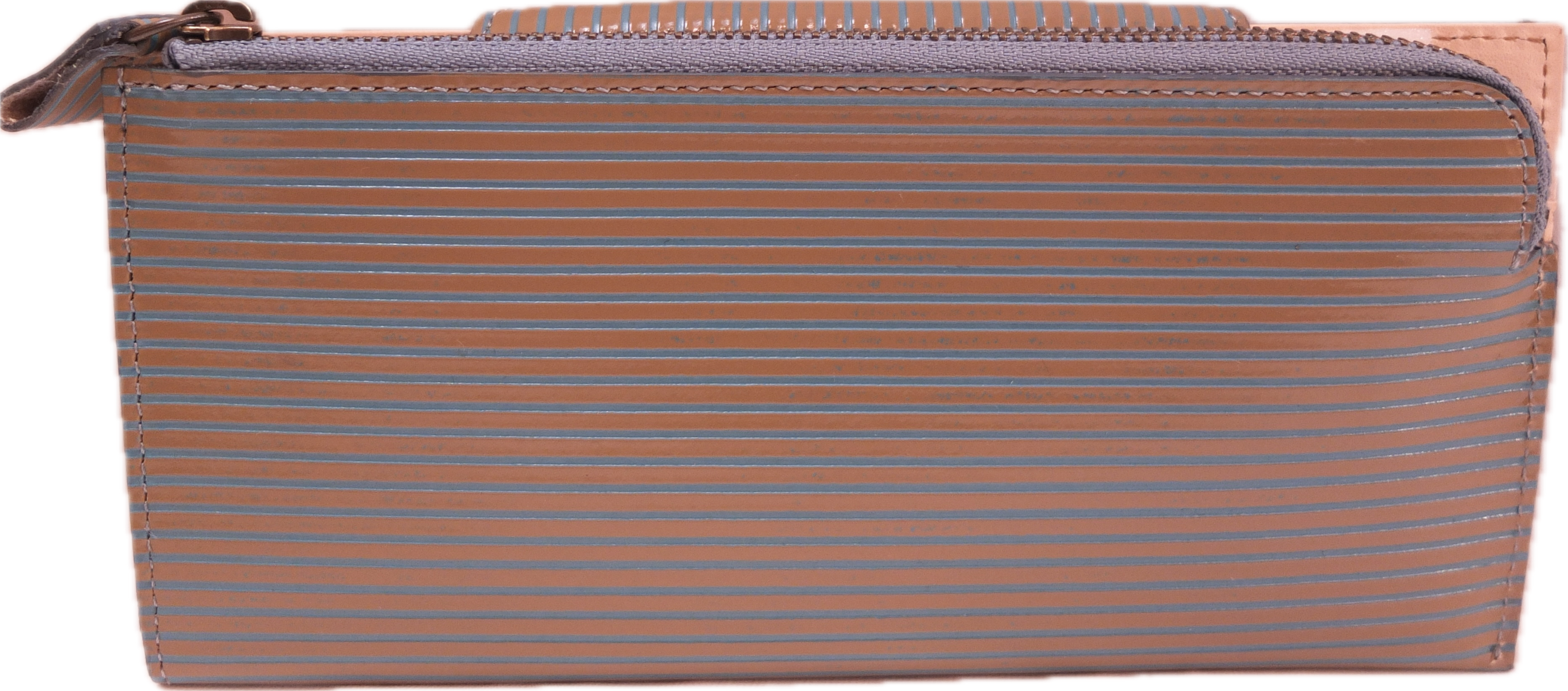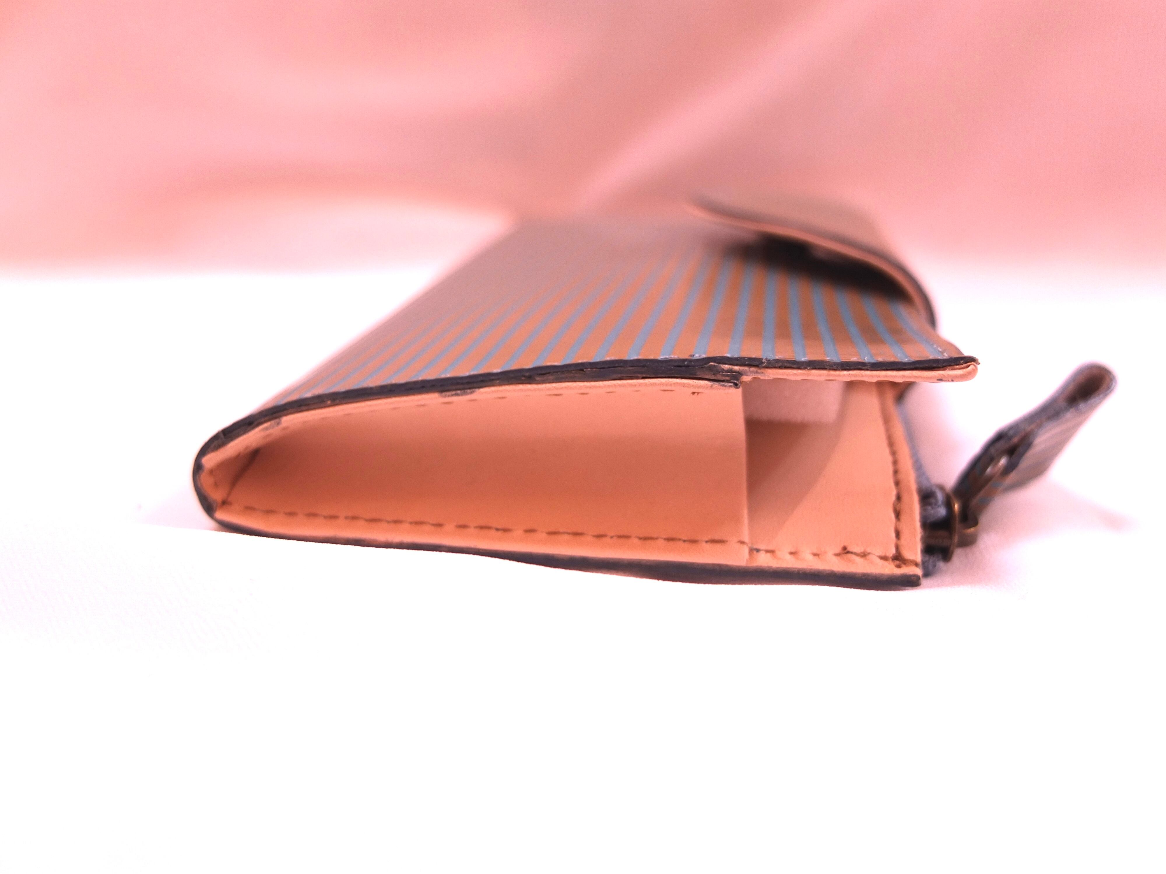 きめ細やかなキップレザーをベースにガラスレザーを作り、その表面にベースとトップの2色を着色しストライプの型を押し、最後に凸部分の色を拭き取って仕上げています。カラフルでポップな雰囲気ながら、ハンドメイドの温もりも感じられる素材です。