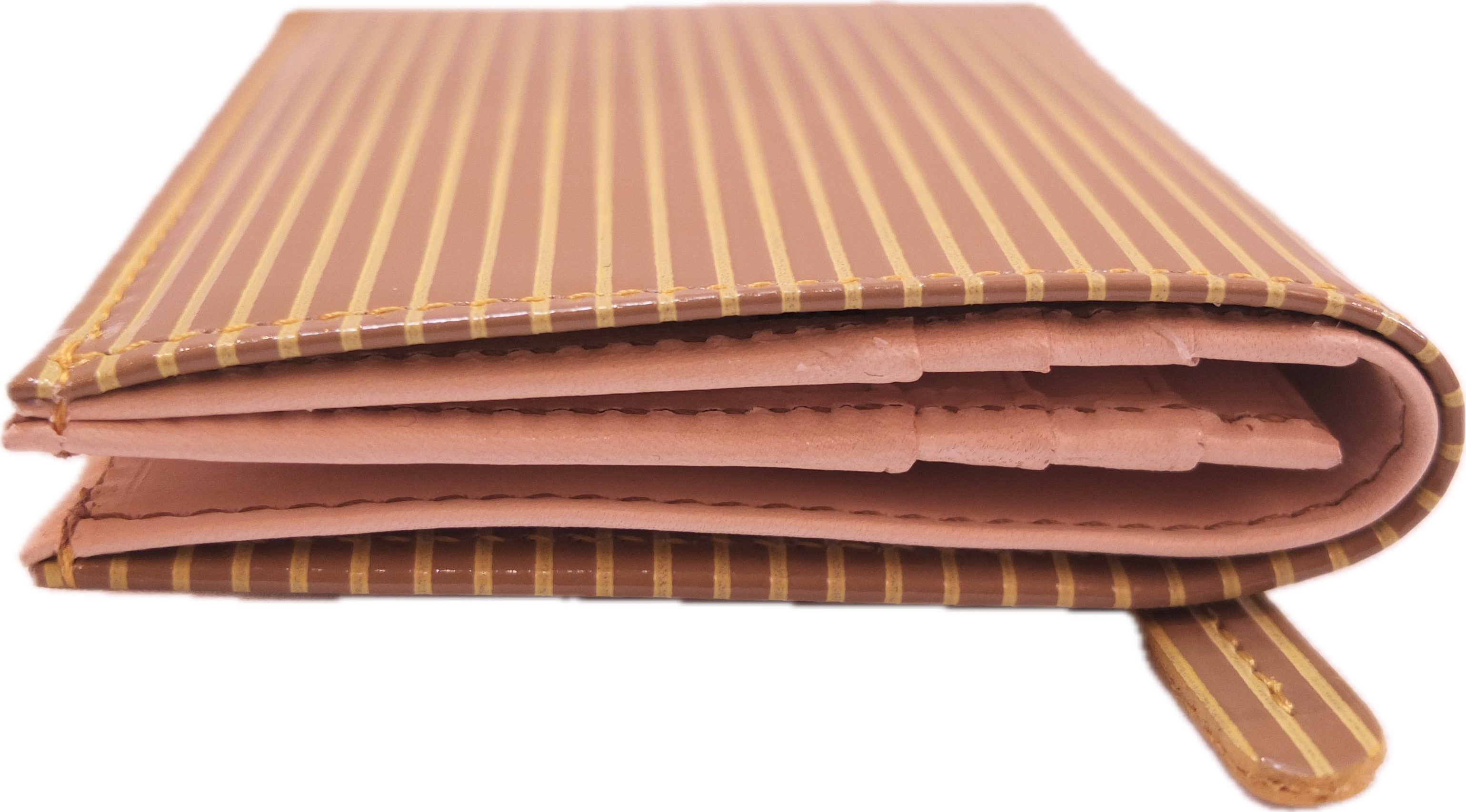 きめ細やかなキップレザーをベースにガラスレザーを作り、その表面にベースとトップの2色を着色しストライプの型を押し、最後に凸部分の色を拭き取って仕上げています。カラフルでポップな雰囲気ながら、ハンドメイドの温もりも感じられる素材です。