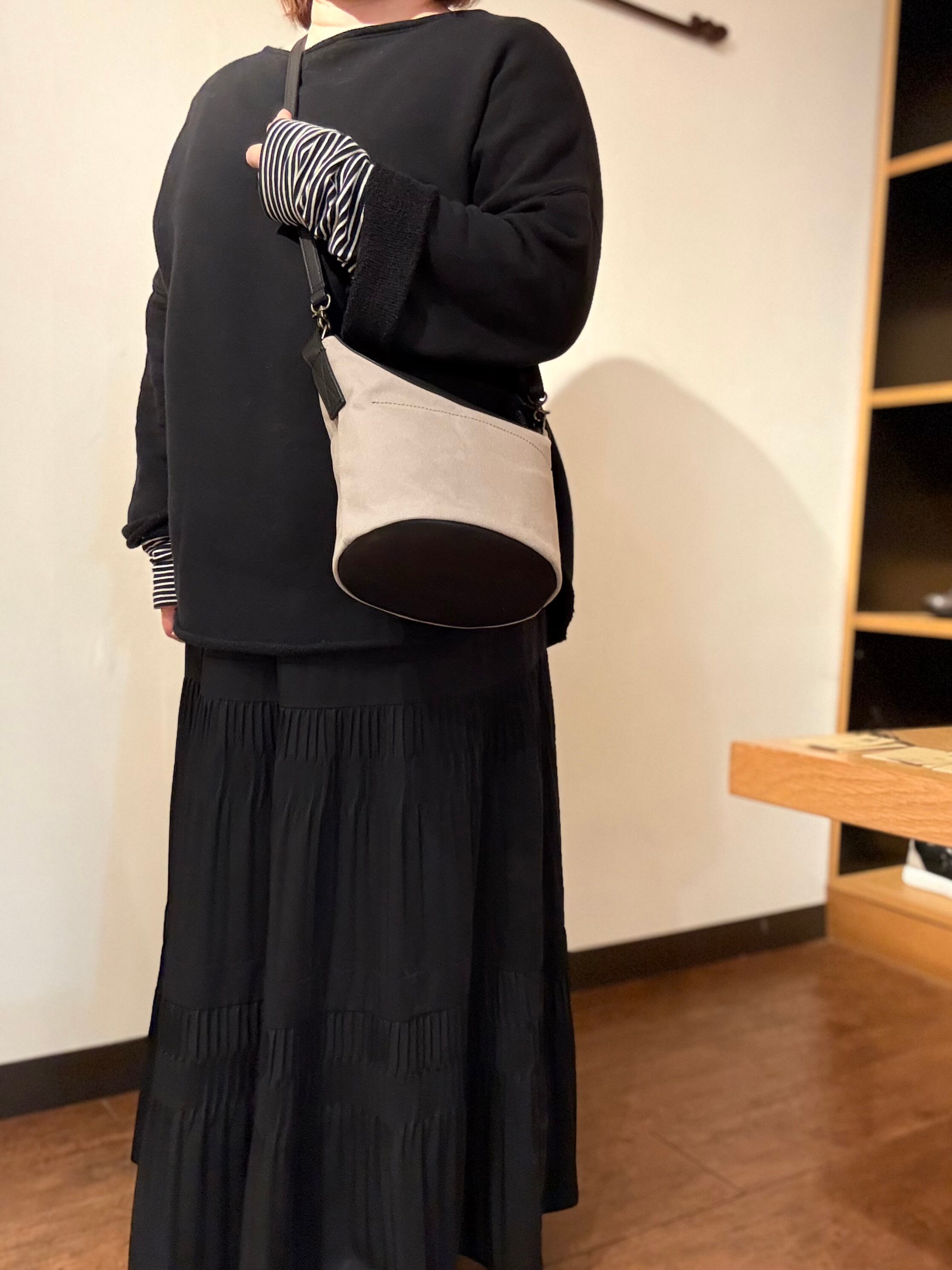 口元を折ることで立体感が生まれるショルダーバッグ。口元を立てれば、厚みを抑えてスッキリ持て、変化を楽しむことができます。長財布は横に入れてジャストで入る大きさ。口元を立てれば、縦に入れることができます。