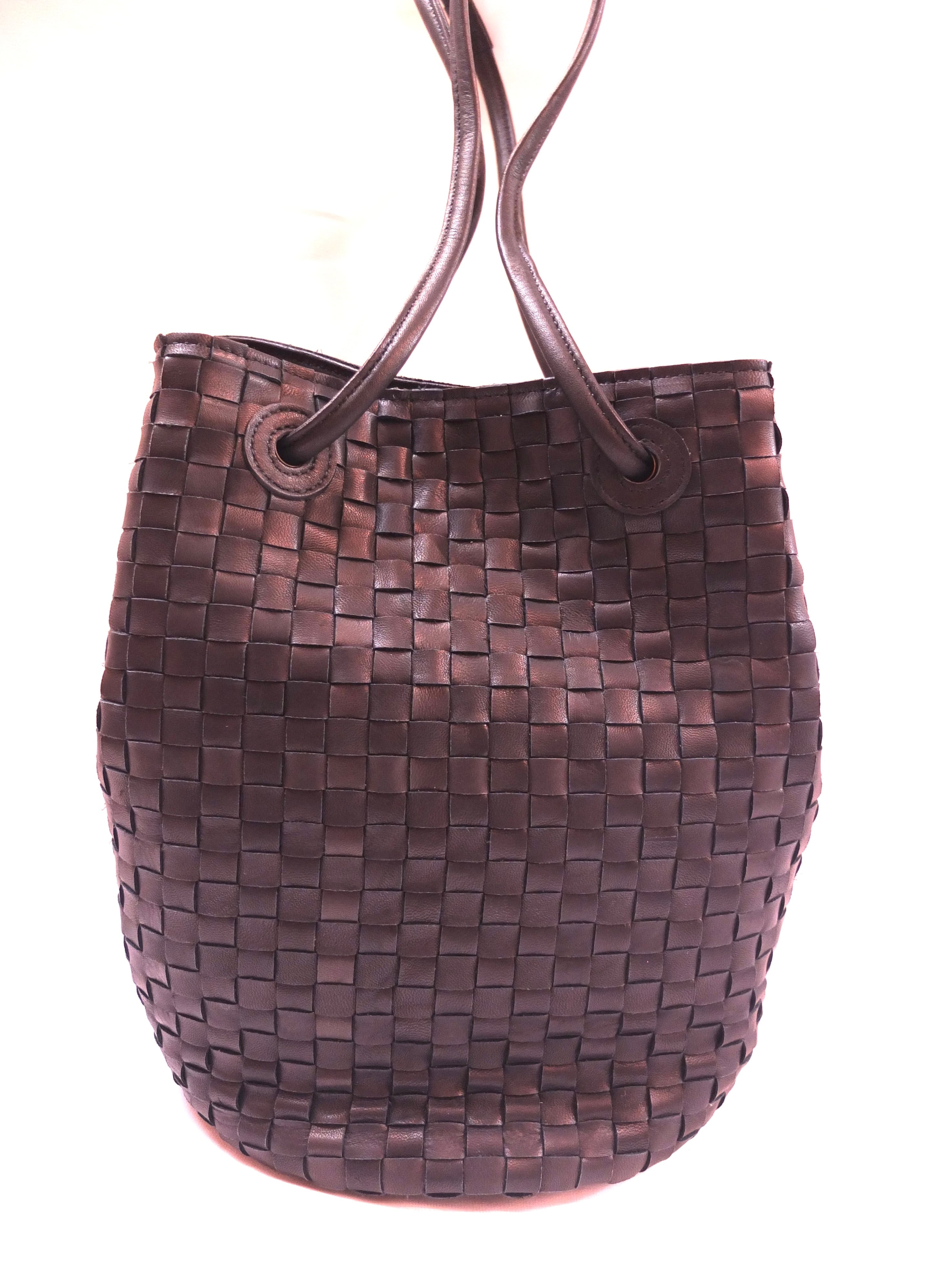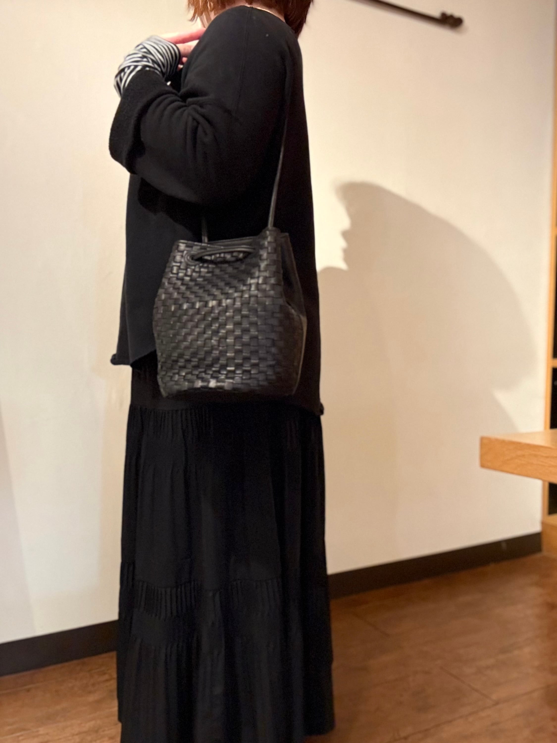 ちょうど良いサイズ感の巾着バッグ。見た目以上に収納力がある、ペットボトルなども収納可能です。持ち手を片側伸ばしてセミショルダーにもできます。背面には柔らかなスムースレザーを使用しており、その日の気分に合わせて両面お使いいただけます。