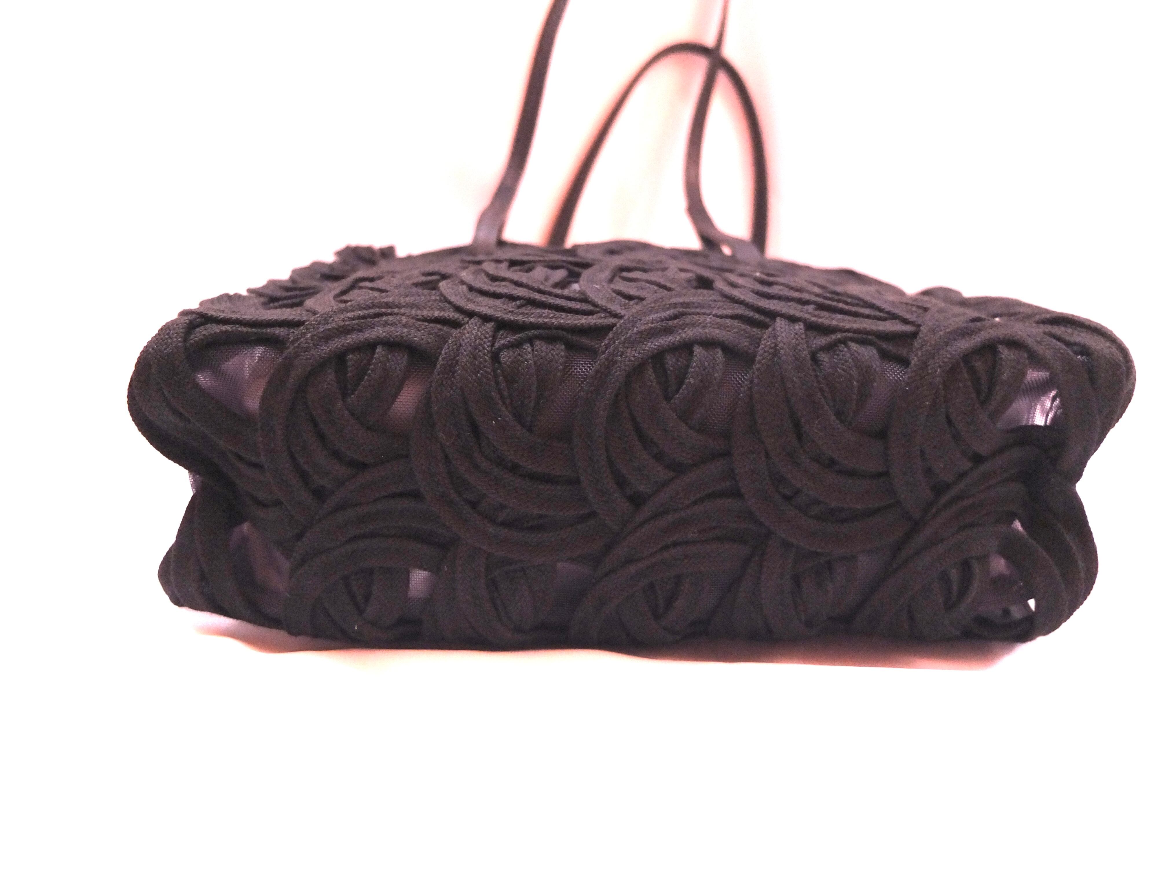 長さ40メートルにもなる1本のコードを途切れることなく描いていくコード刺繍の技術を使ったバンドバッグ。立体的な刺繍とチュール生地の透け感が印象的です。