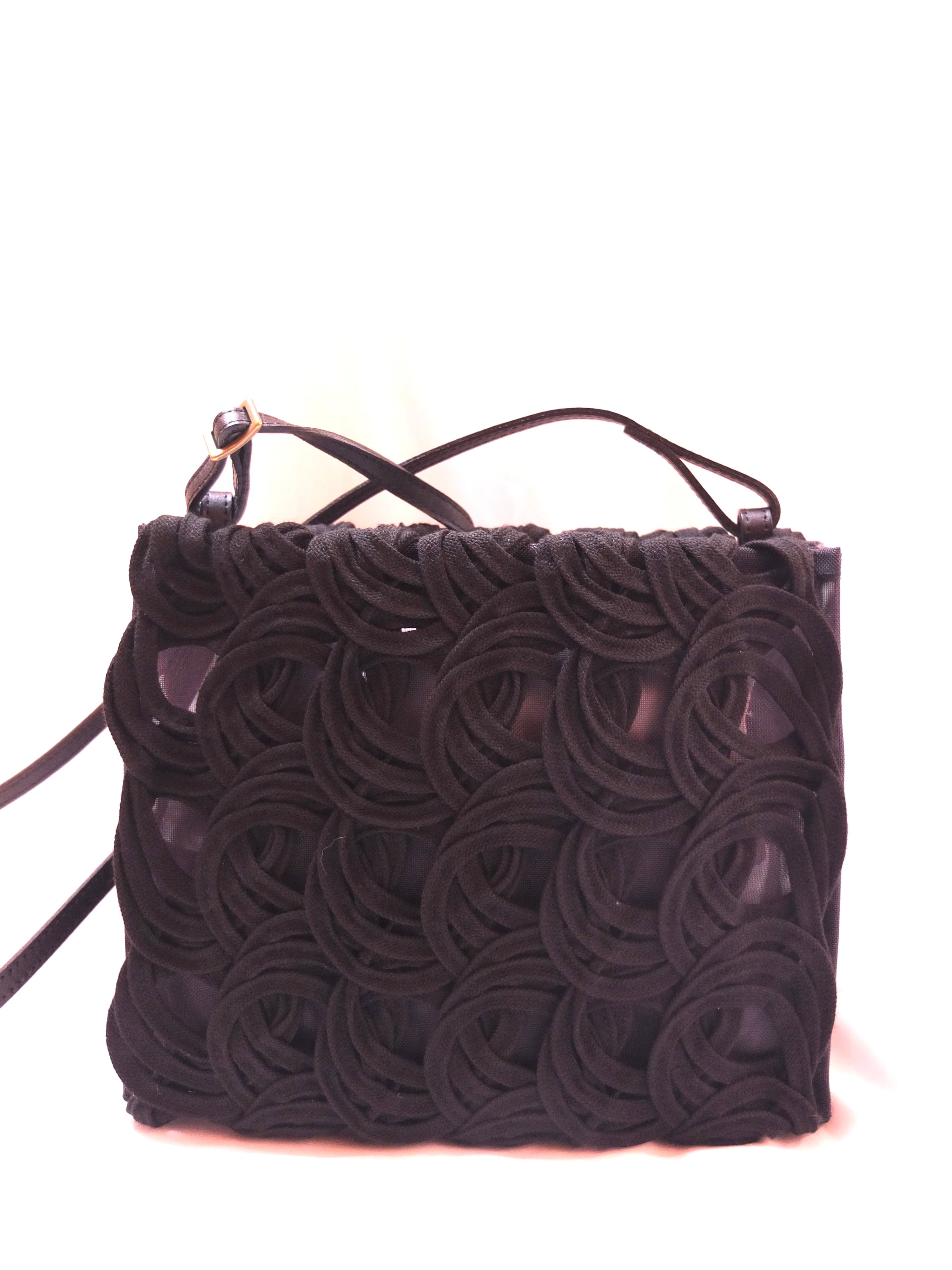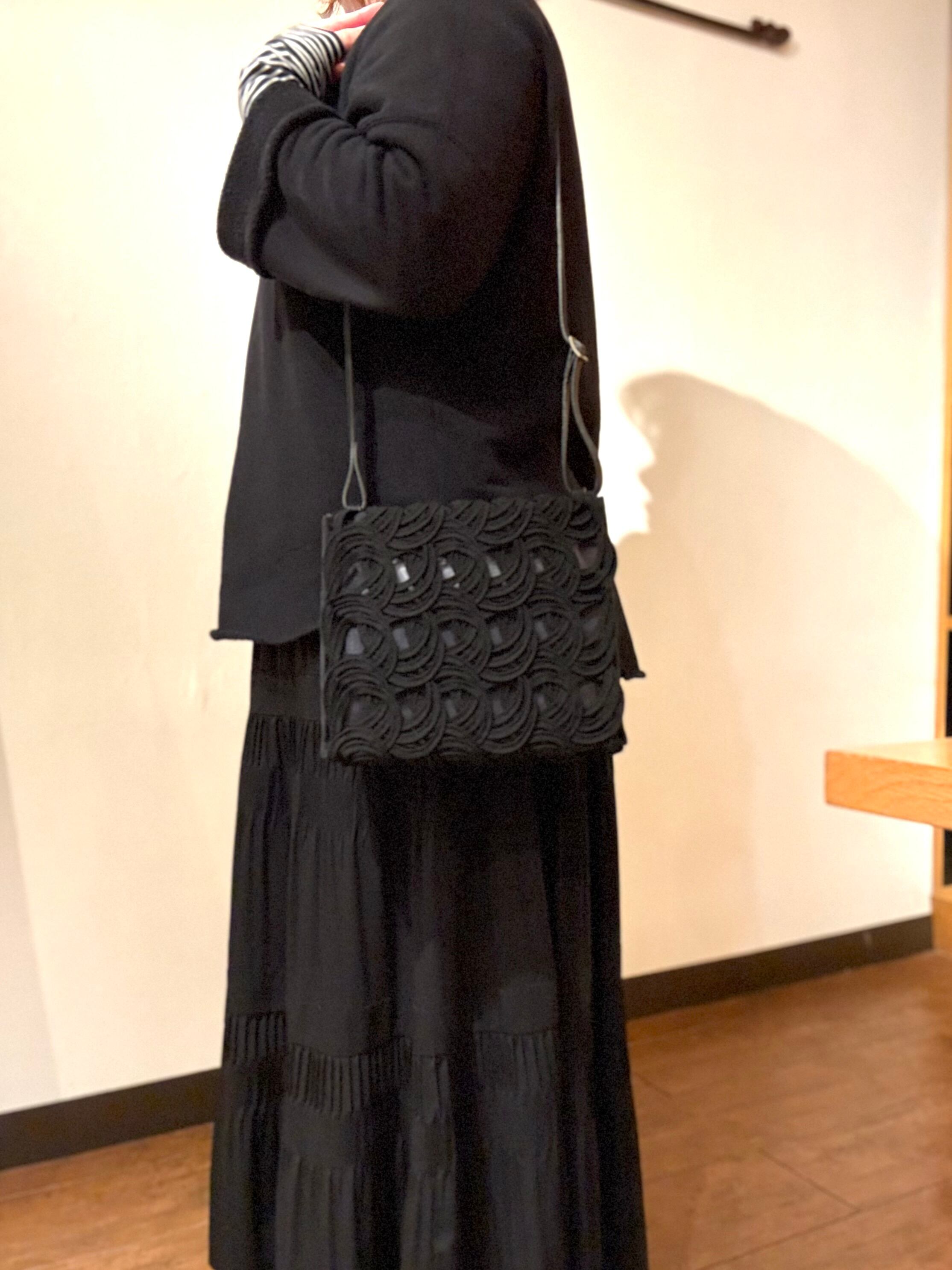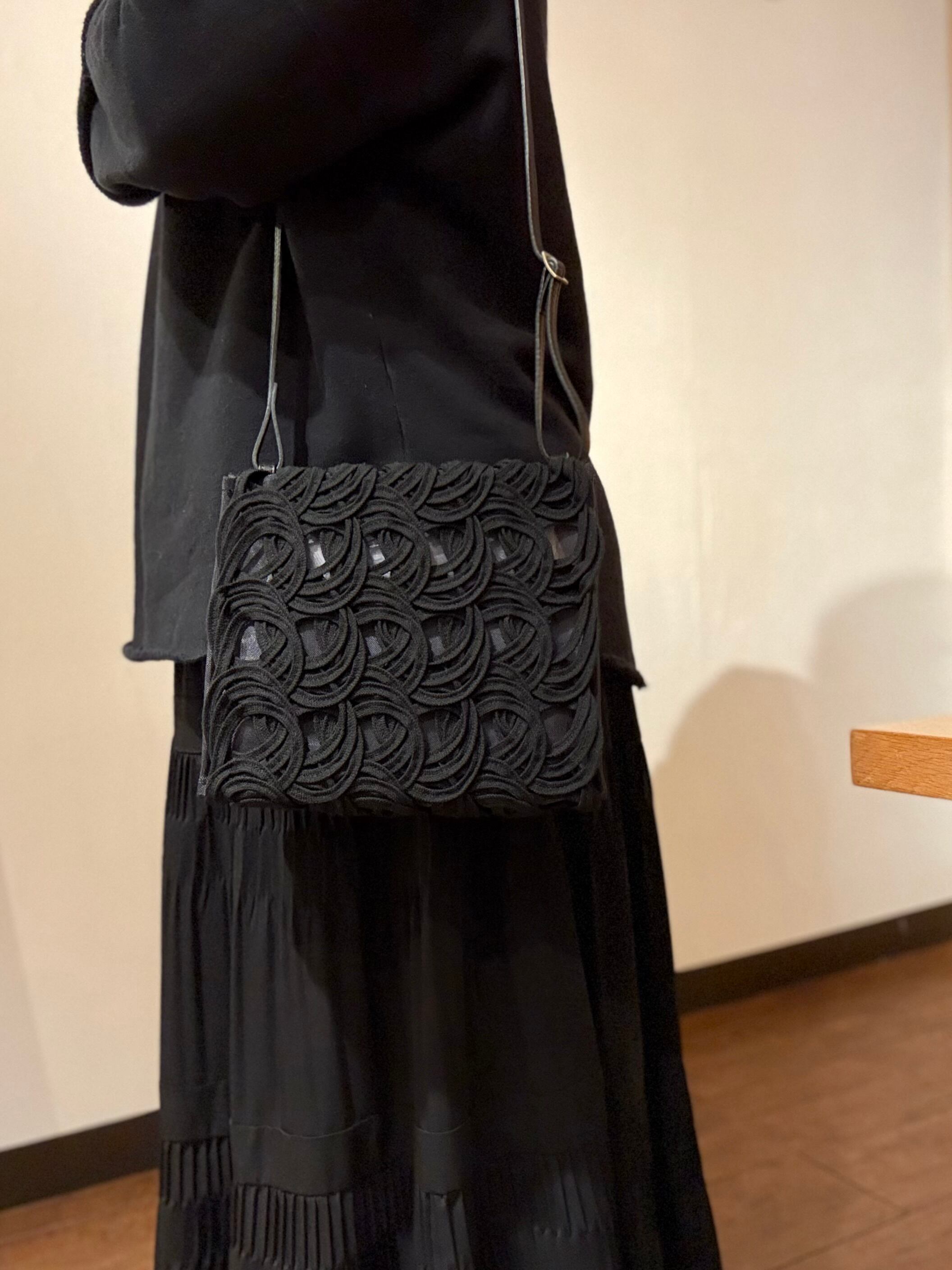 長さ40メートルにもなる1本のコードを途切れることなく描いていくコード刺繍の技術を使ったバショルダーバッグ。立体的な刺繍とチュール生地の透け感が印象的です。