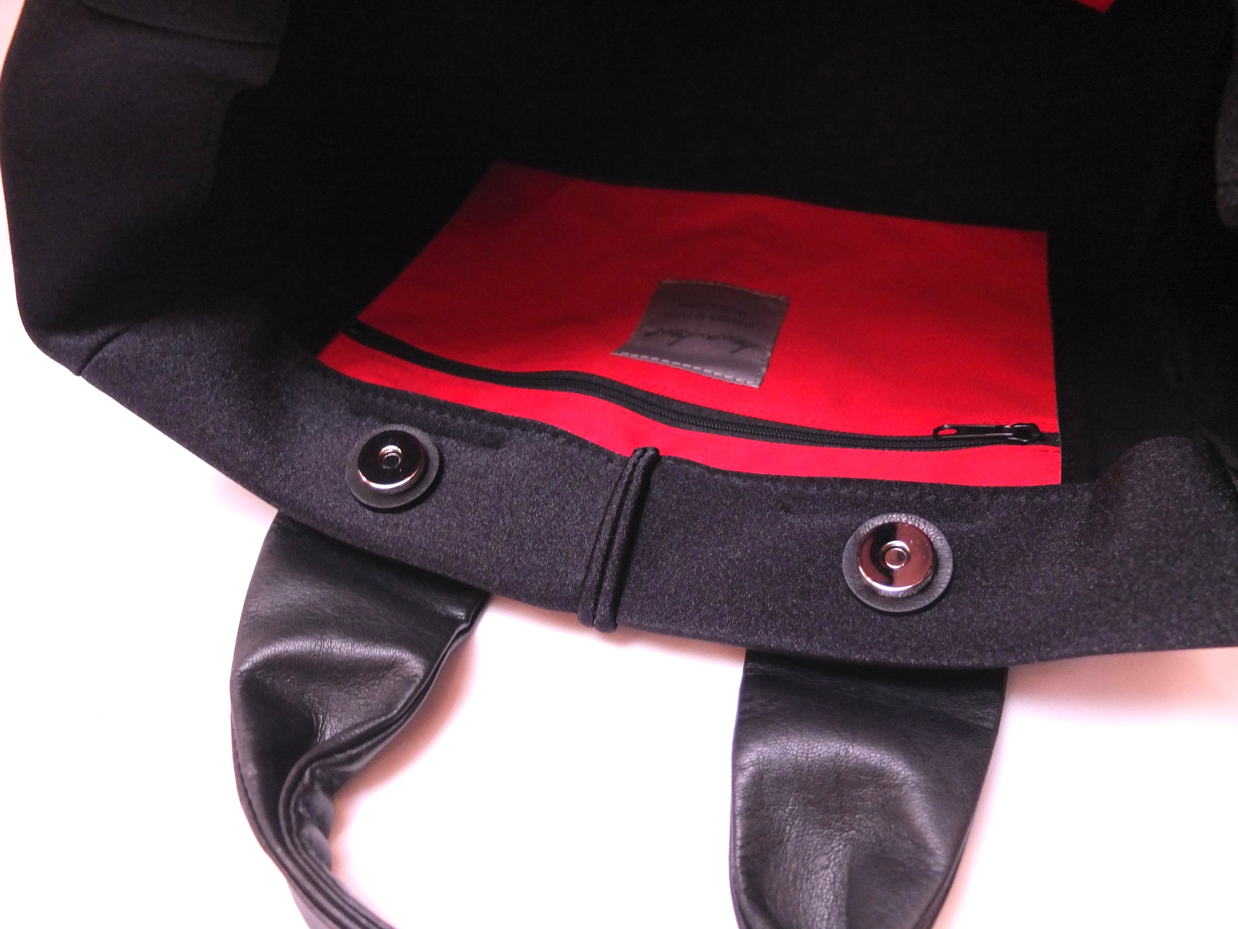 開閉部には2つのマグネットが付いており、口元をしっかりと閉じてくれます。内装はファスナーポケット1ヶ所、オープンポケット2ヶ所がございます。