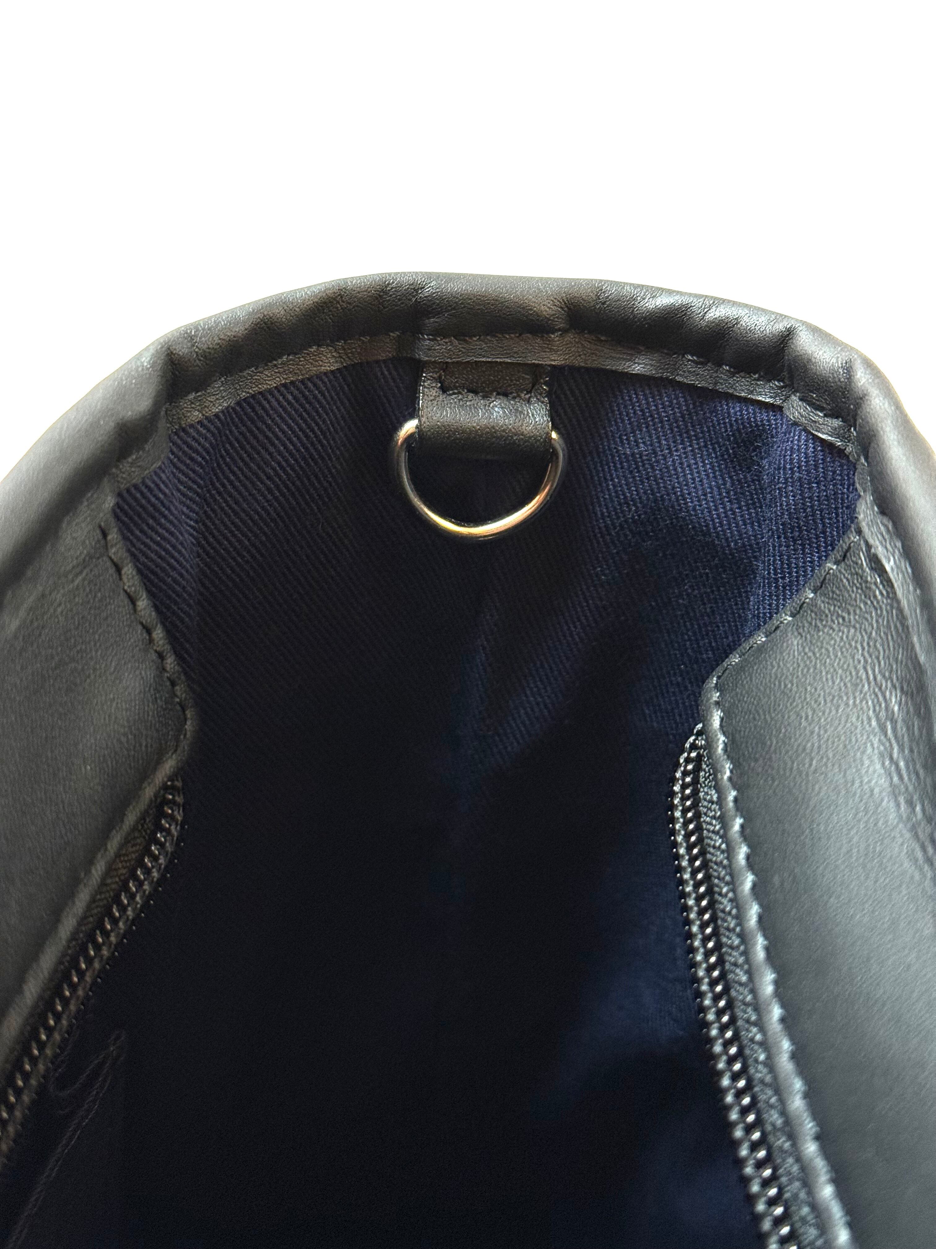 背面にはスマートフォンやパスケースなどが入る大きさのオープンポケット。内装はマチ付きオープンポケット2ヶ所、ファスナーポケット1ヶ所がございます。