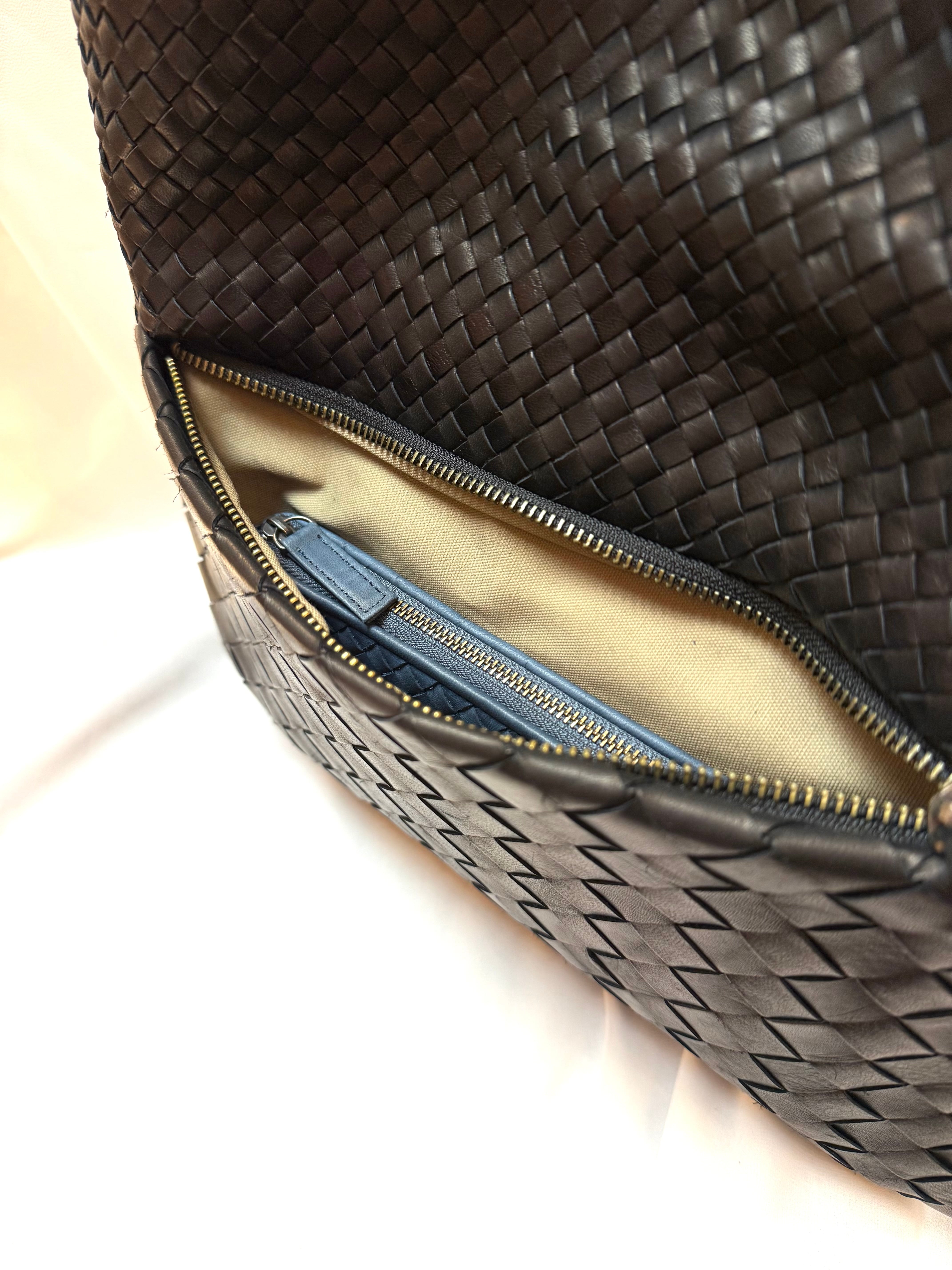 1枚の革に、裁断した細目と太目の革を差し込んで編まれたオリジナルメッシュを素材にカゴのようなデザインで仕上げました。馬革を使用することでさらに柔らかく、持った際にくったりした形に。物をしっかり入れた際にはハリが出てまた違う表情を楽しめます。