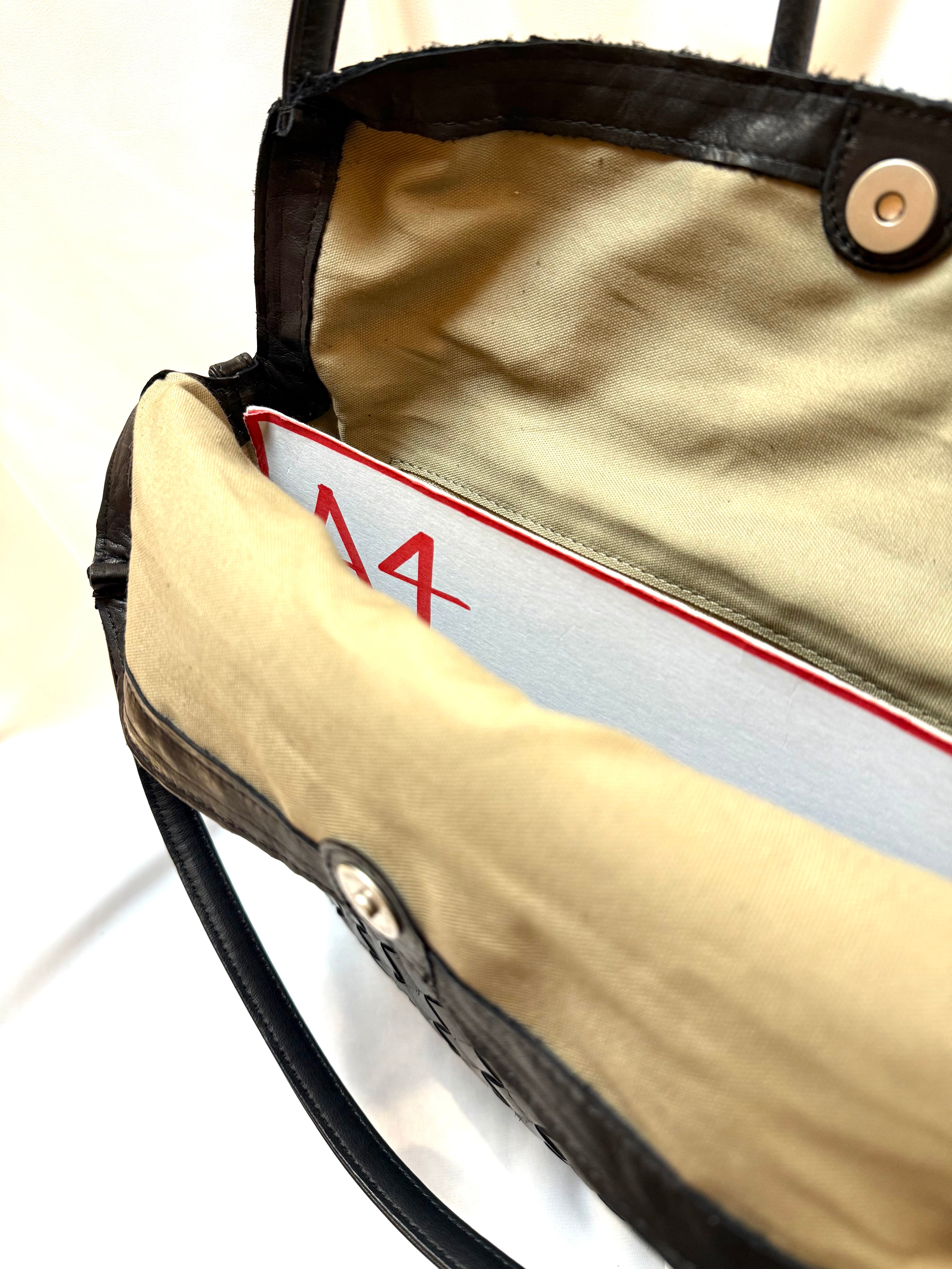 開閉はマグネット。背中側に長財布など収納可能なファスナーポケット1ヶ所、内装はオープンポケット1ヶ所、ファスナーポケット1ヶ所がございます。
