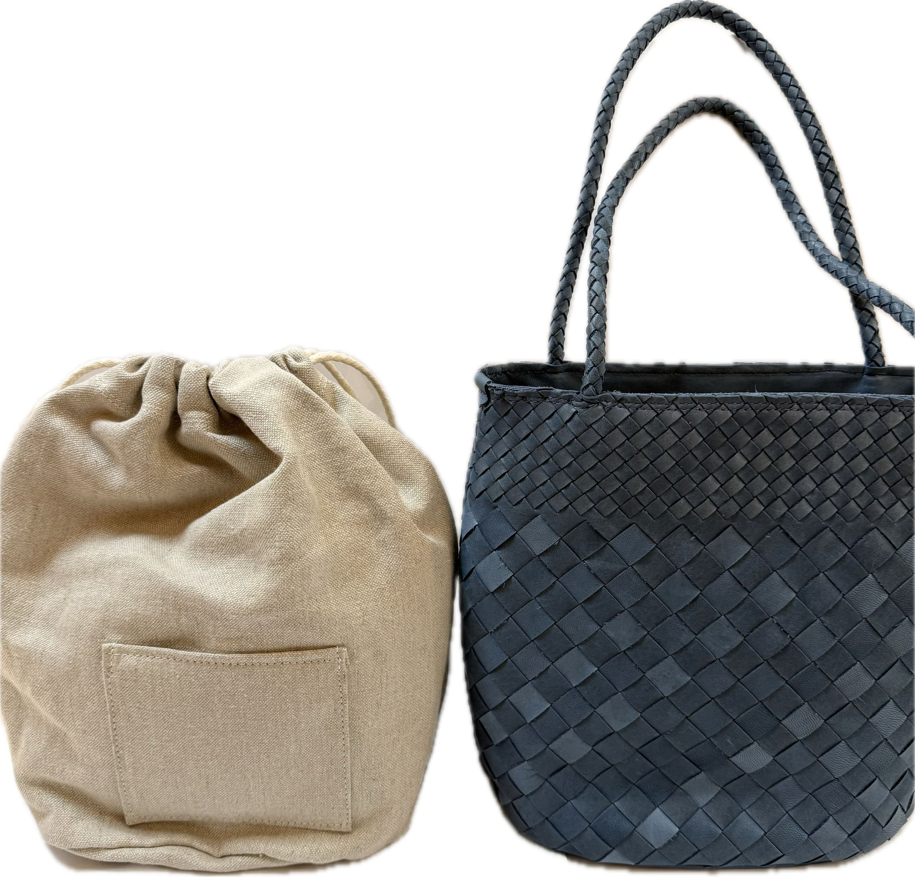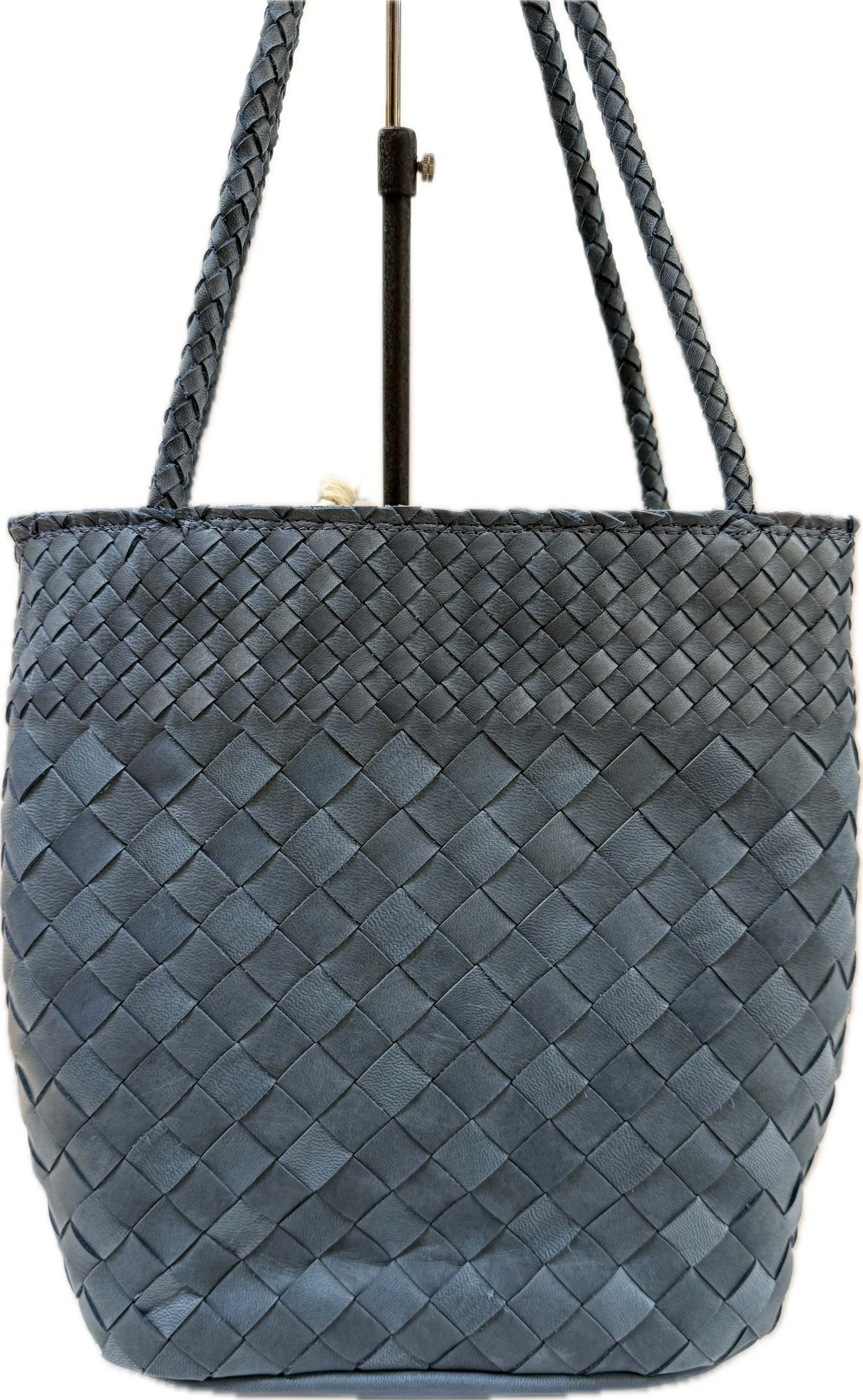 1枚の革に、裁断した細目と太目の革を差し込んで編まれたオリジナルメッシュを素材にカゴのようなデザインで仕上げました。馬革を使用することでさらに柔らかく、軽量に仕上げております。持ち手も柔らかなメッシュ仕立て。