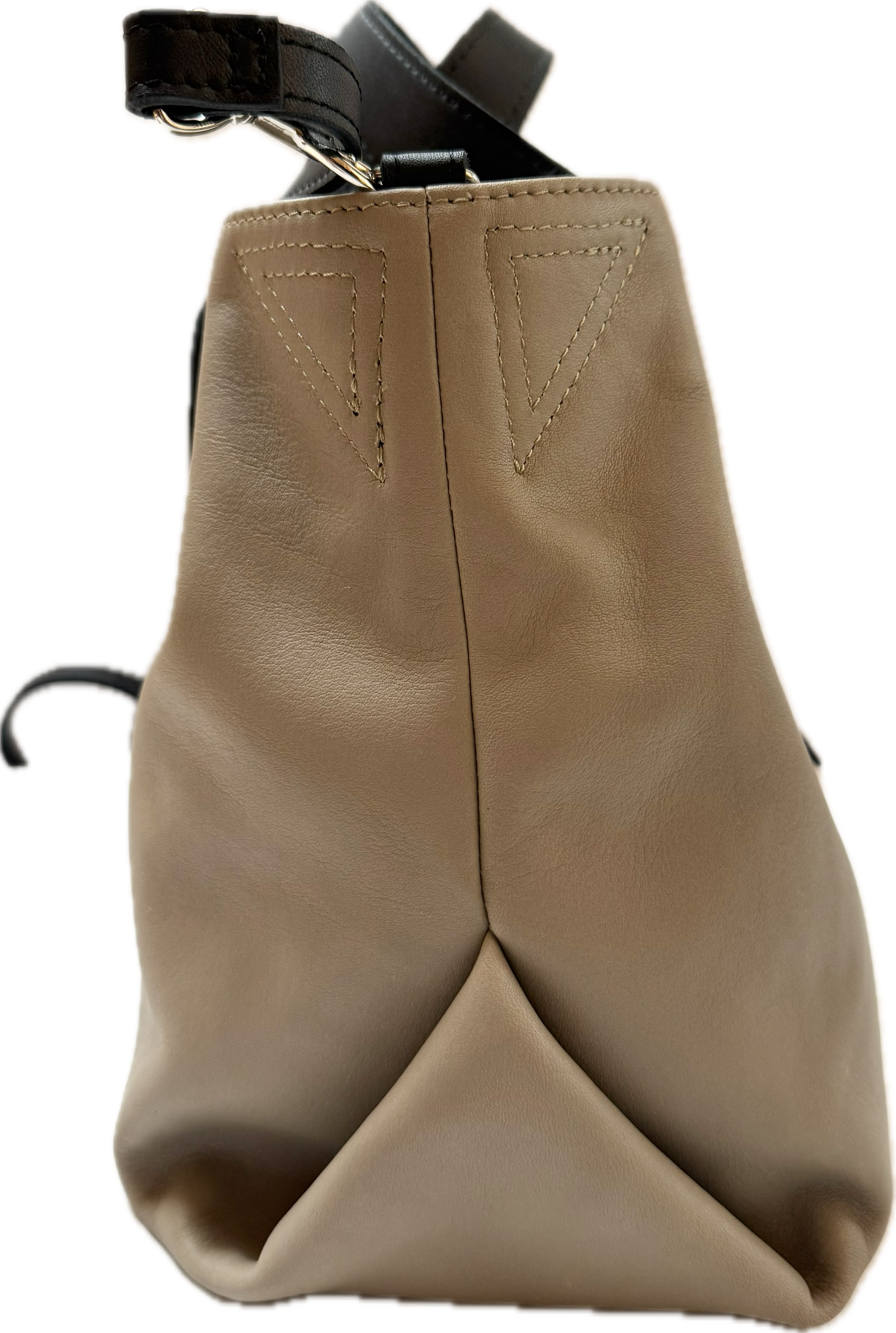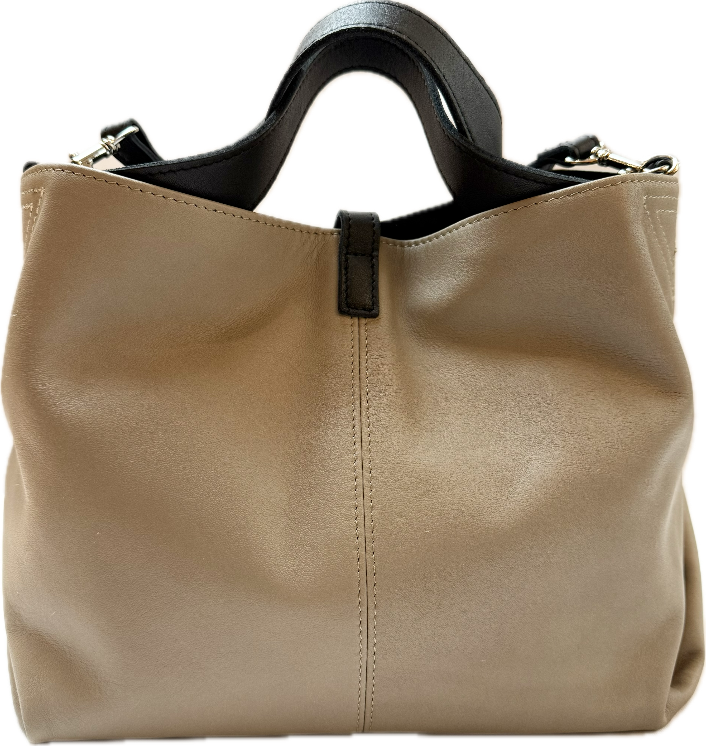 荷物を入れた際にクシュッとユニークなフォルムになる2wayショルダーバッグ。フロント部分の差し込みベルトと折り込んでマチを作っている底部分がデザインのポイントになっております。