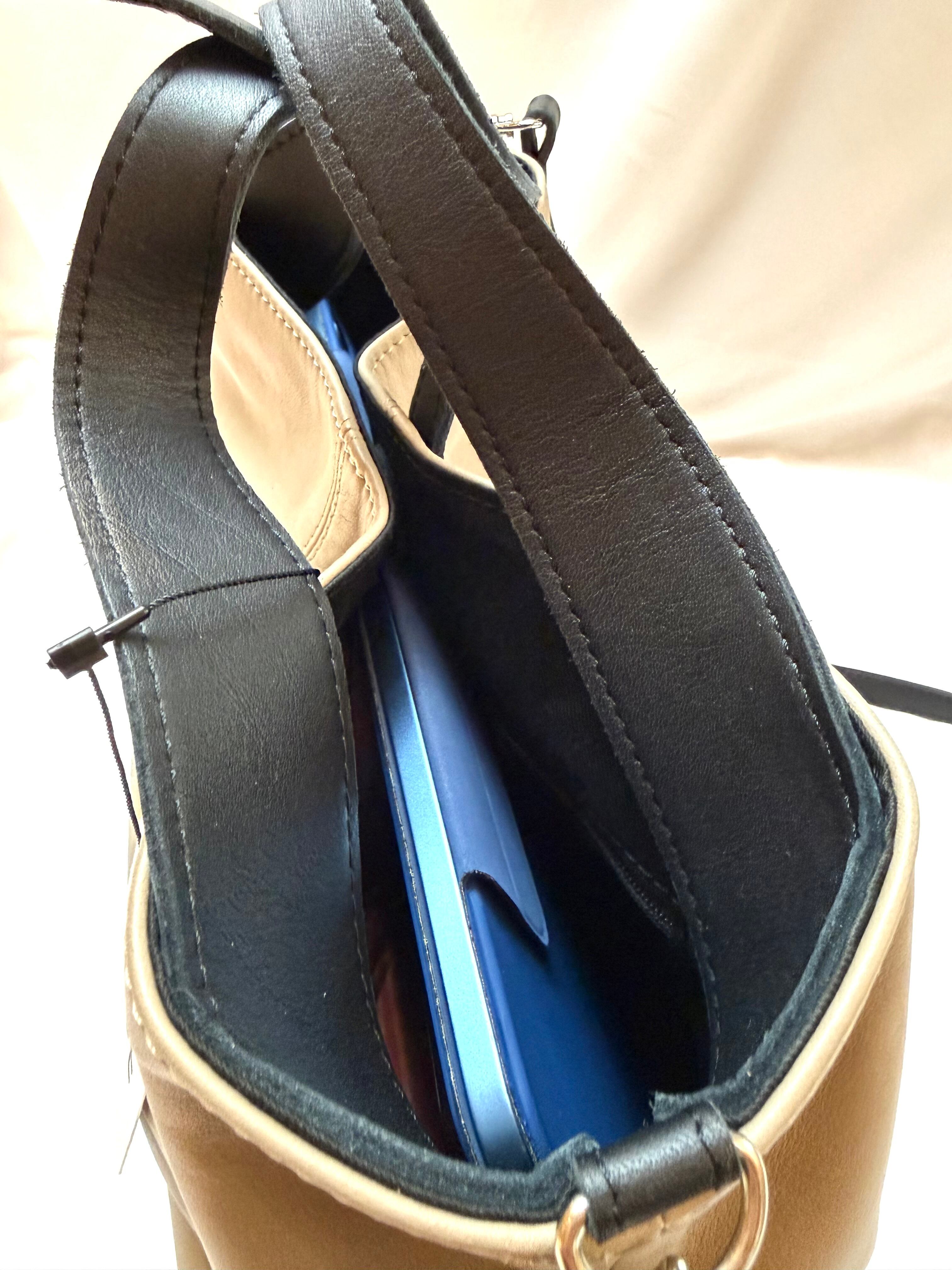 折りたたみ傘、500mlのペットボトルを横に入れて収容可能。少し倒れる形にはなりますが、11inchのタブレットを入れることもできます。底板があるので重い物を入れても型崩れを防ぎます。内装はオープンポケット1ヶ所とファスナーポケット1ヶ所がございます。