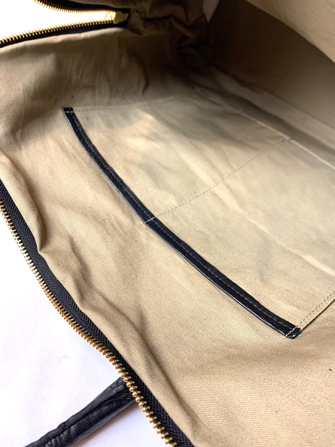 背中側にファスナーポケット、内側にオープンポケット2カ所とファスナーポケットがございます。