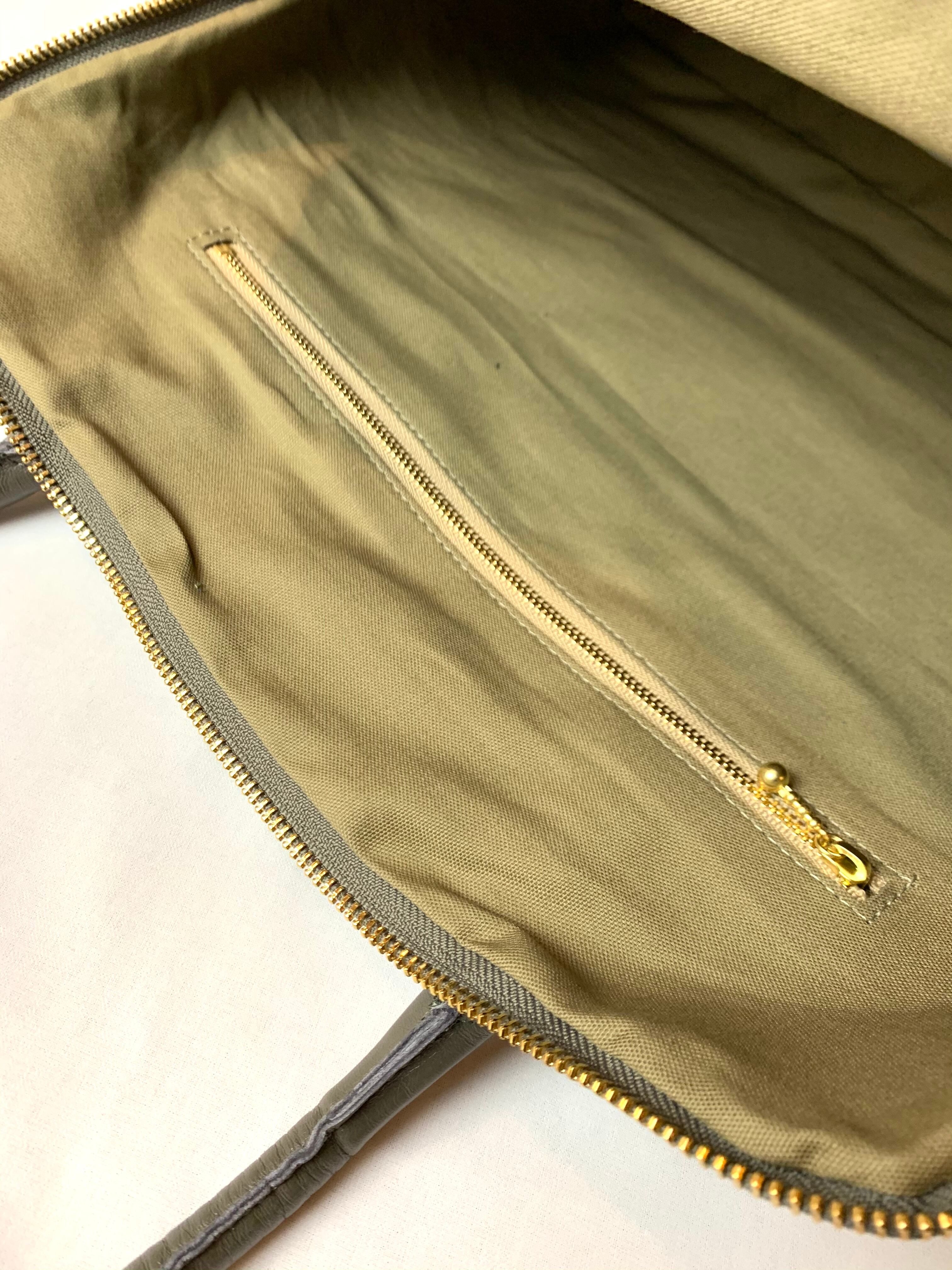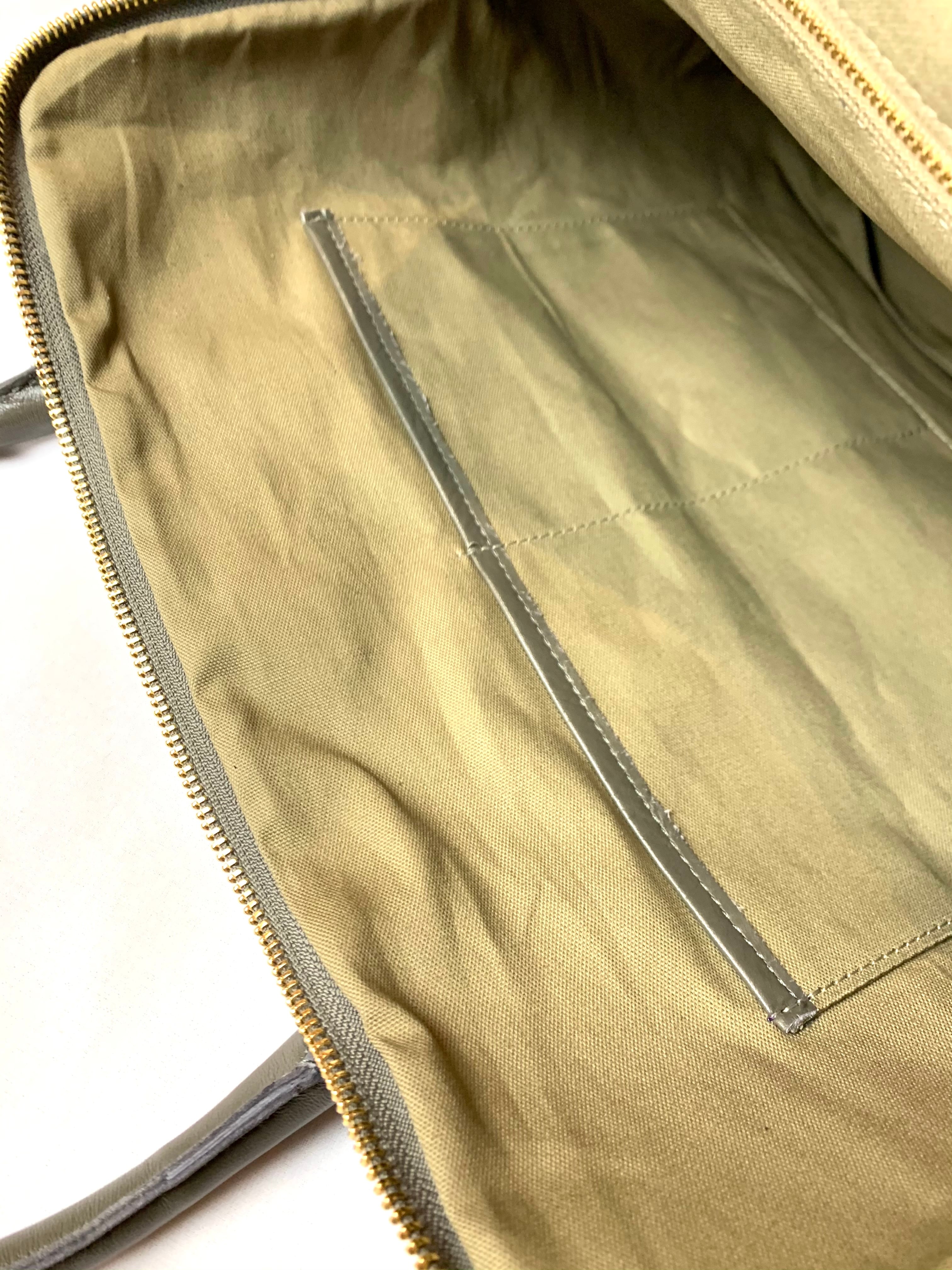 背中側にファスナーポケット、内側にオープンポケット2カ所、ファスナーポケットがございます。