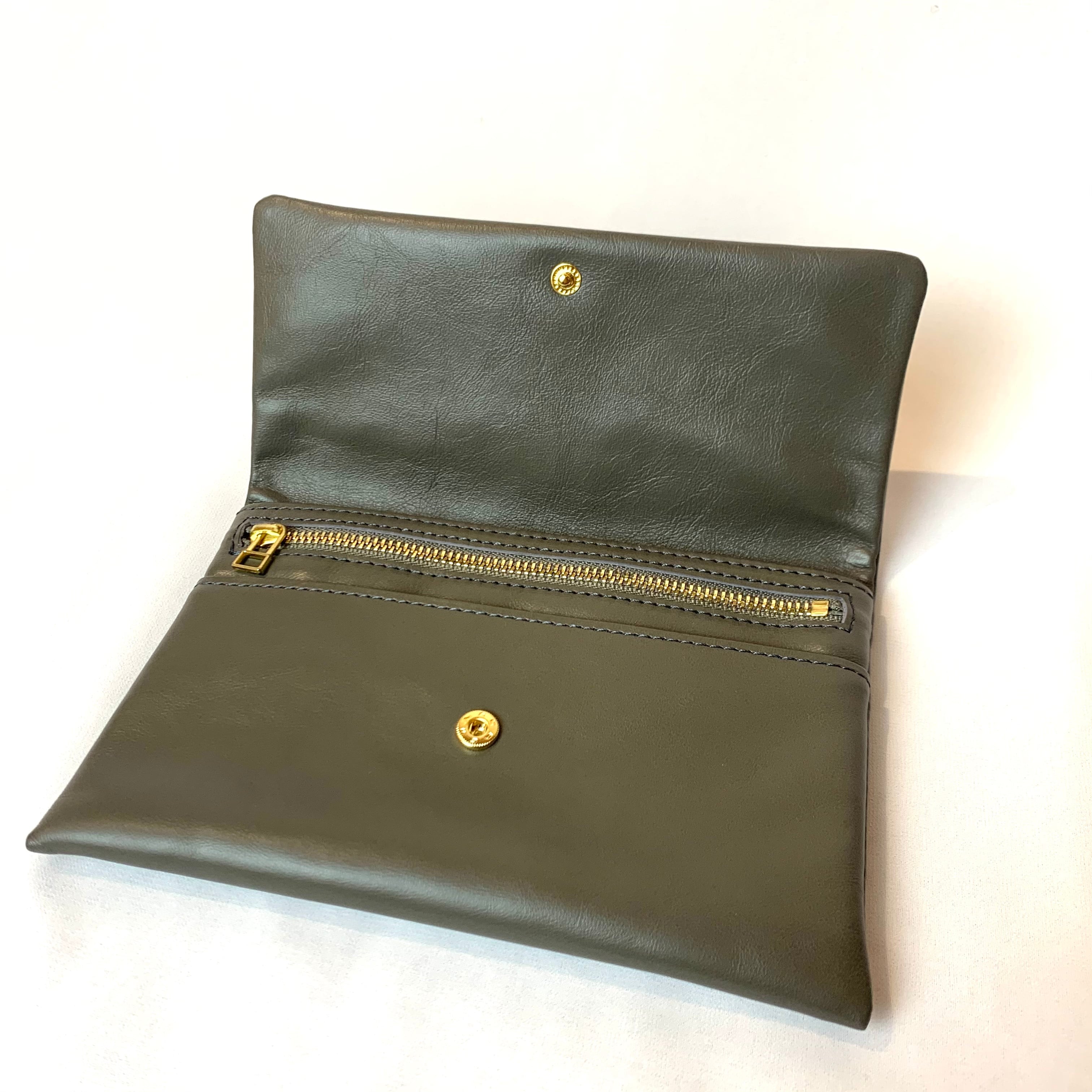 '"超軽量"にこだわったポーチのようなお財布。厚みが薄いだけではなく横幅も従来の長財布よりも1cmほど狭くすることで、入れることが難しかった小さなバッグにも対応しております。