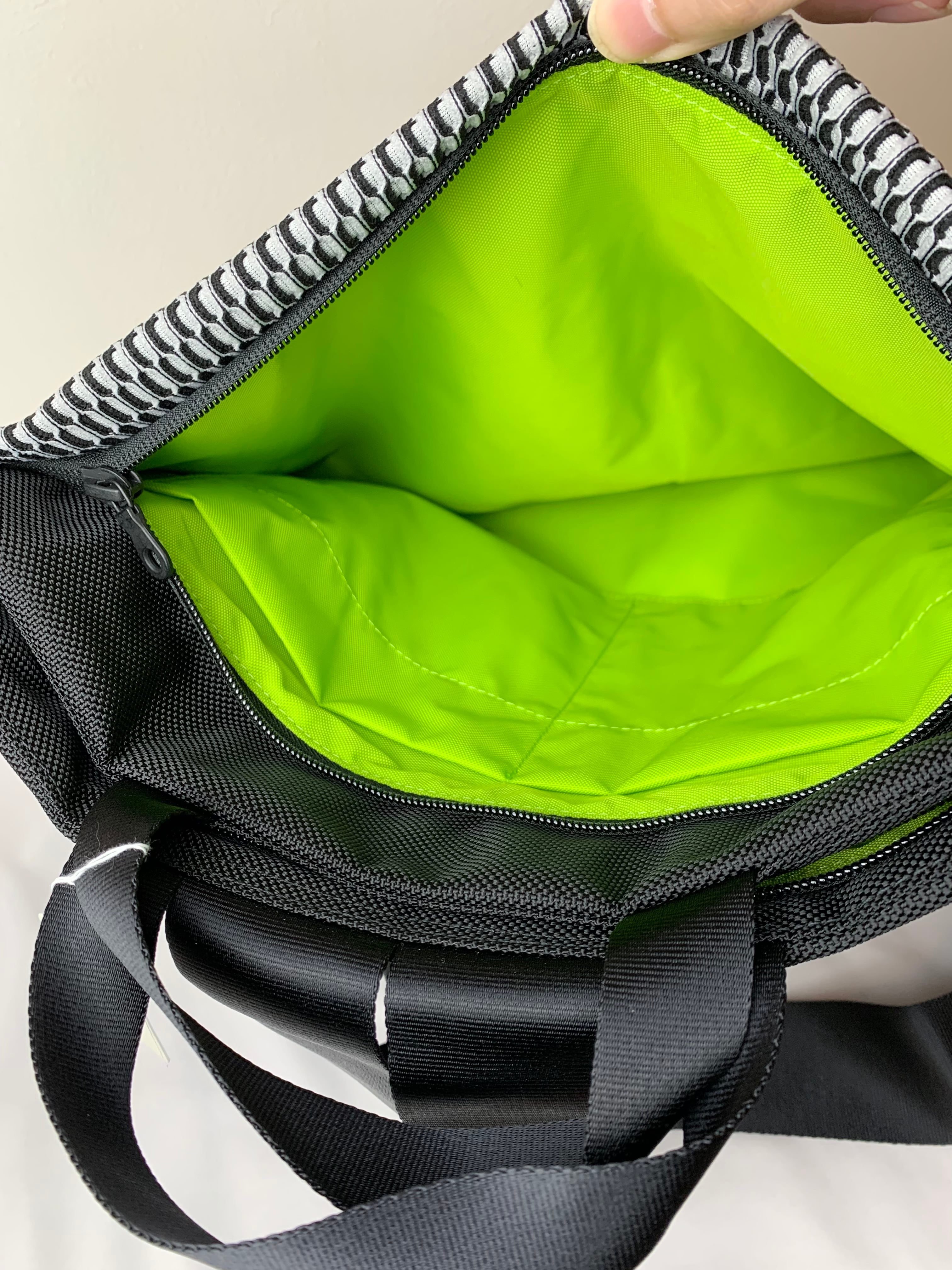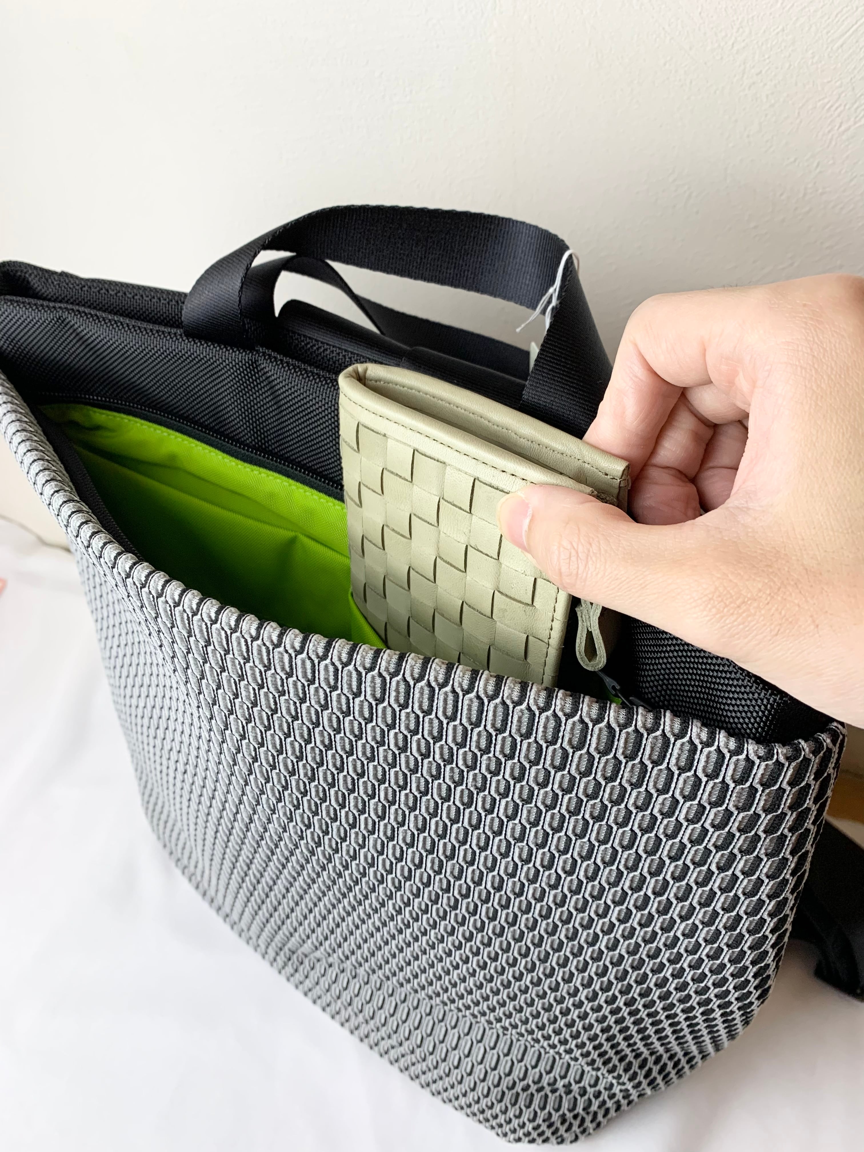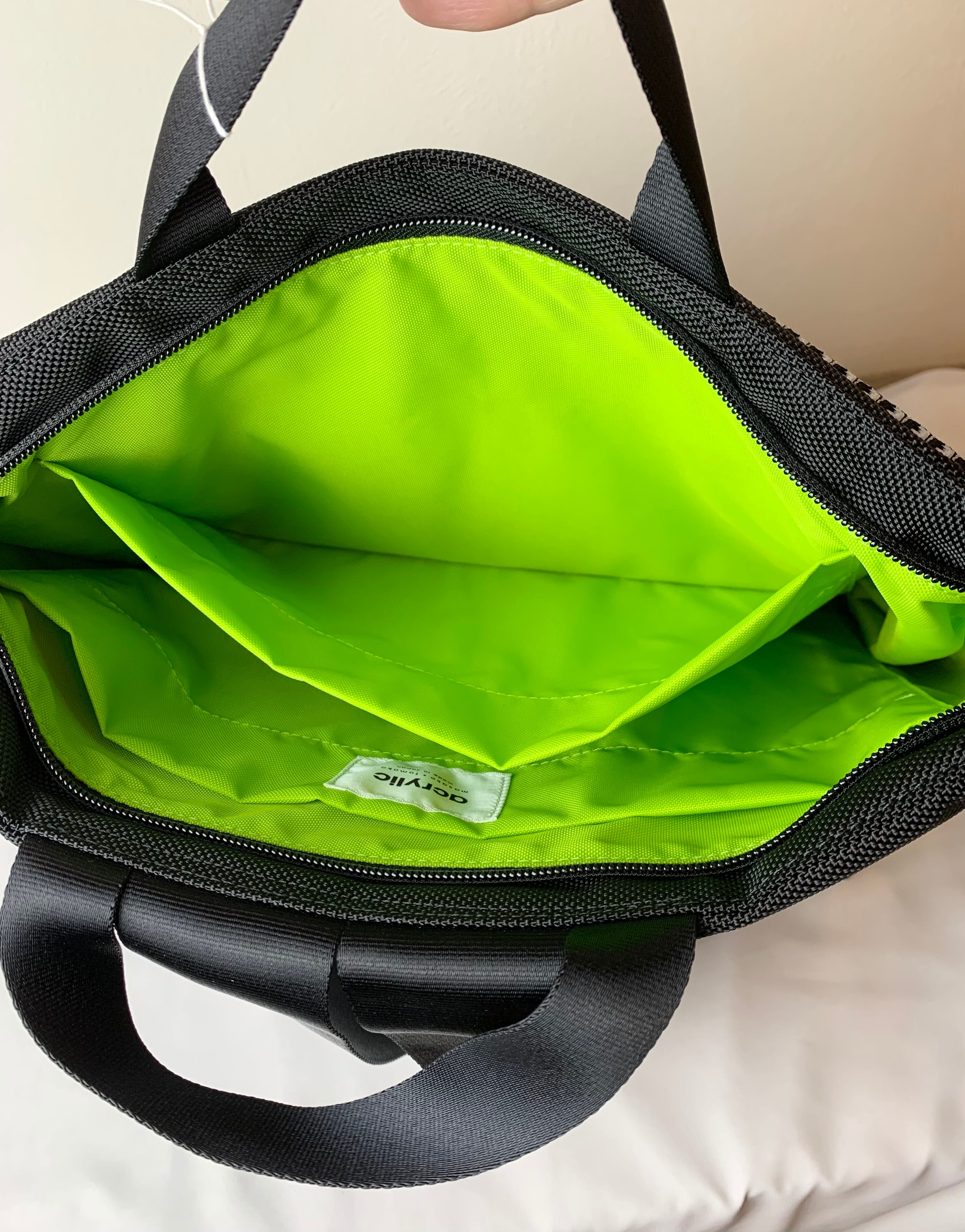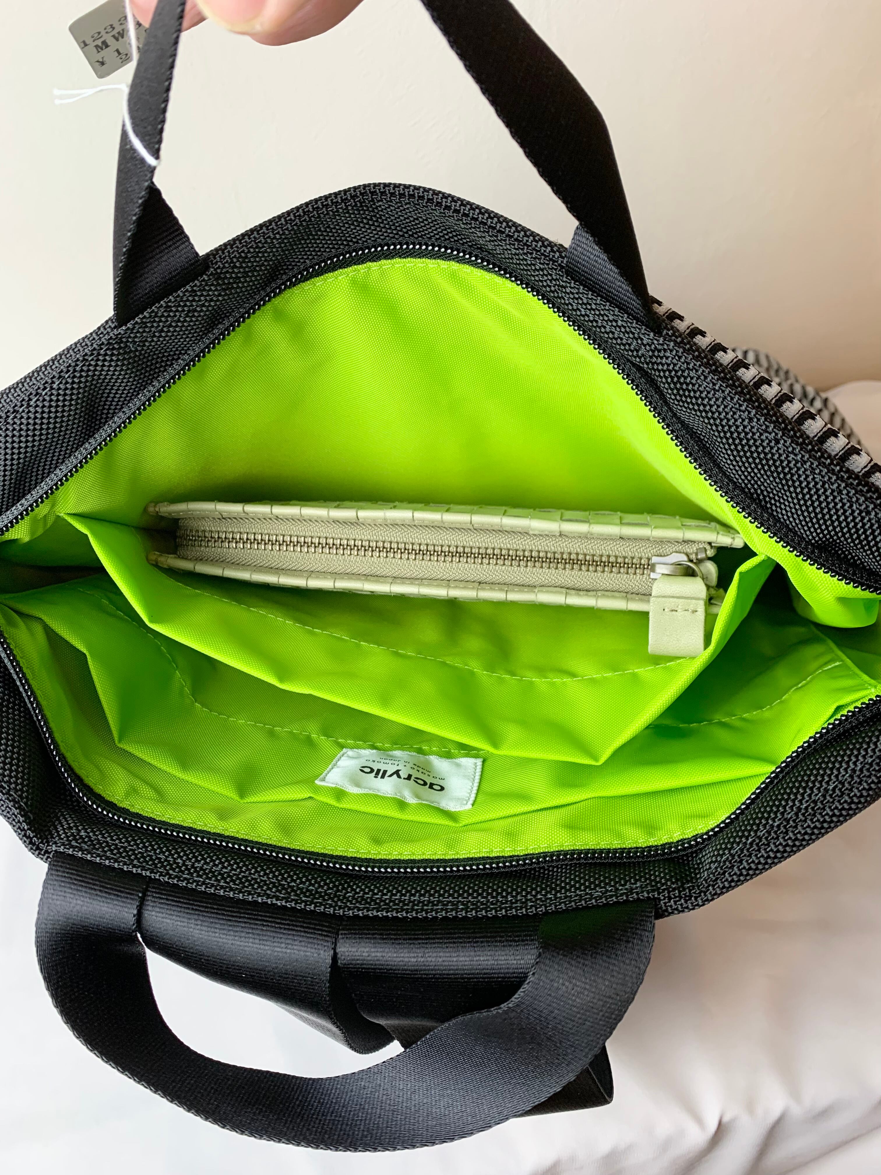裏地は明るいライムグリーンなので物が探しやすく、ポケットがたくさんついています。