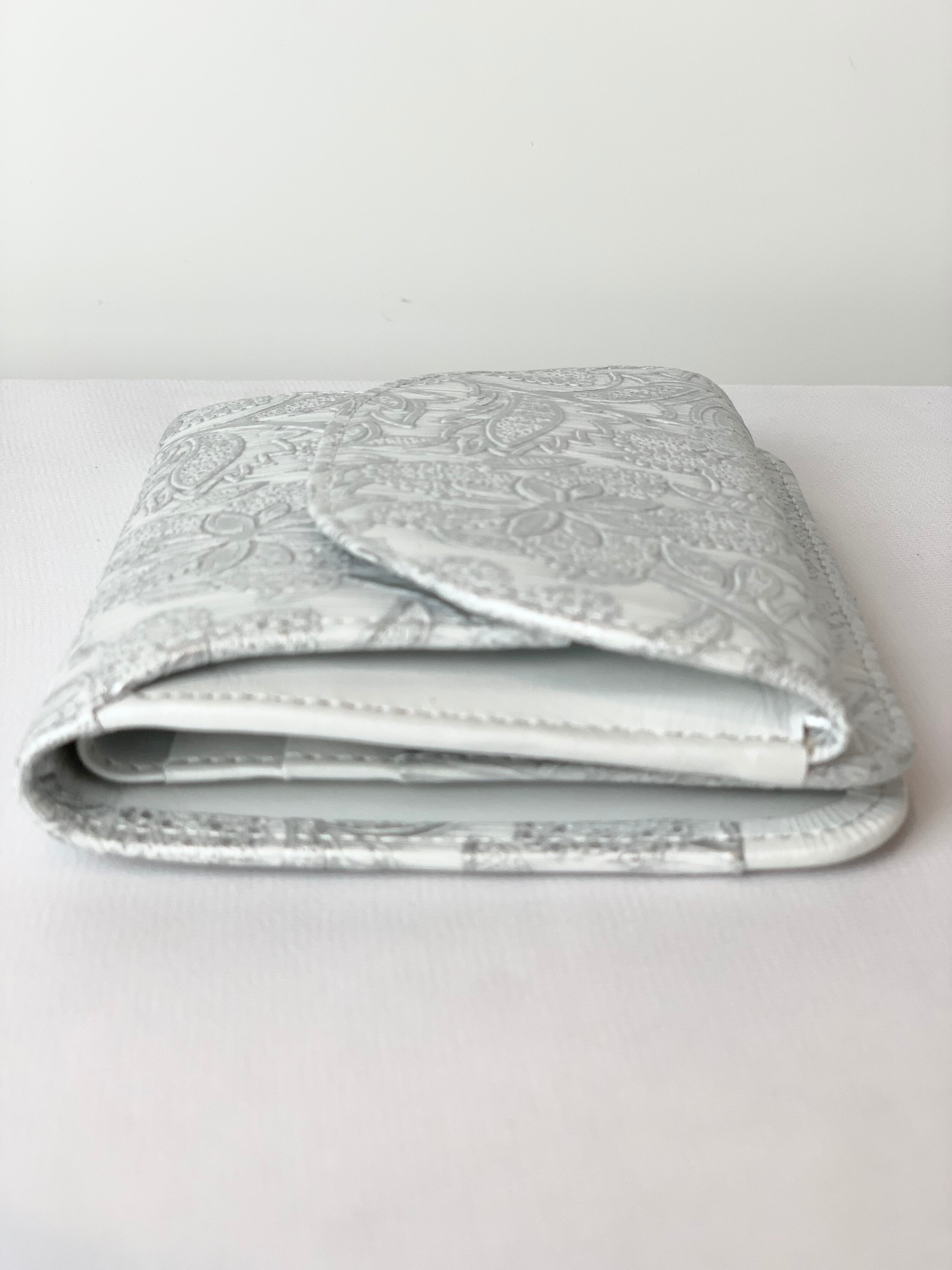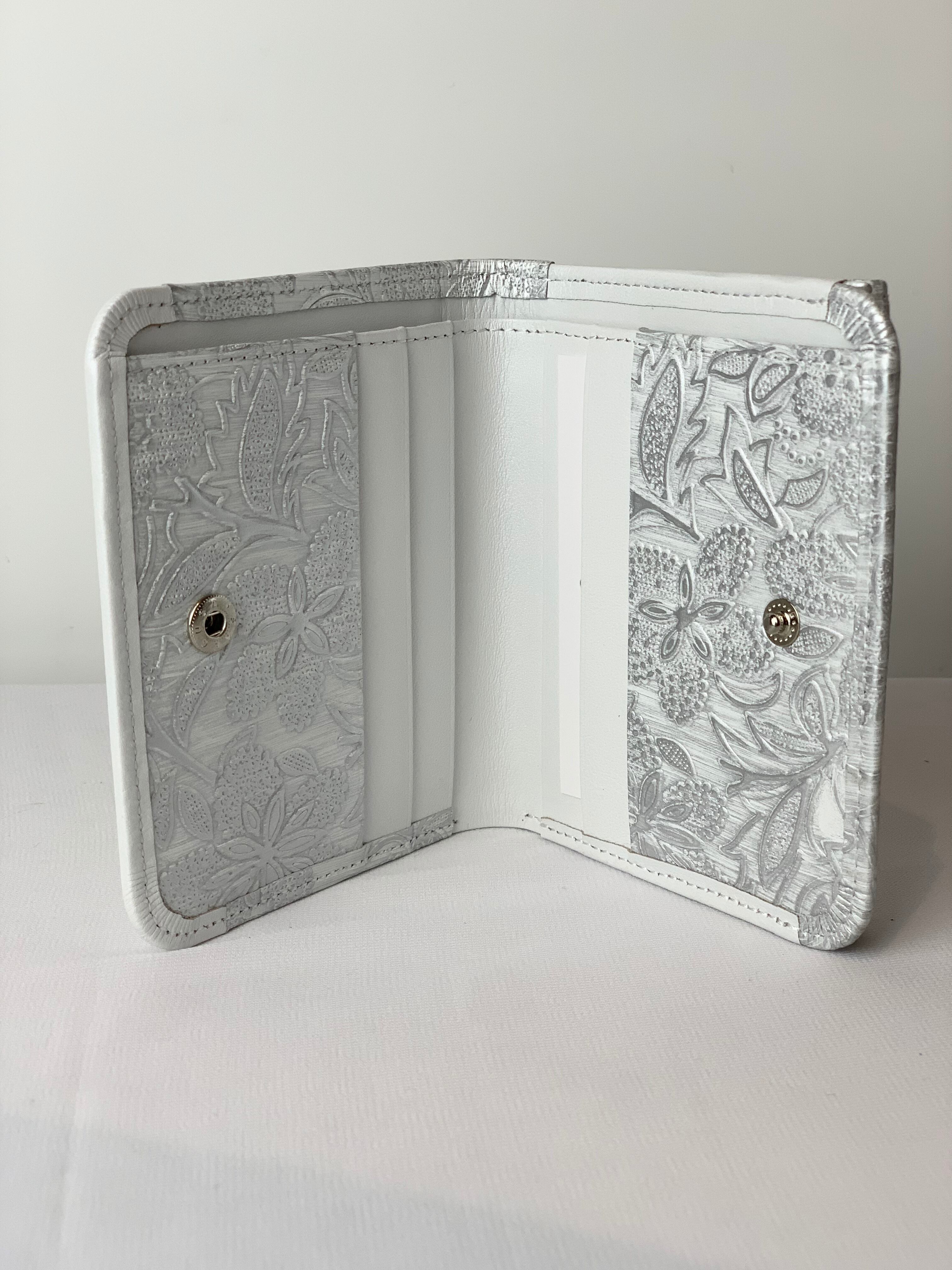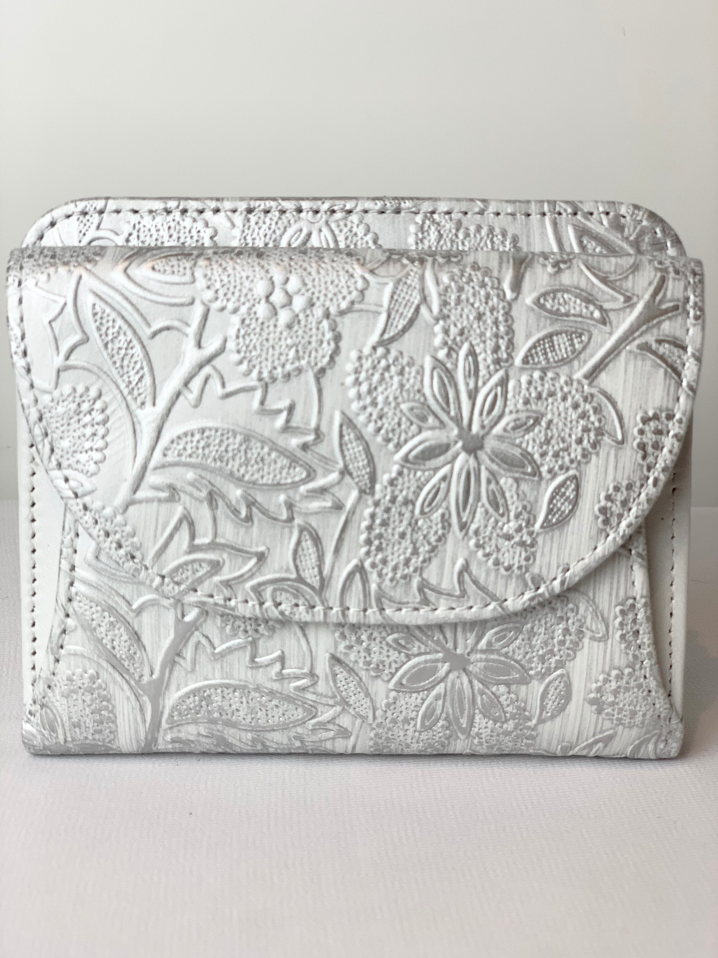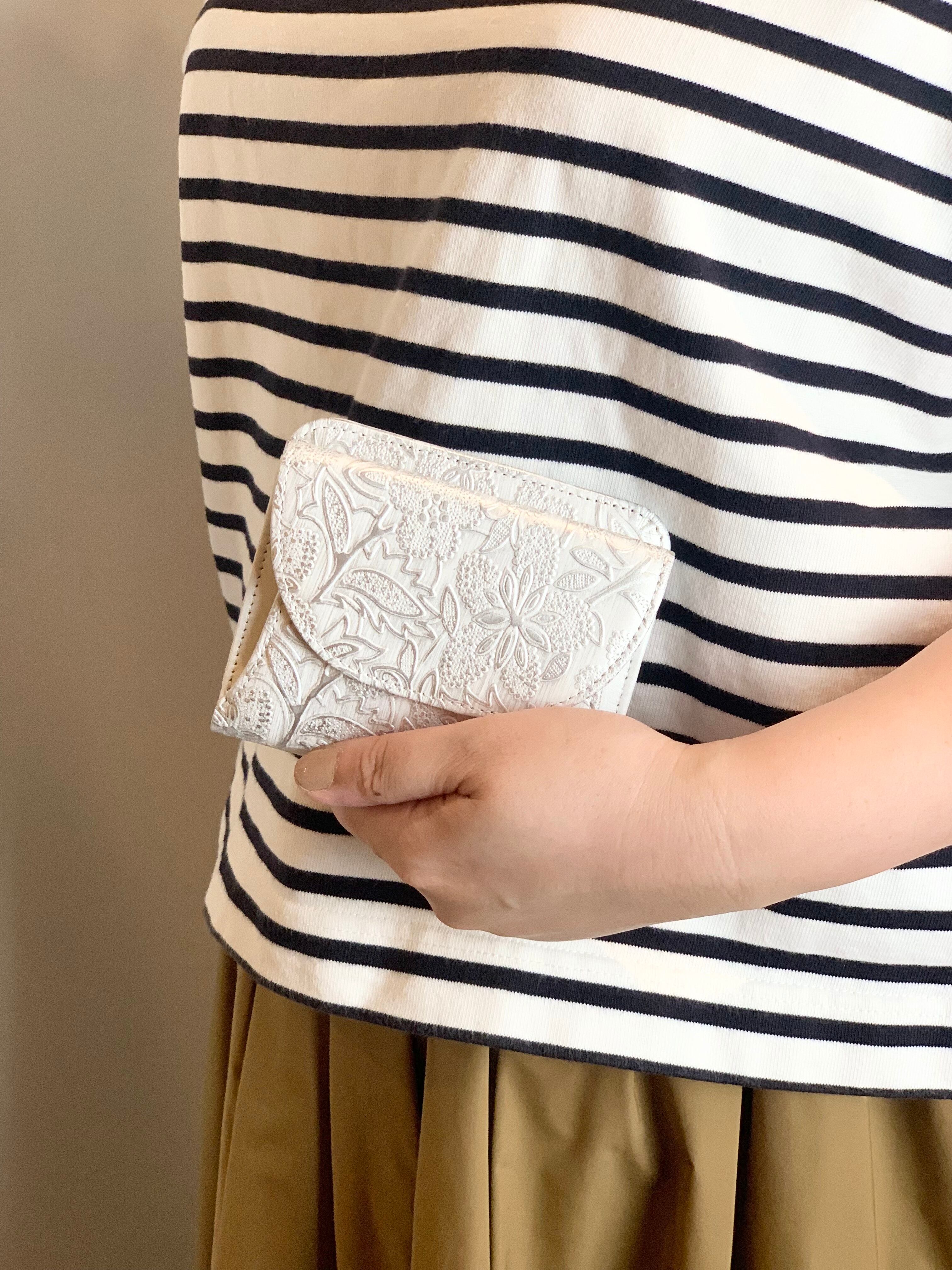 イタリアで丁寧にありがとう作られた型押しの革を使用。繊細でパールの輝きがある花柄が程よいアクセントに。