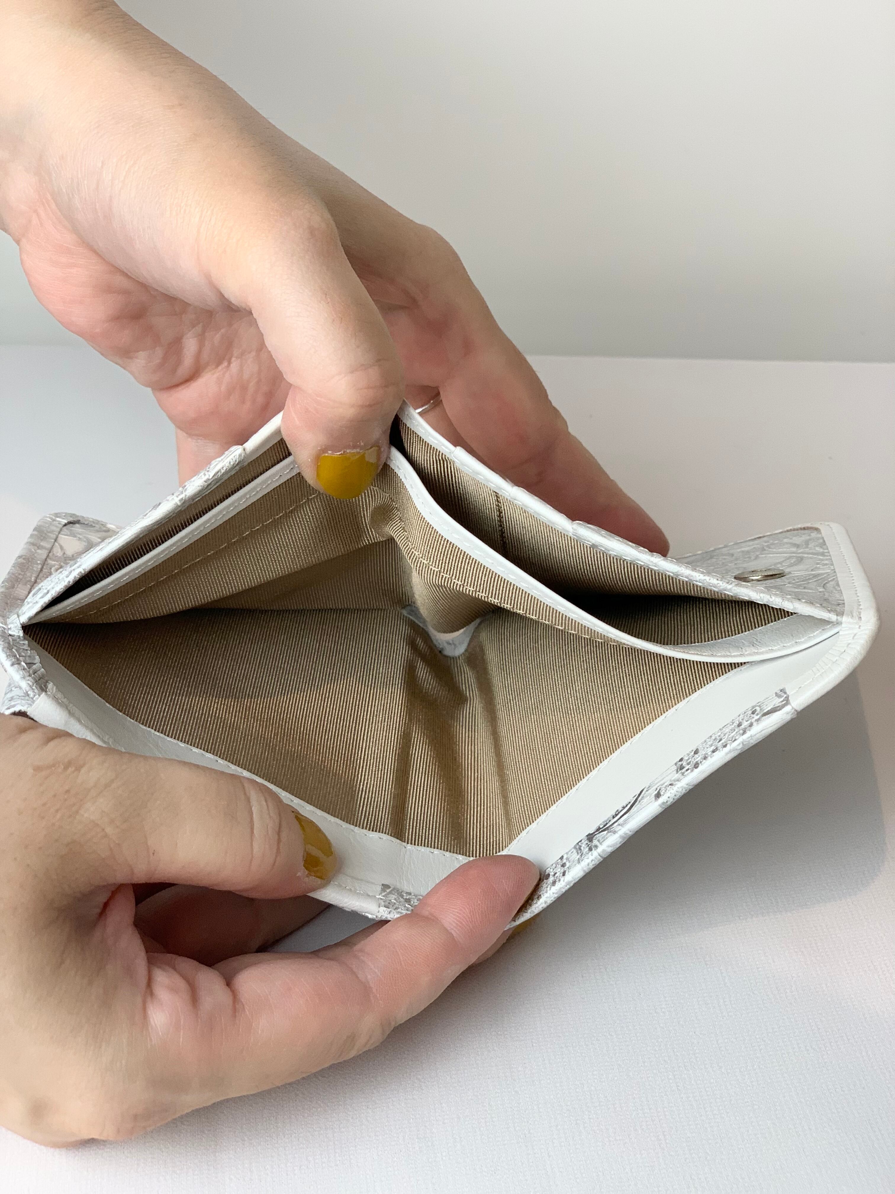 定番人気のボックスの小銭入れ付きの2つ折り財布。お札入れは2室になっており、分けて入れるのに便利。カードポケットは4枚収納可能。他にもカードなどを収納できるフリーポケットが4箇所ございます。ホック付きでしっかりと閉まります。