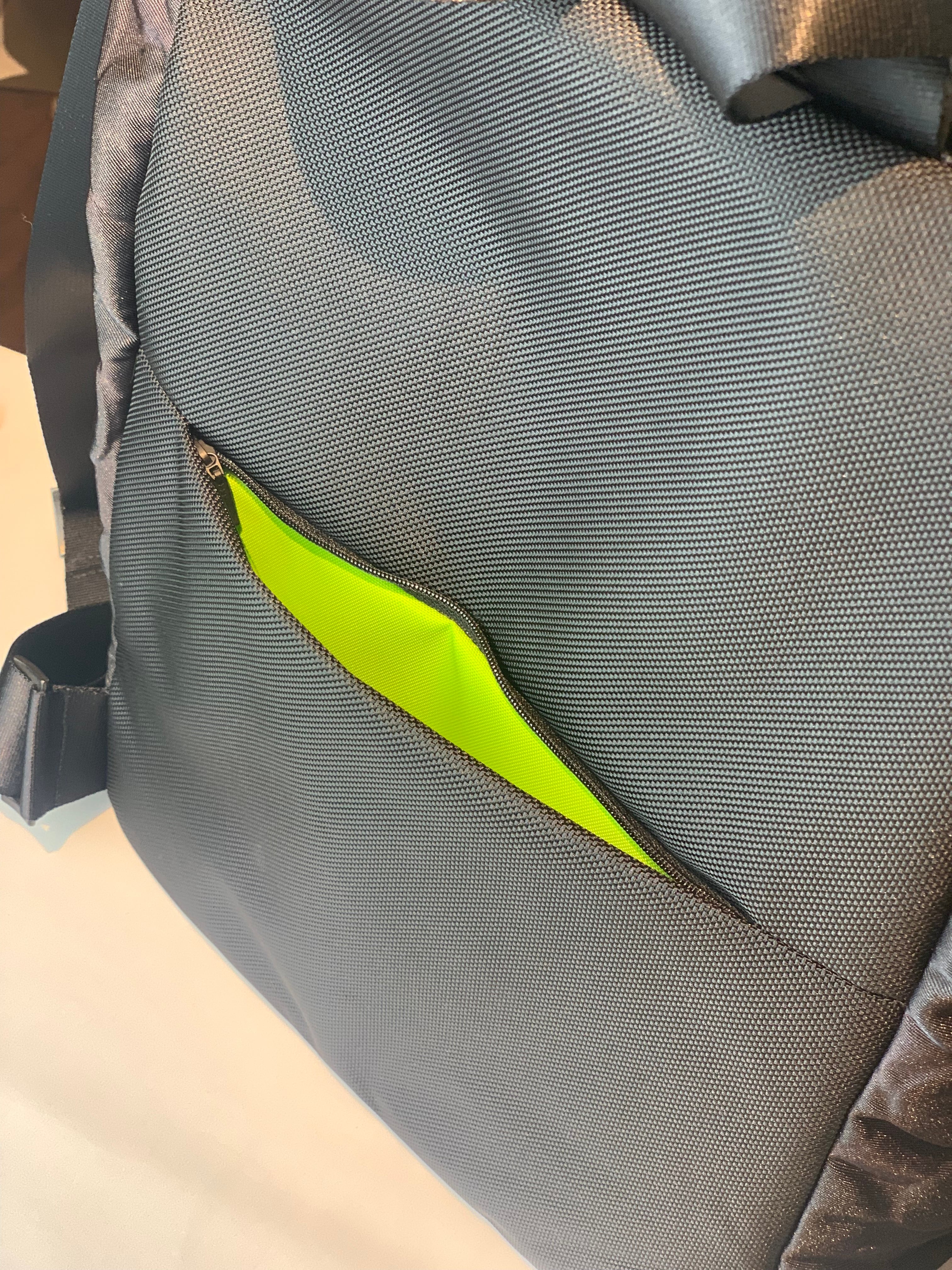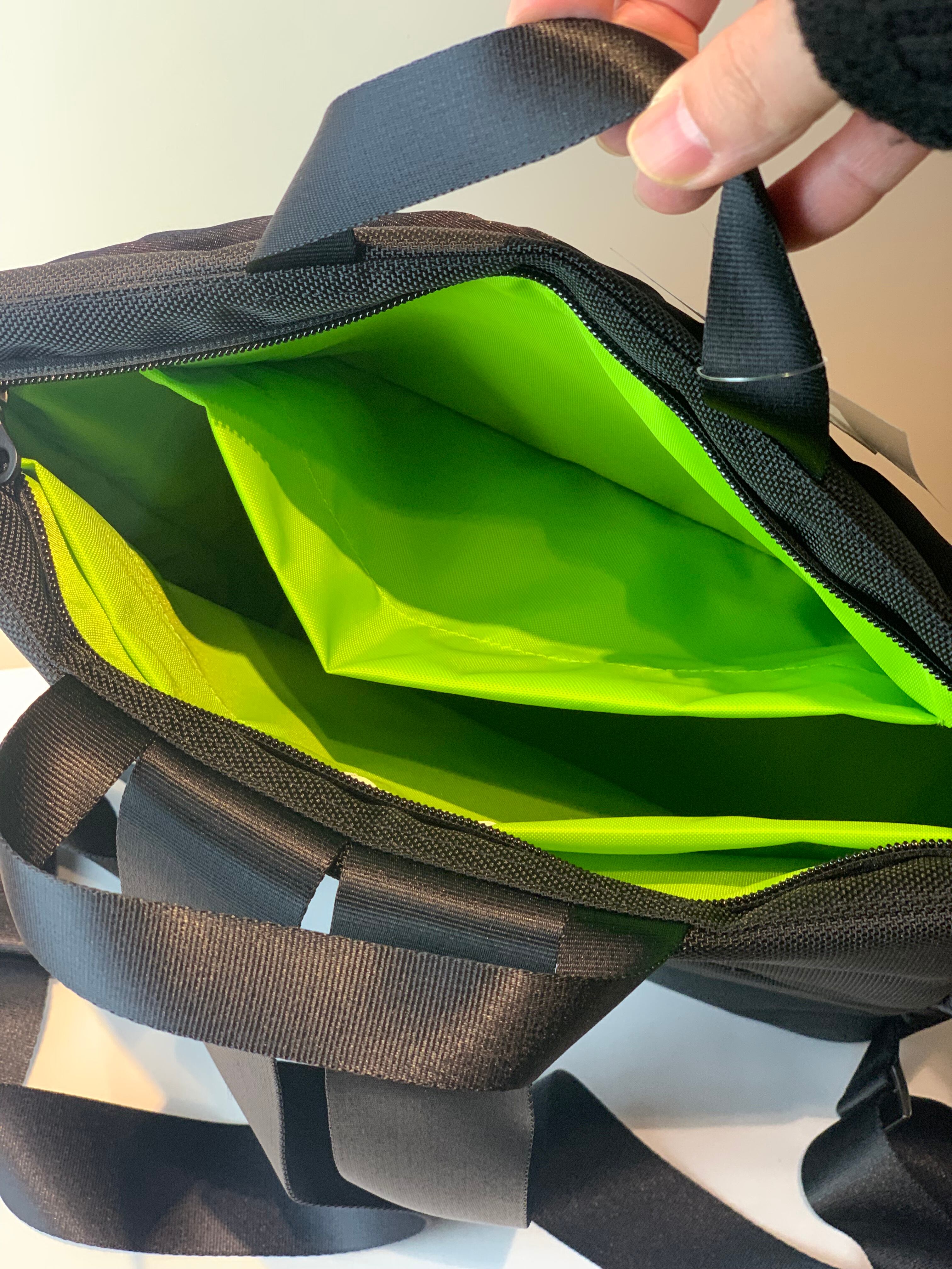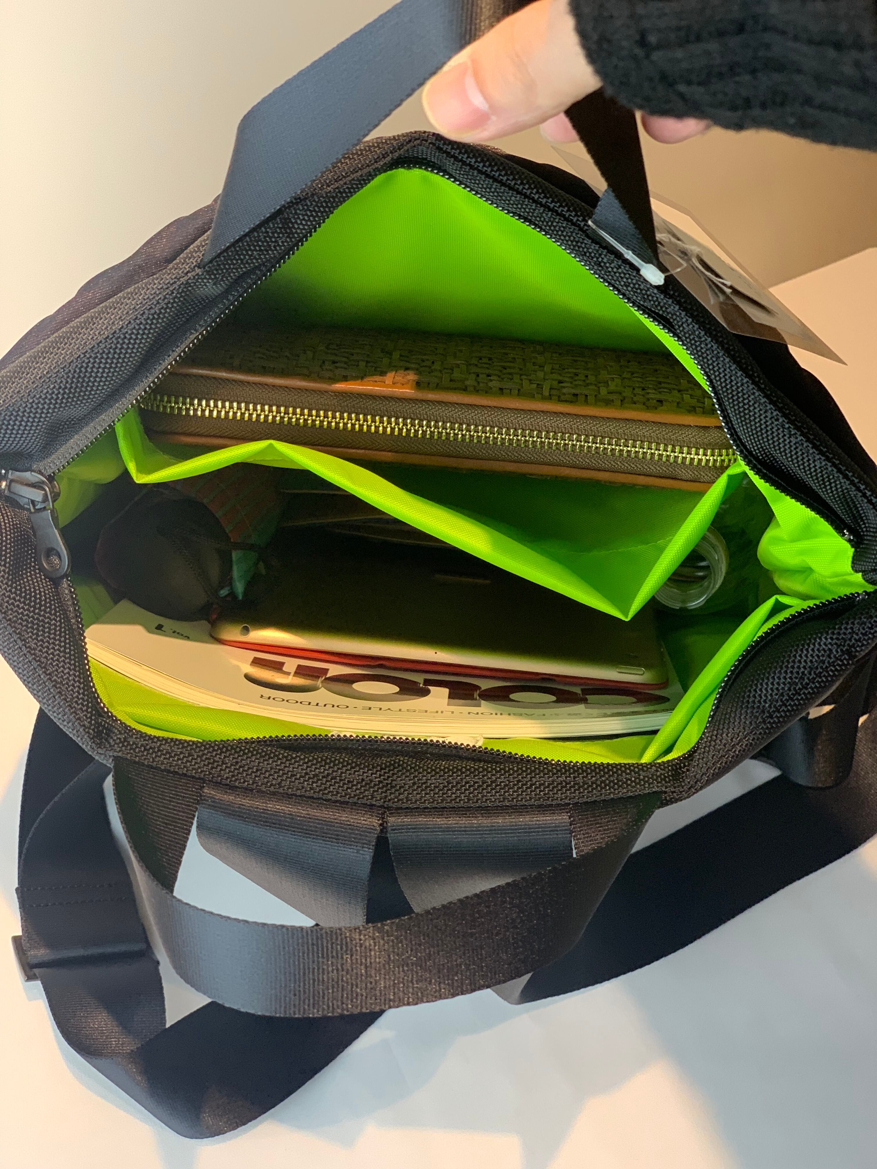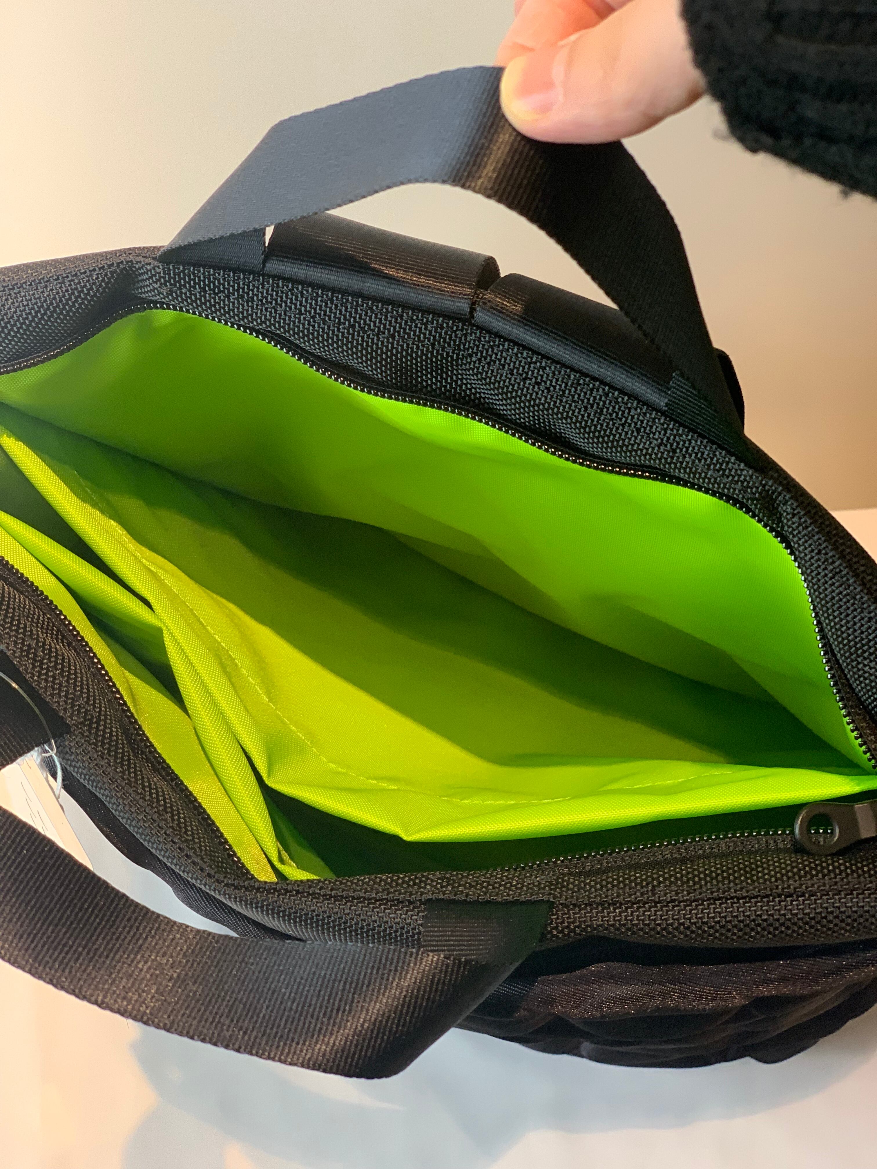 裏地は明るいライムグリーンなので物が探しやすく、ポケットがたくさんついています。