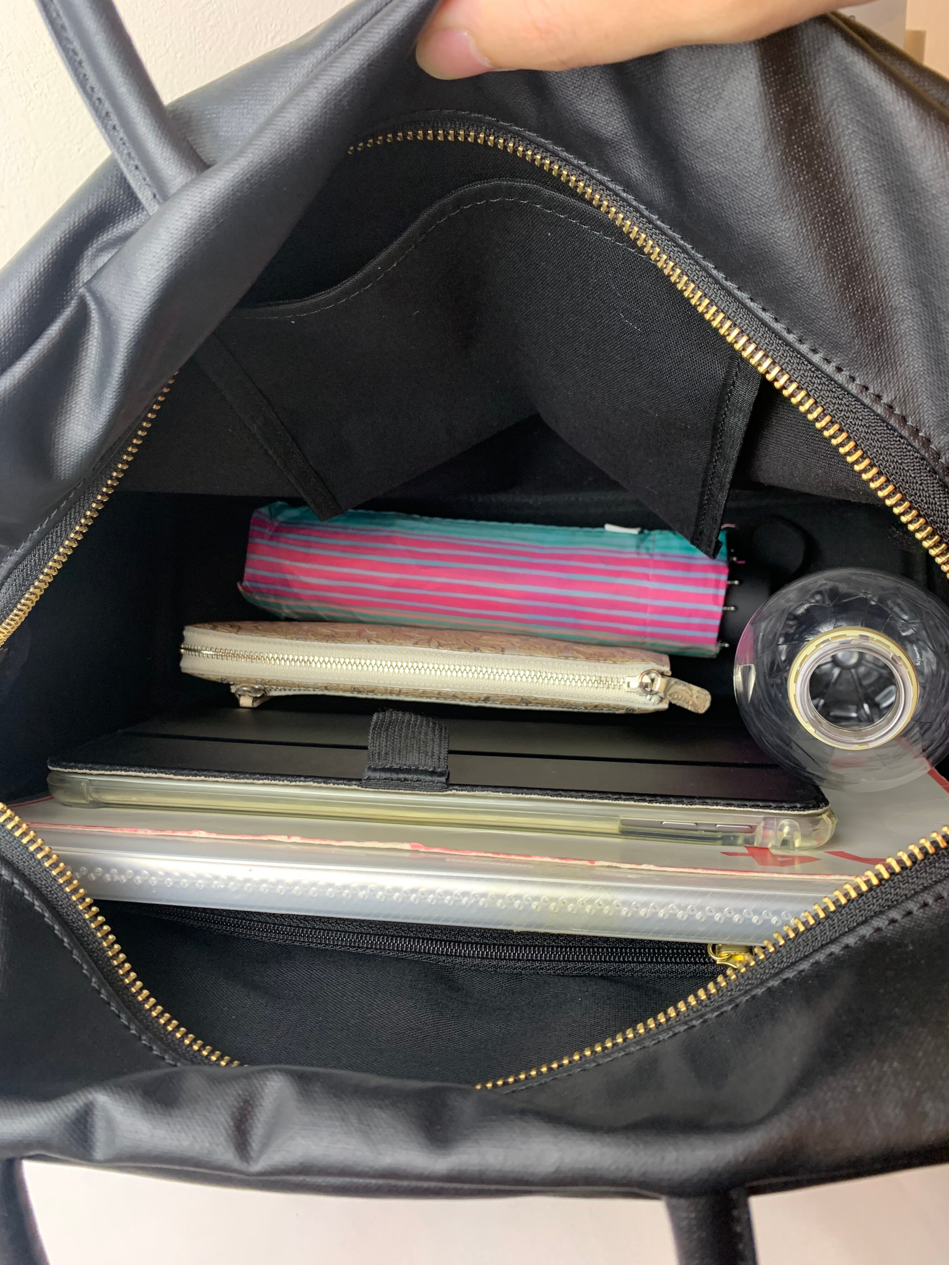 A4サイズの他に、長財布やペットボトル、折りたたみ傘、お弁当なども入る大容量なのに見た目はあまり大きく見えず、すっきりコンパクトなデザインに仕上がっております。