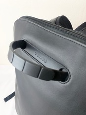 リュックを置く場所がなく立ったまま開ける際は、スライド式ハンドルをご利用下さい。使用しない際は収納でき、スマートな見た目を崩しません。素材はTPEE(ウレタン樹脂)を使用し、「レザー×異素材」のハイブリッドなデザインがアクセントにもなります。スライドさせると中からブランドロゴが顔を出します。