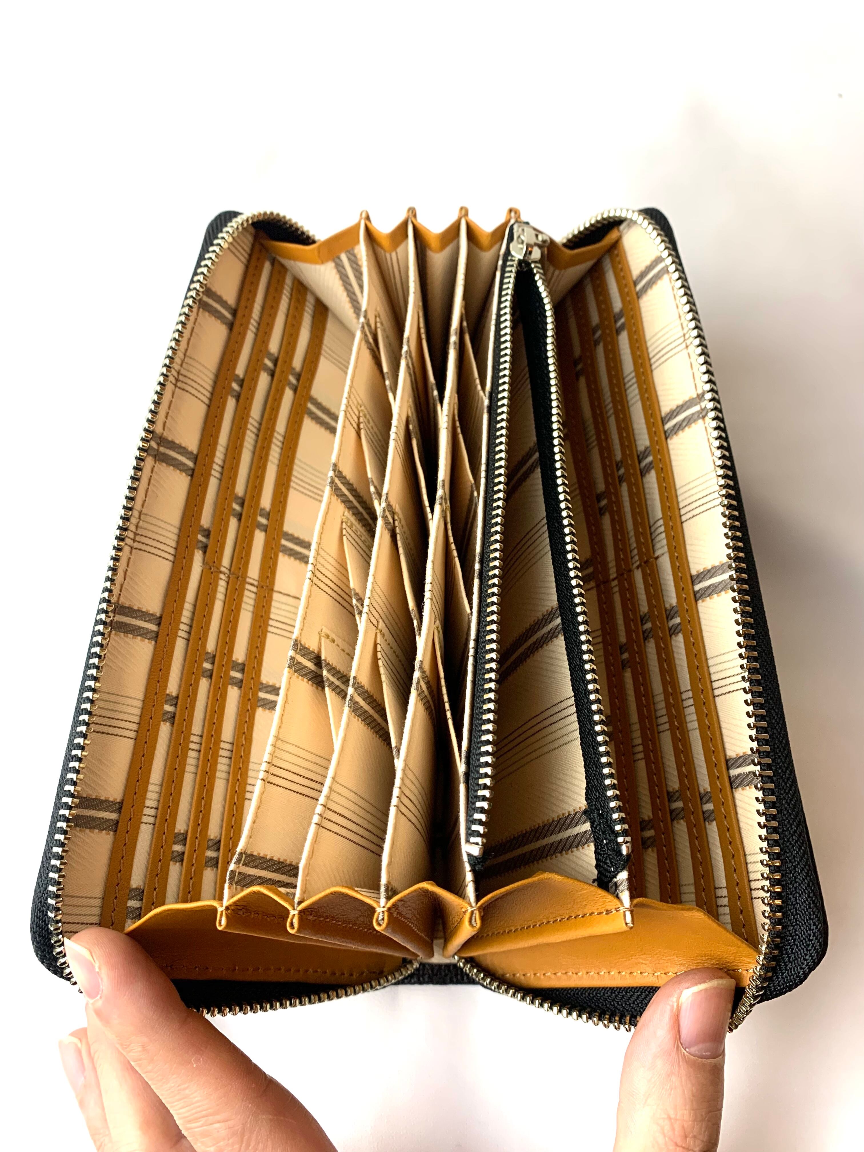 小銭入れの横にカードポケットを縦に付け、小さなスペースに15枚収納できるようにしております。両端に6枚ずつ計27枚収納可能です。その他にもフリーポケットが2ヶ所ございます。ユニセックスでお使いいただけます。