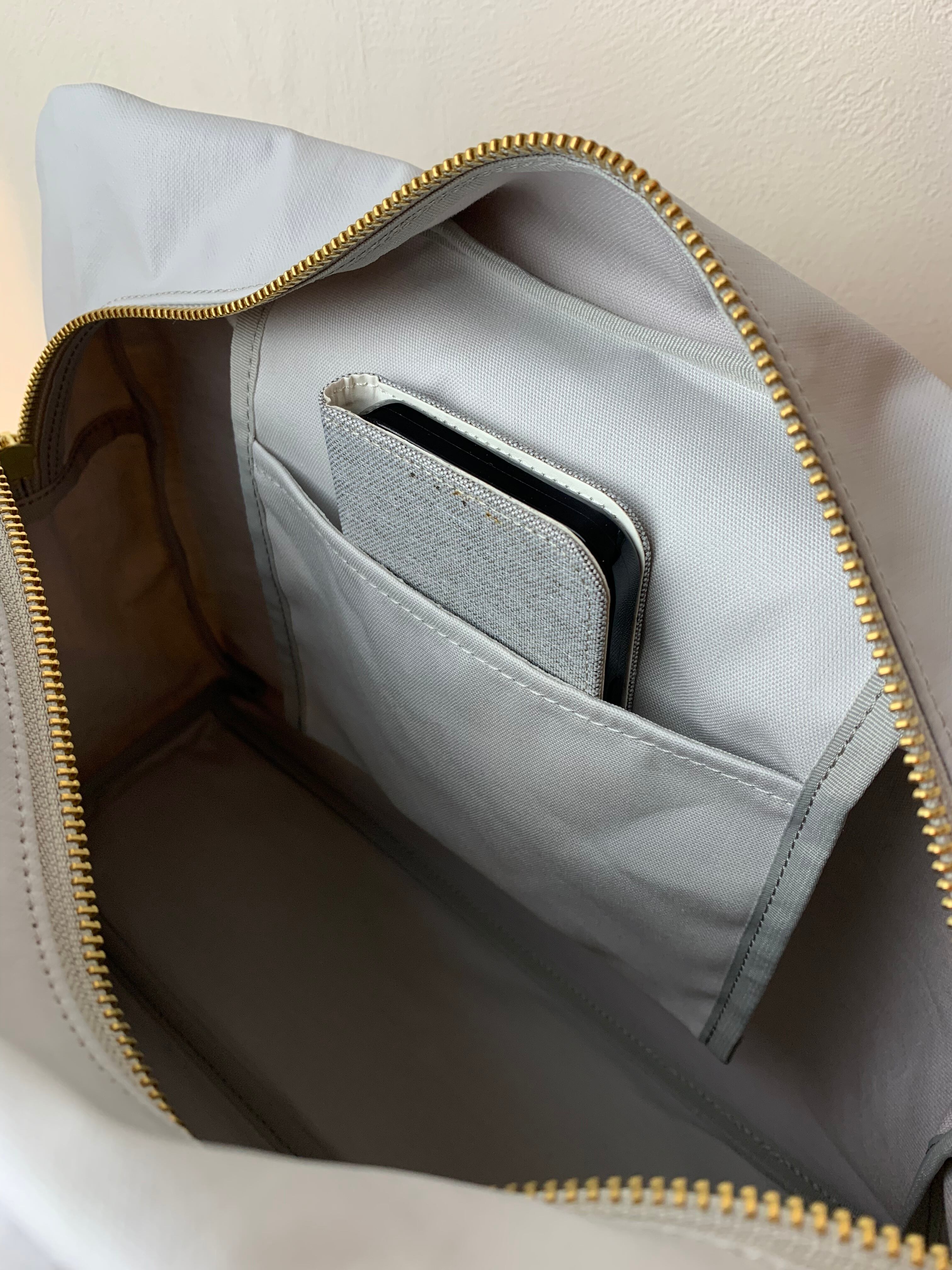 内側にはオープンポケットが1つ、ファスナーポケットが1つ。どちらもスマートフォンが収納できます。