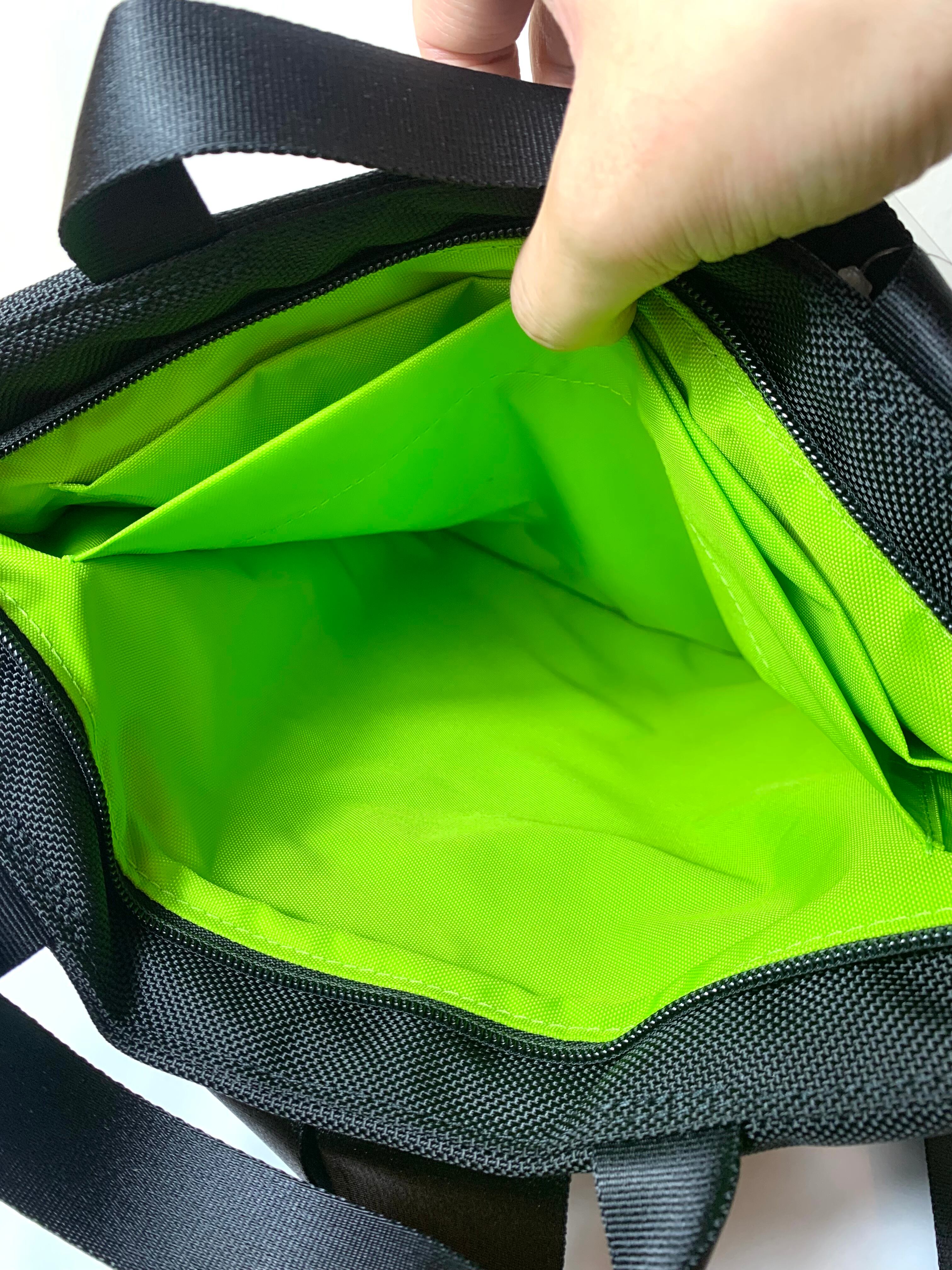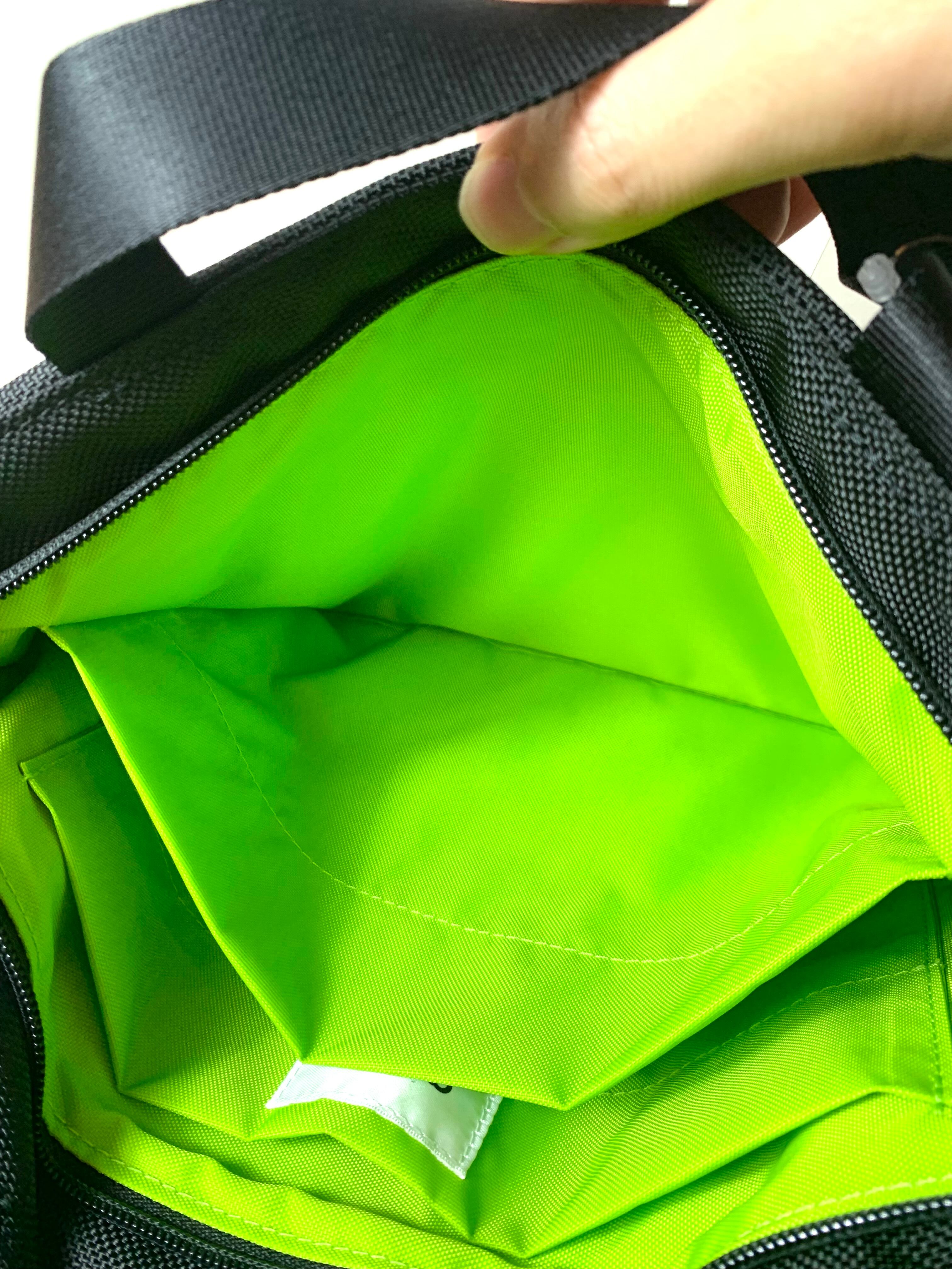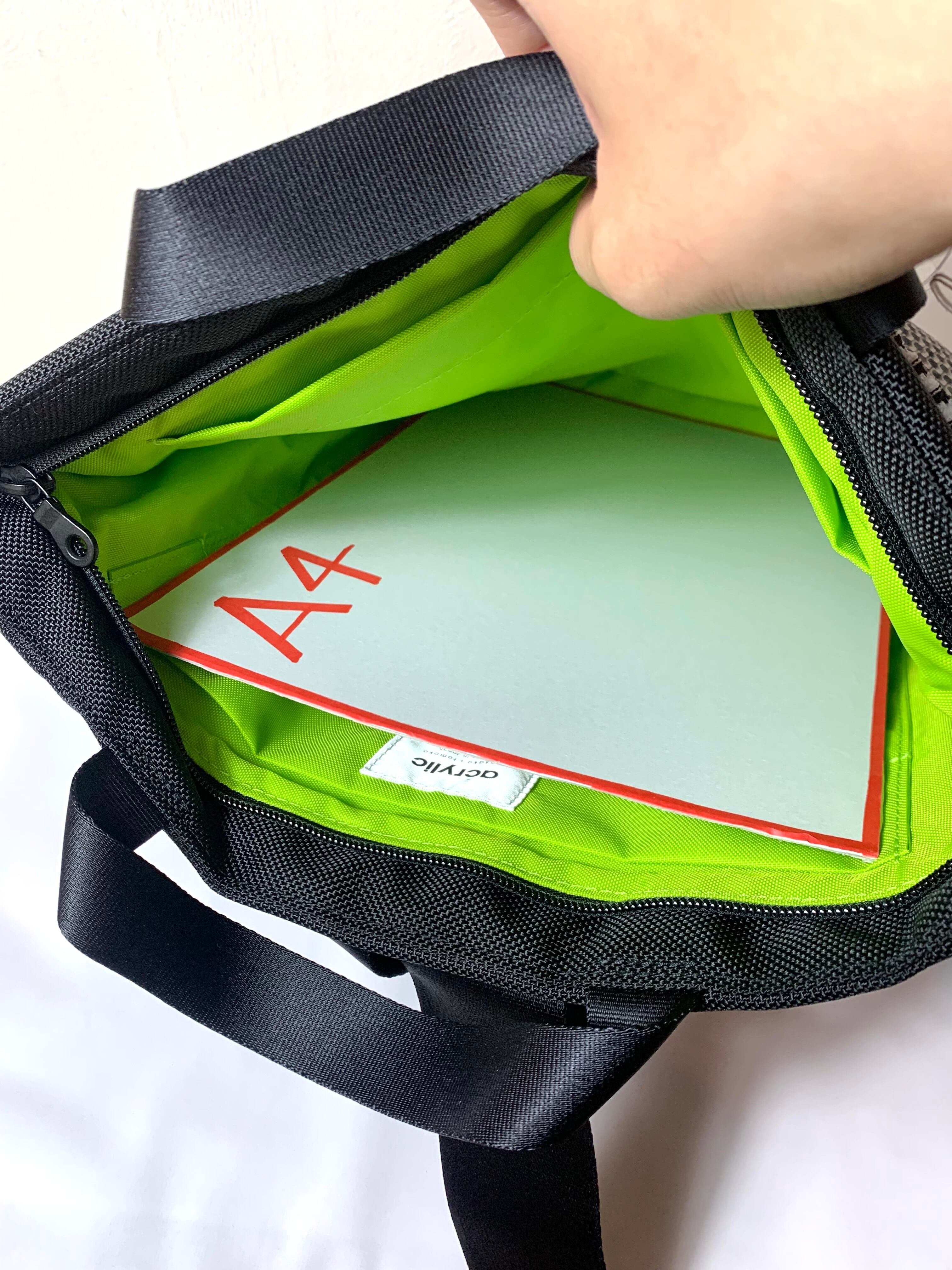 裏地は明るいライムグリーンなので物が探しやすく、ポケットがたくさんついています。