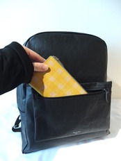表側にはポーチ型ポケットを配置。デザイン性がありつつ、収納力があり、お財布など大きなサイズのものを収納できます。背中ポケットは開けやすいよう少し斜めに配置。スマートフォンやコンパクト財布など収納できます。