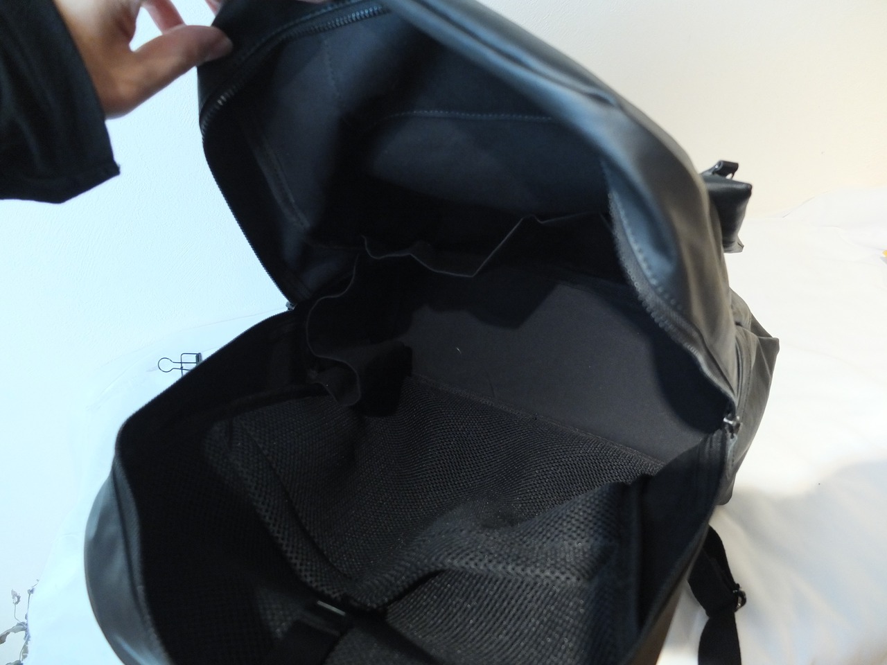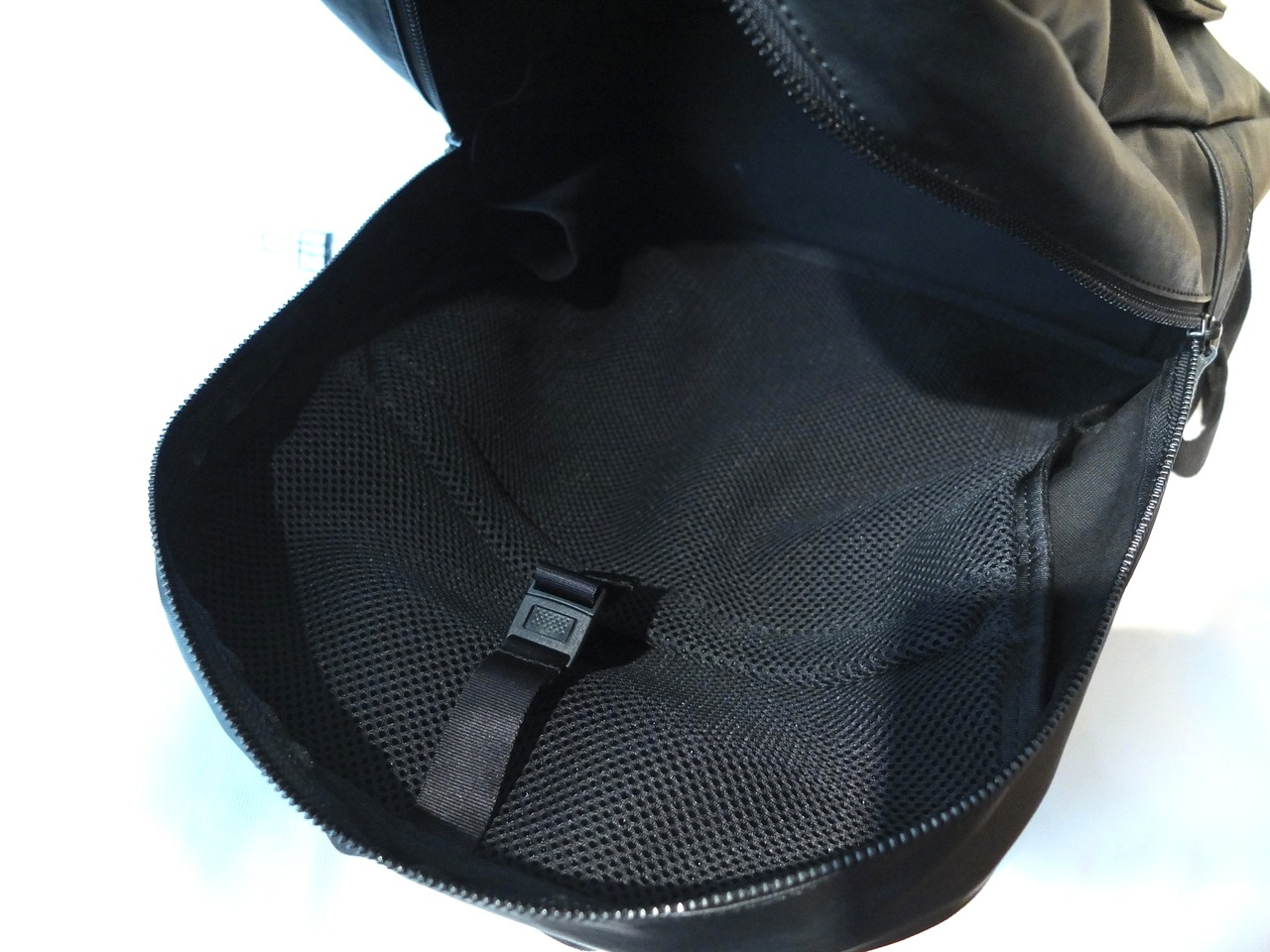 内装は背面にクッション性のあるラッセル素材の仕切りがあり、14インチのノートパソコンが収納できます。ベルトでしっかりと固定ができます。