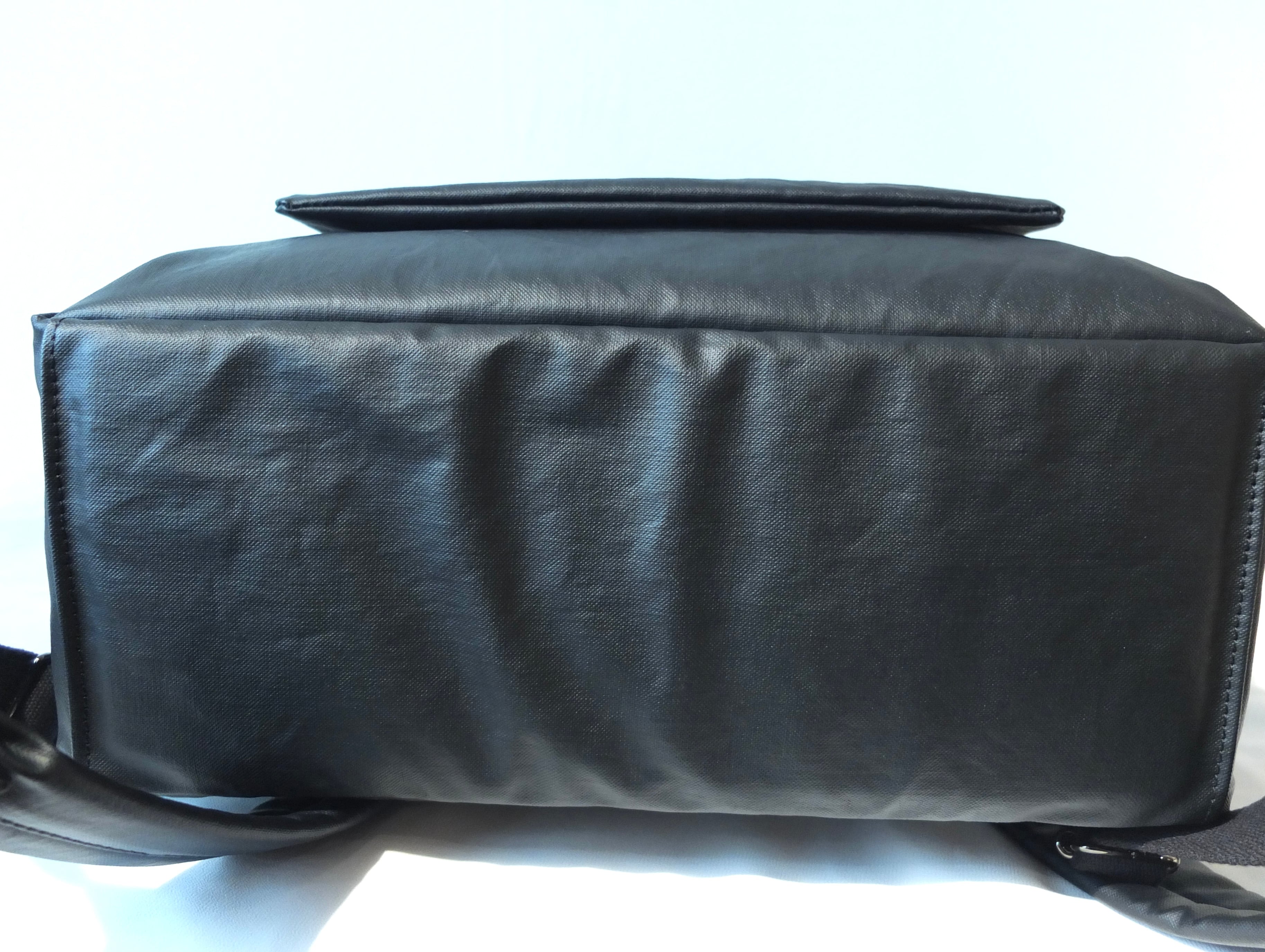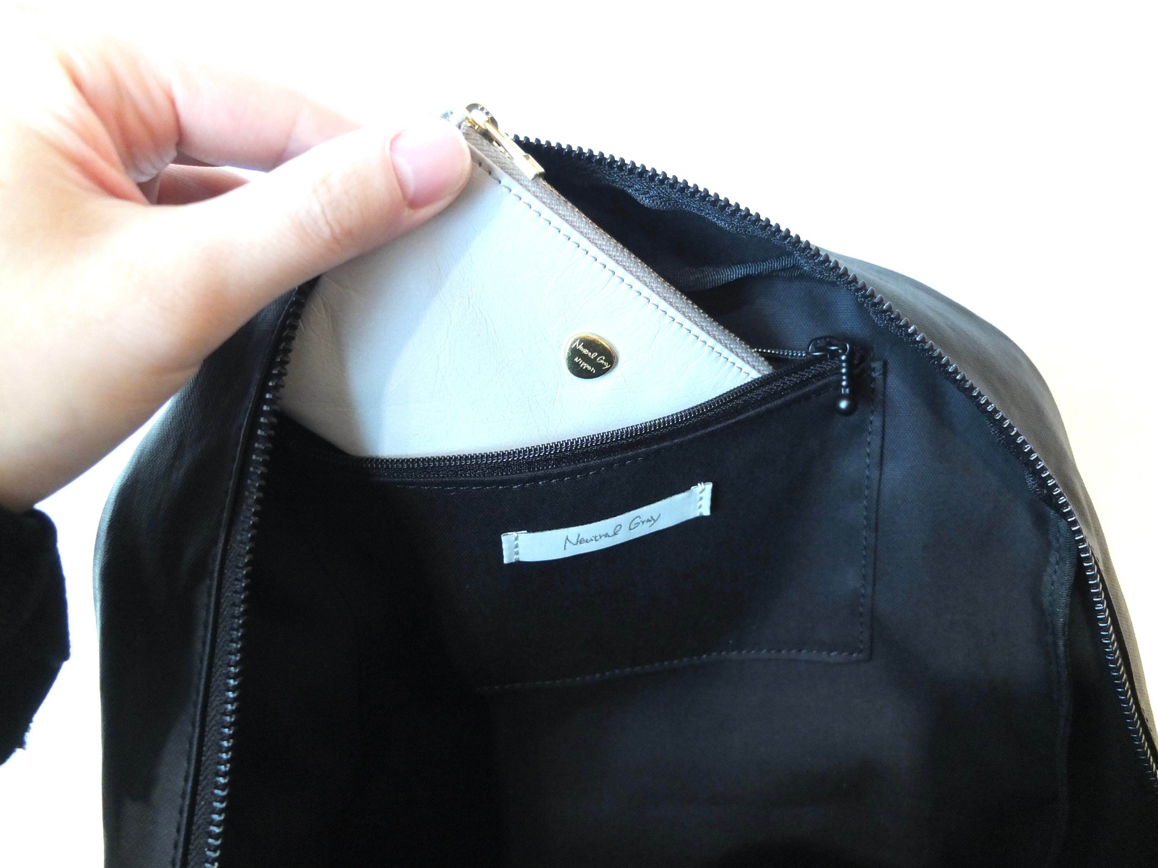 前面にはコインケースなど入れるのにちょうど良いファスナーポケット、長財布など収納できるオープンポケット×2がございます。サイドにはペットボトルなどを収納できるスリーブがございます。底部分には厚めのクッションを敷き、全体を支えております。